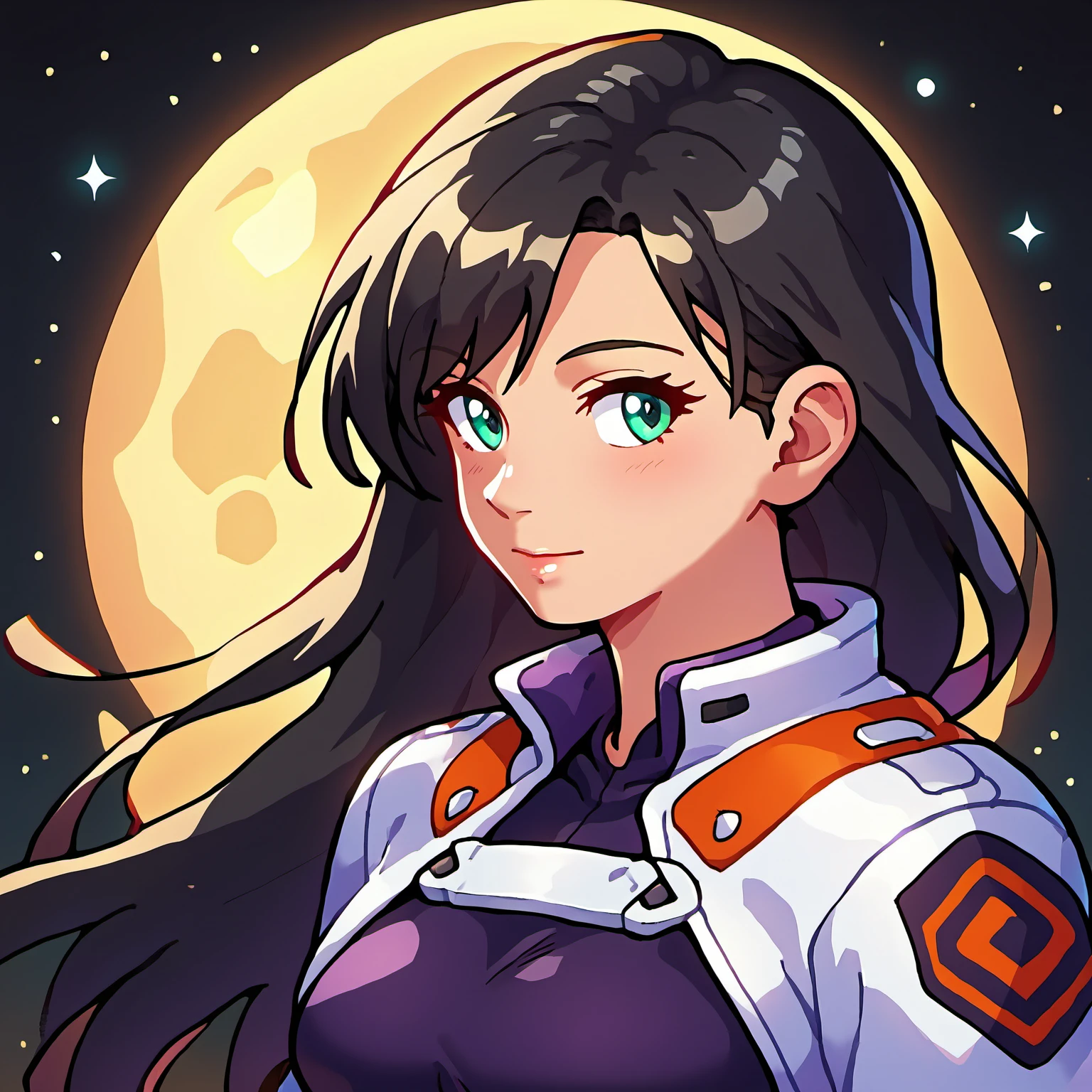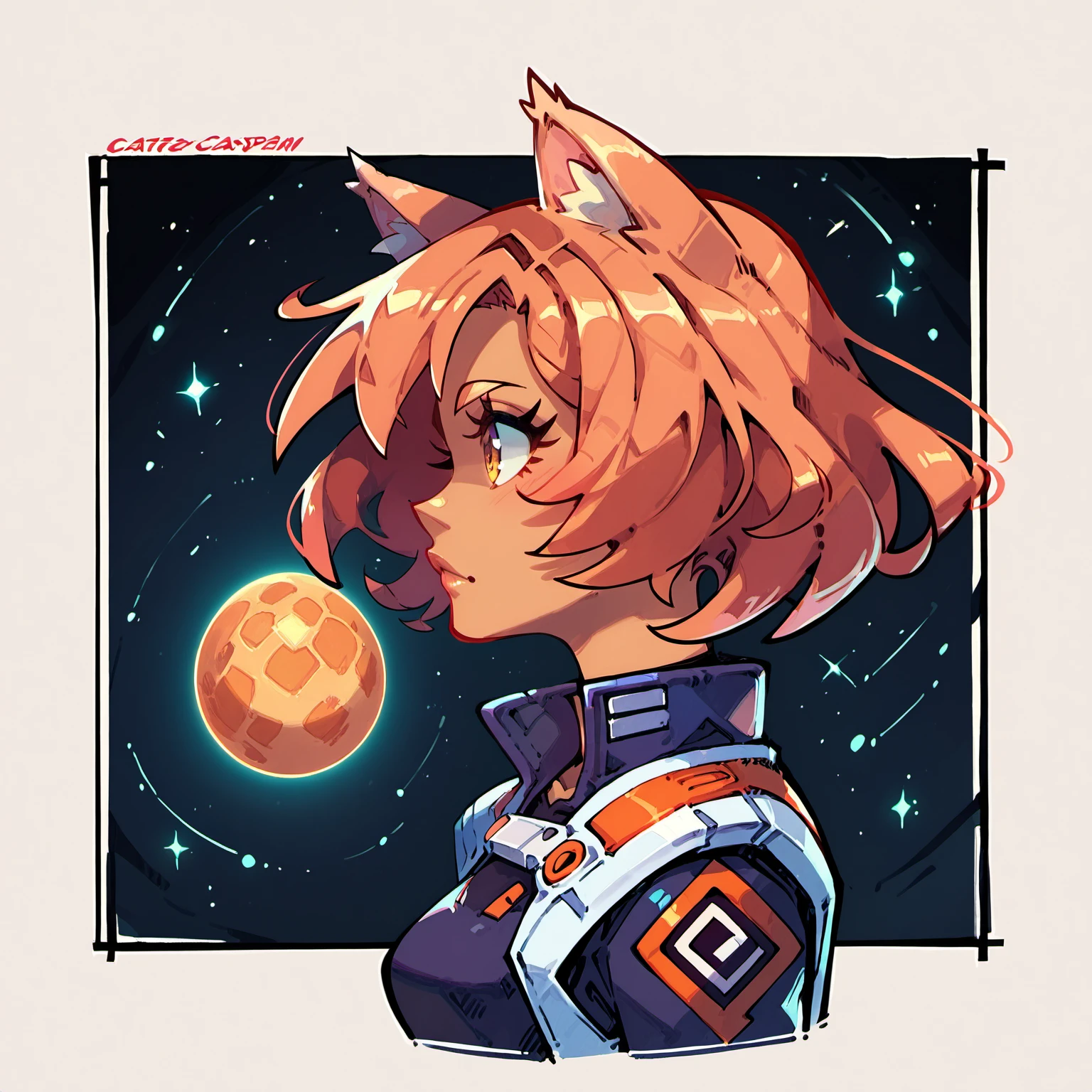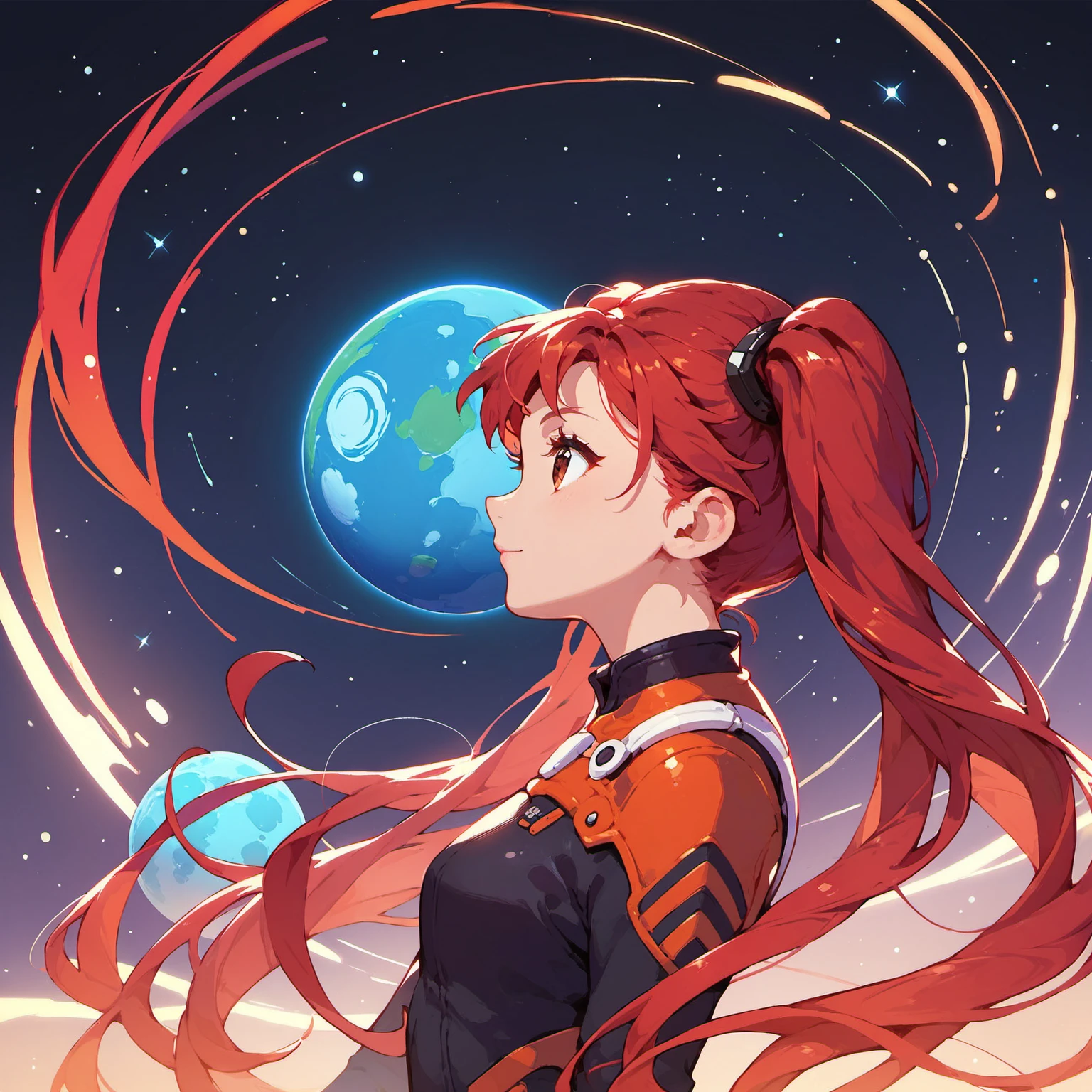 Medium form captioning: woman, outer space, from side, space uniform, planet