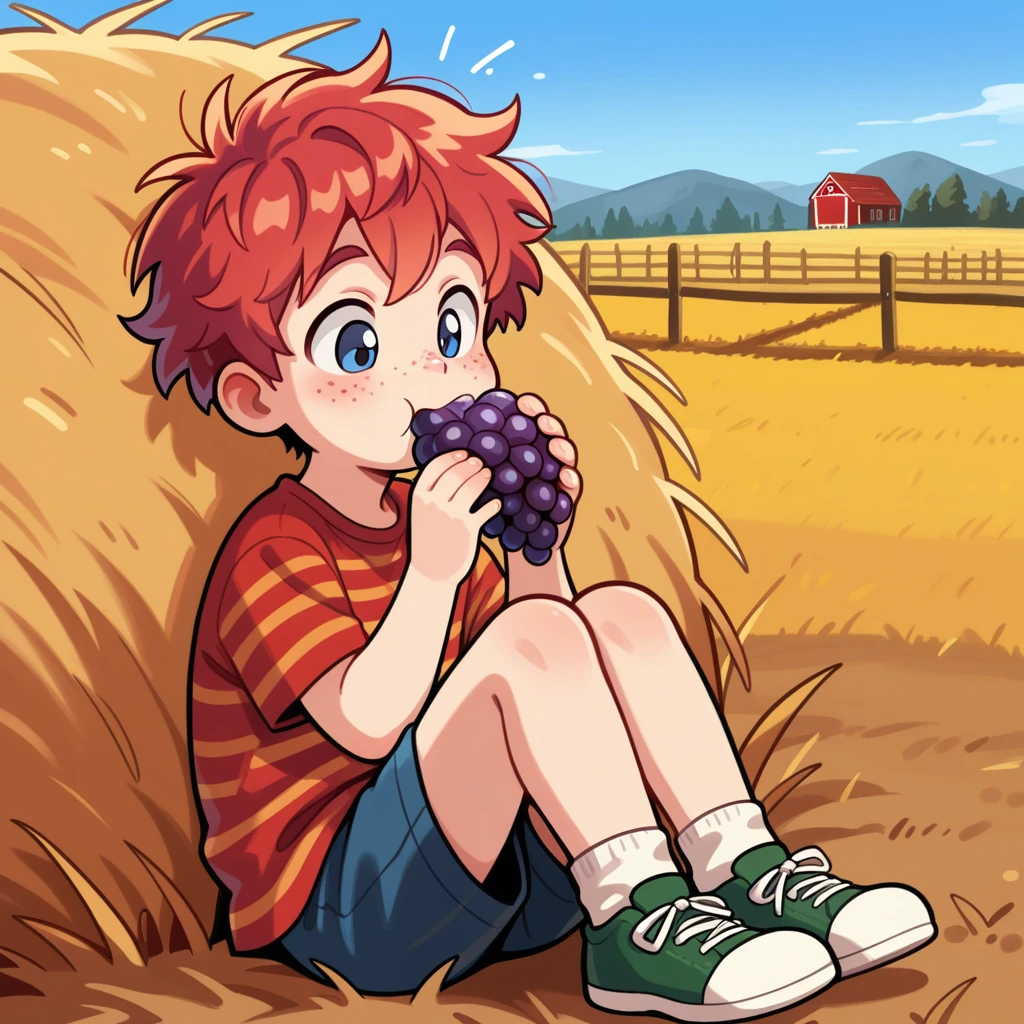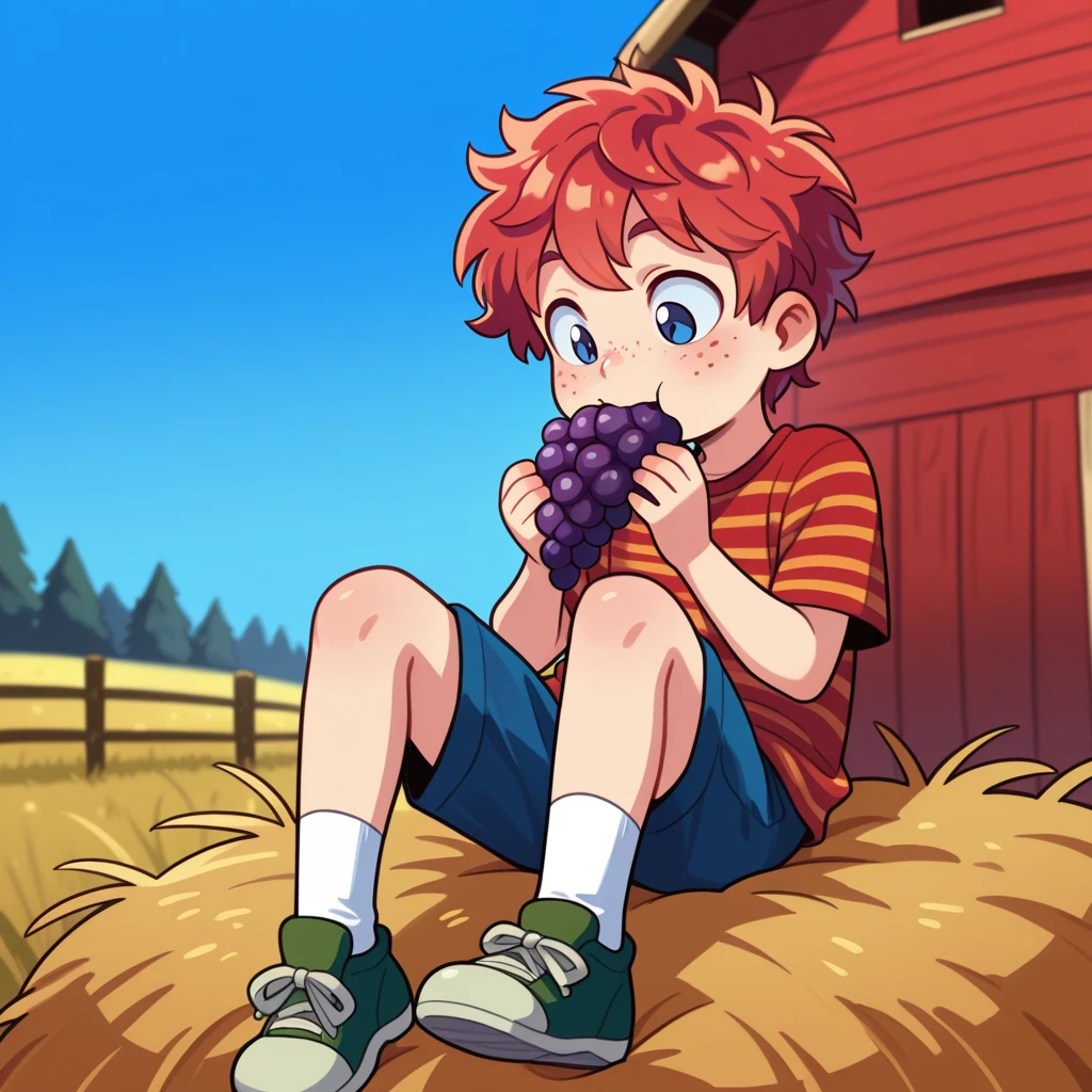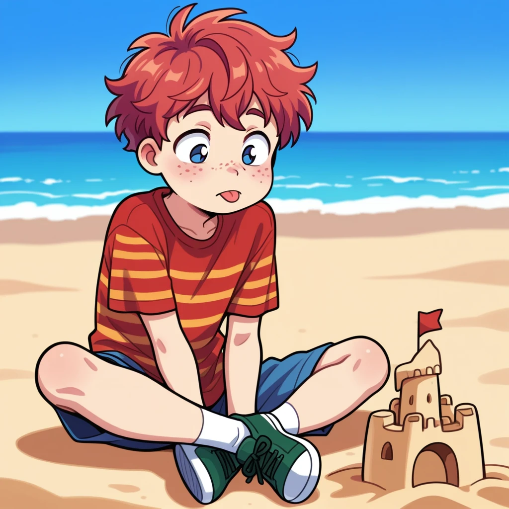 red and yellow t-shirt,striped t-shirt,blue shorts,green sneakers
