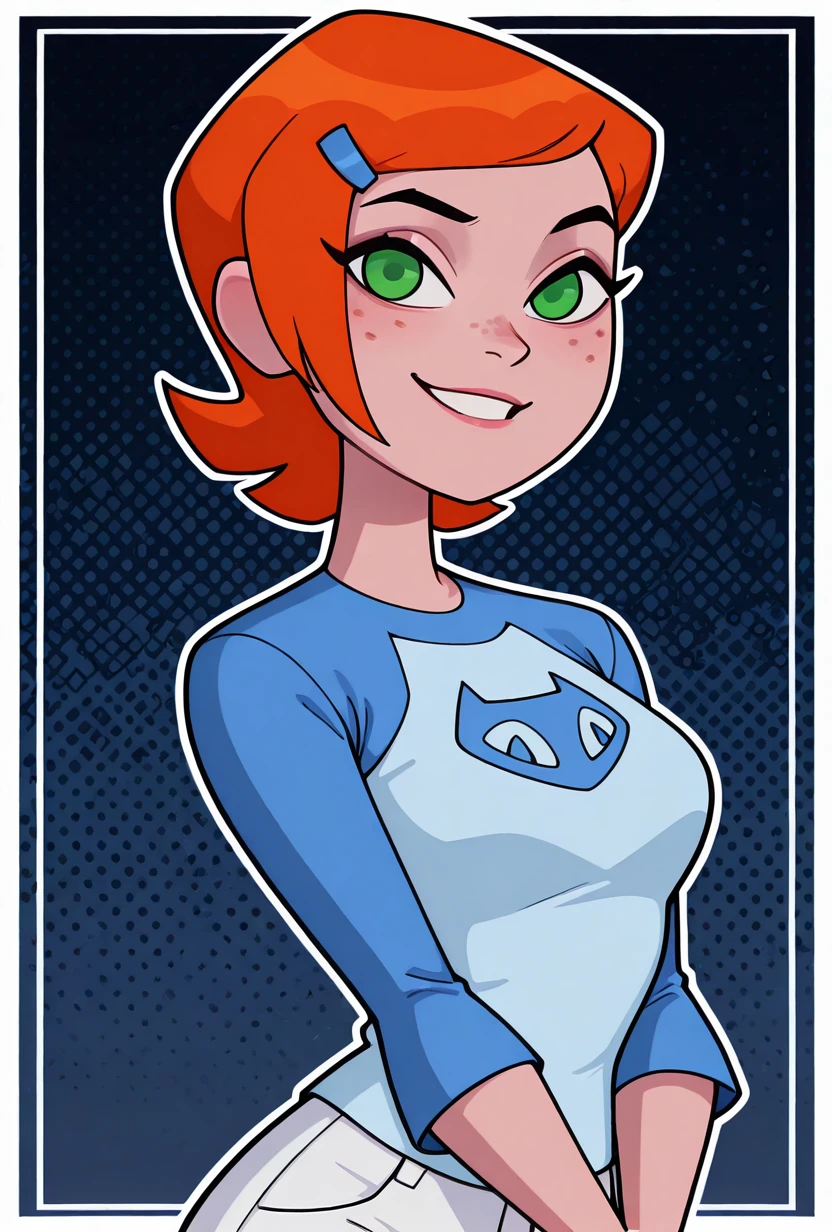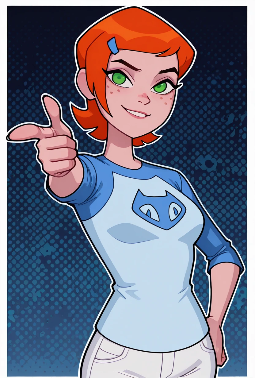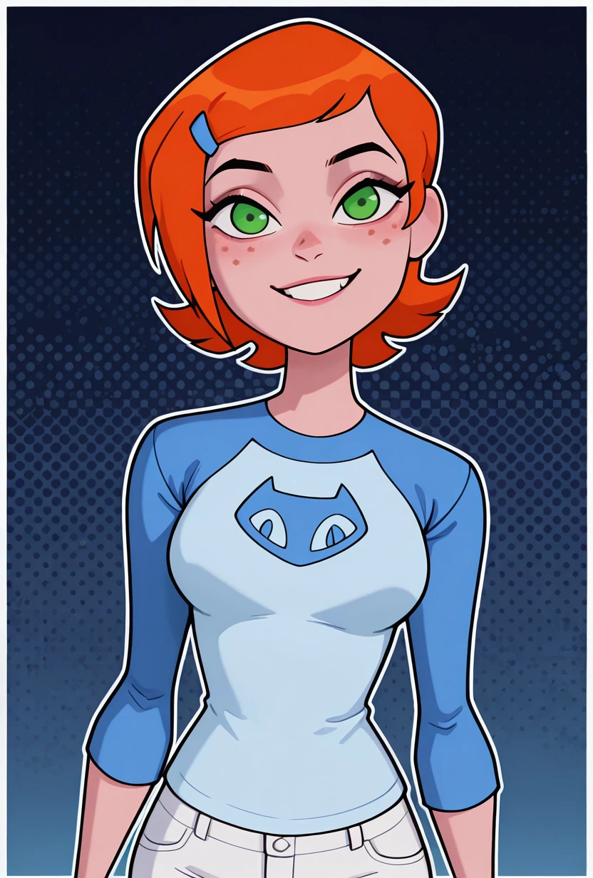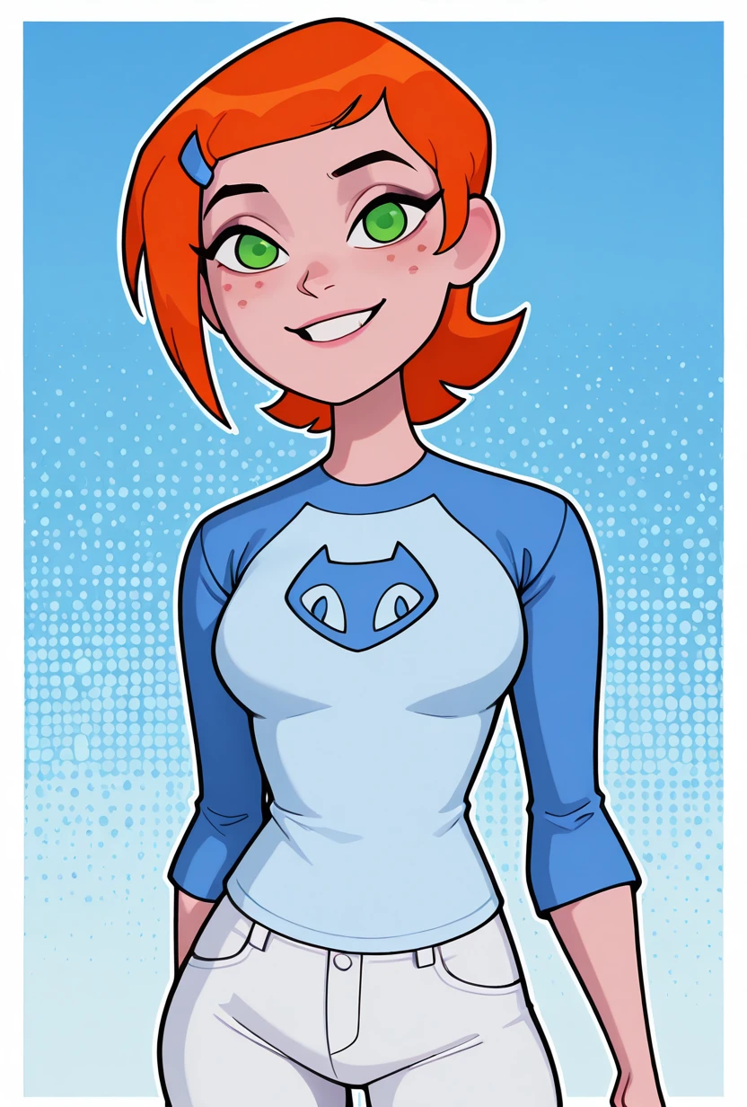 gwenov, orange hair, 1girl, short hair, hairclip, green eyes, raglan sleeves, freckles, white pants, blue shirt