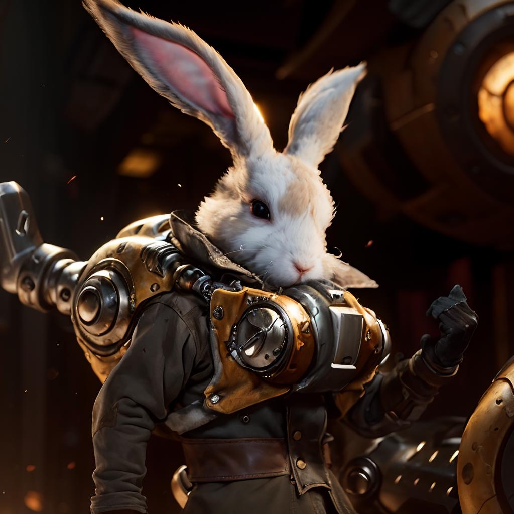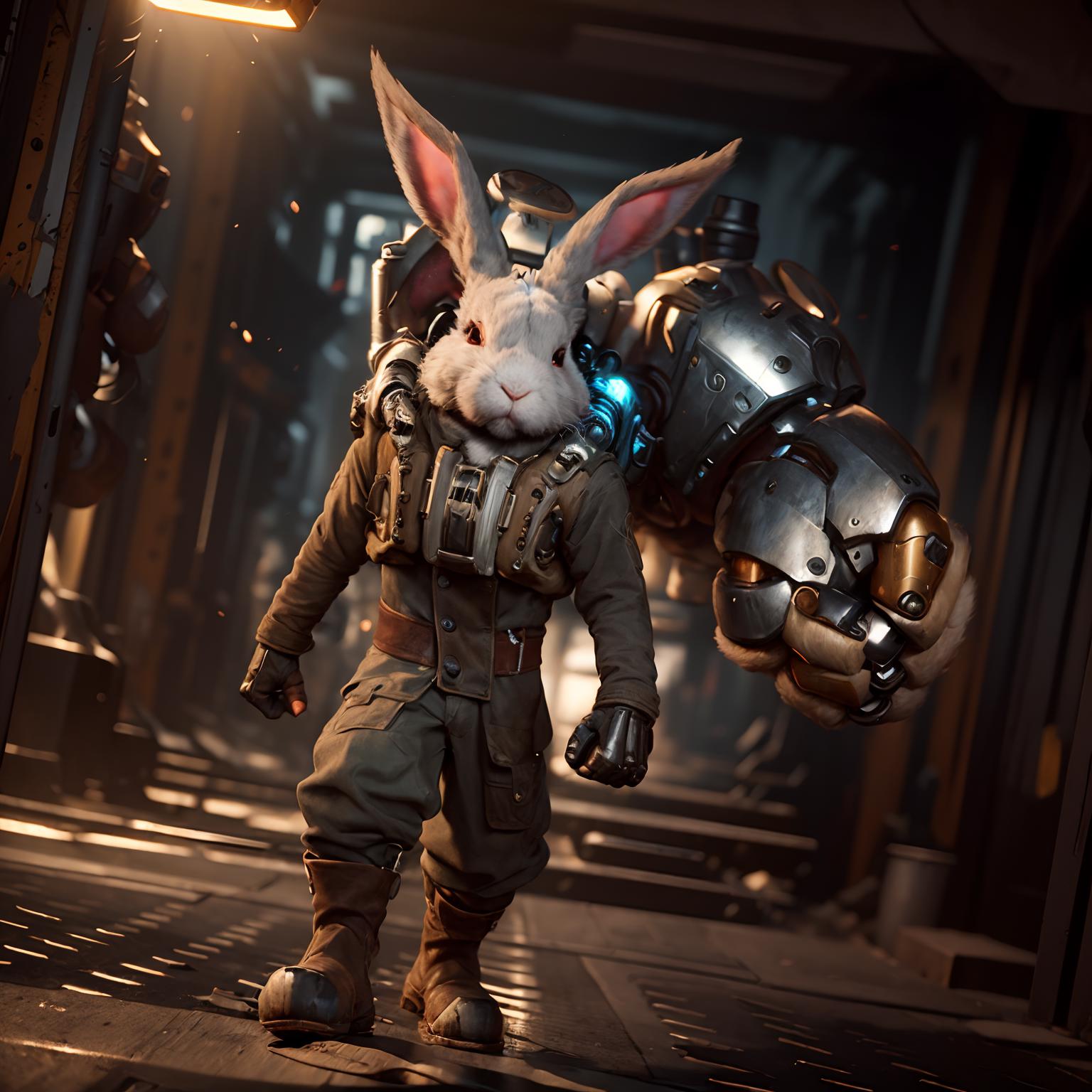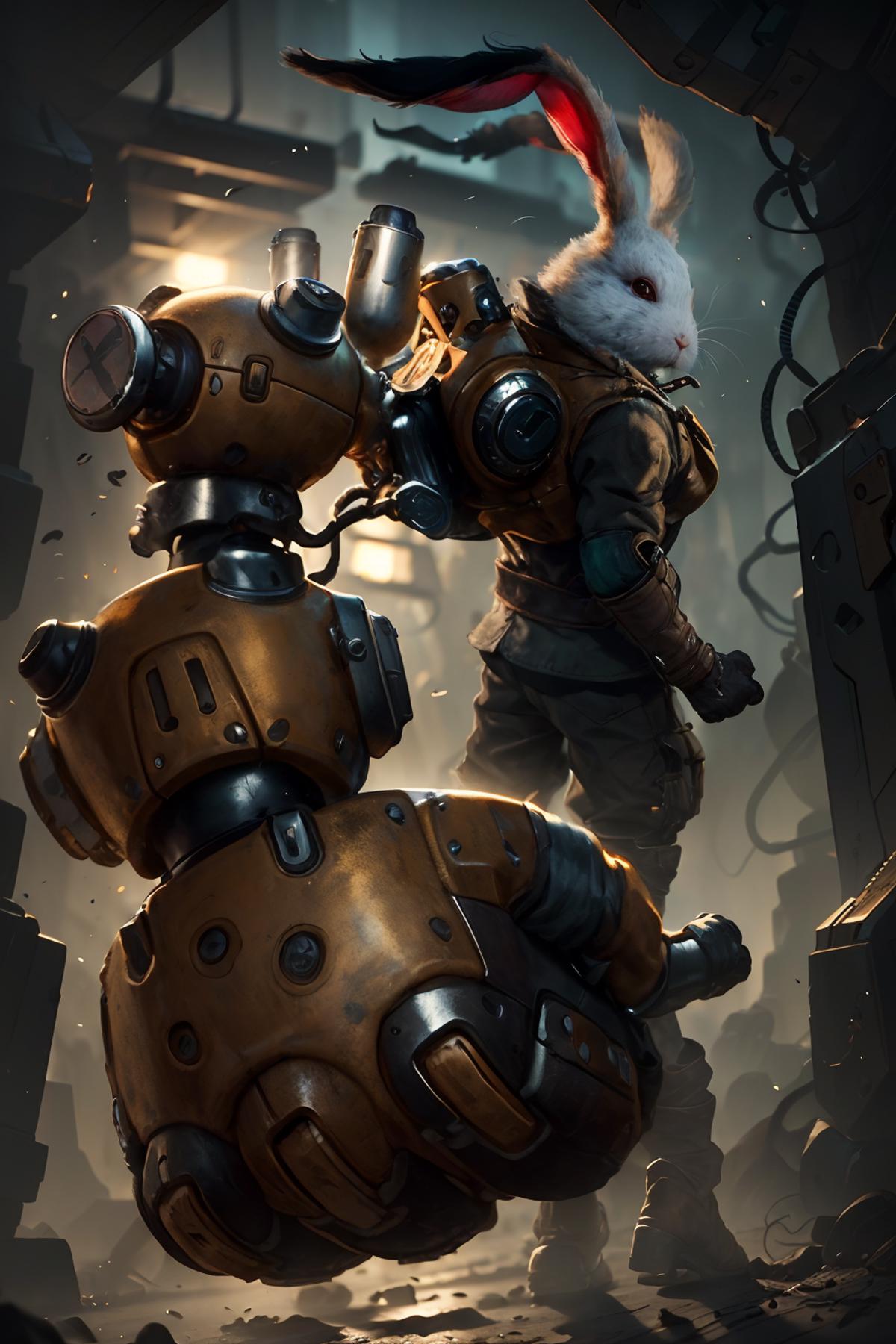 tu,rabbit,jacket,boots,(mechanical arm:1.4),rabbit ears,