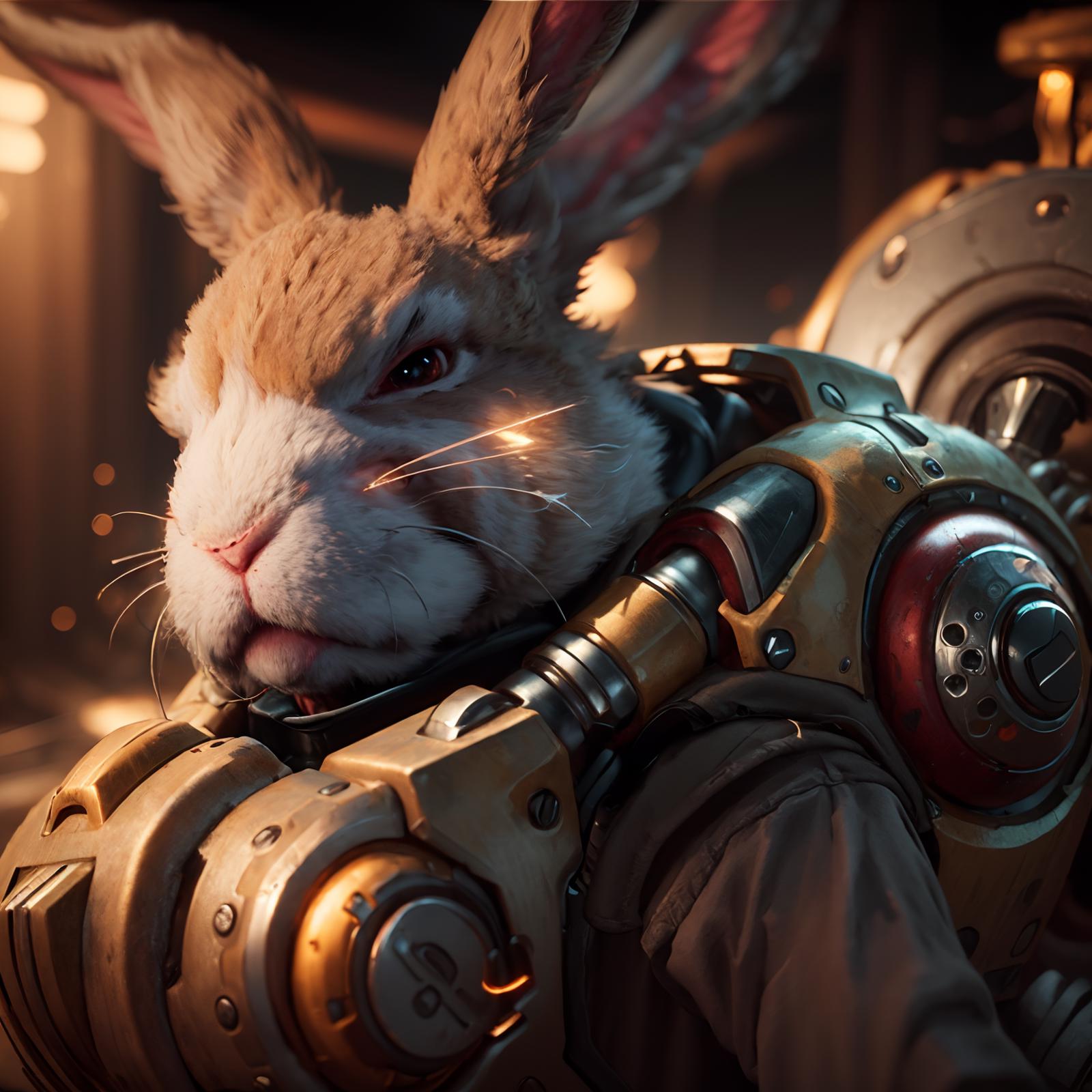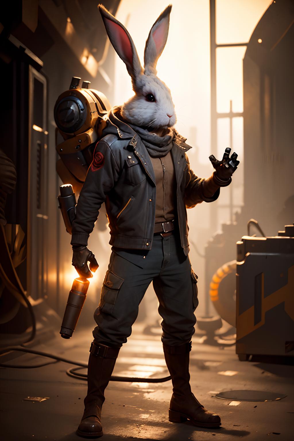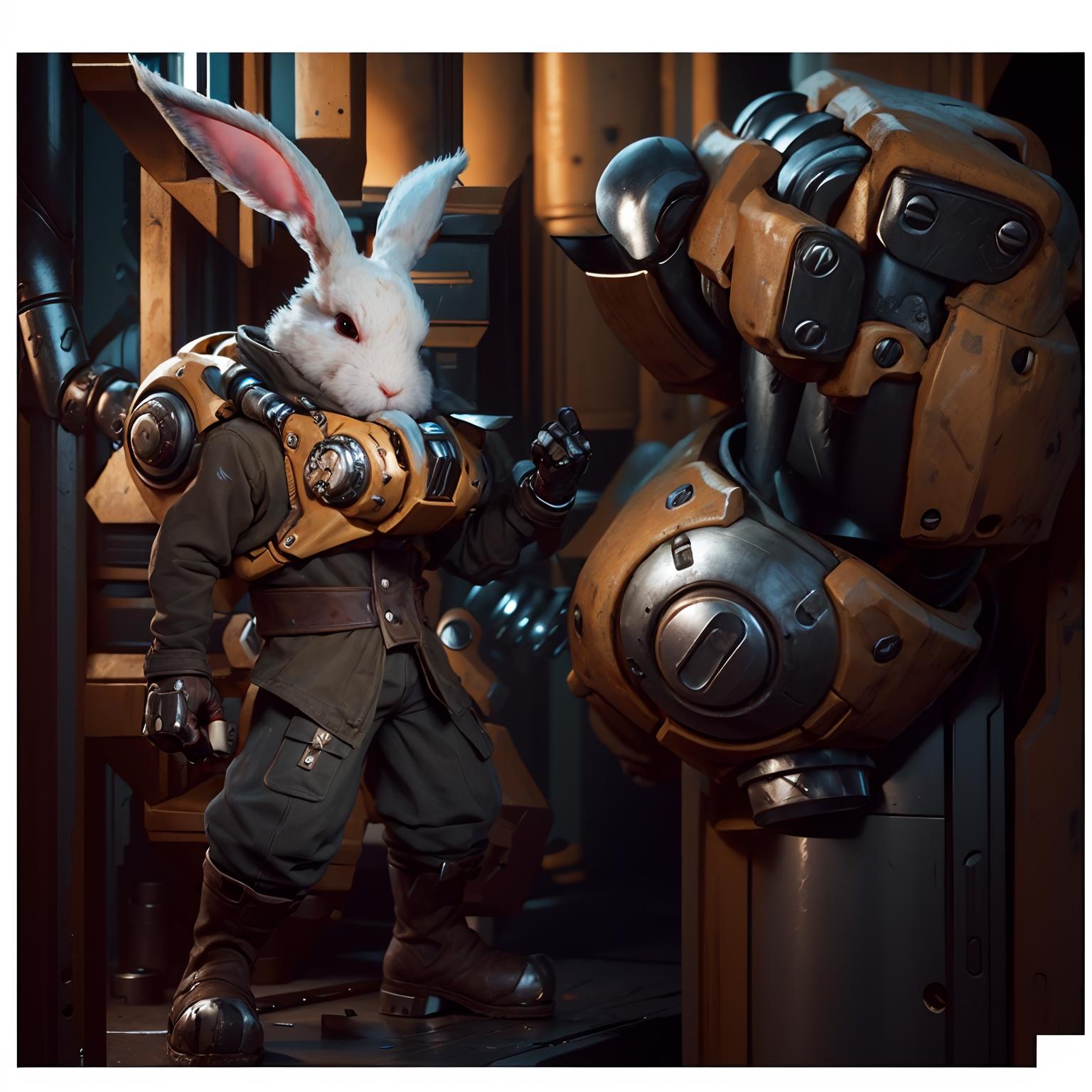 tu,rabbit,jacket,boots,(mechanical arm:1.4),rabbit ears,