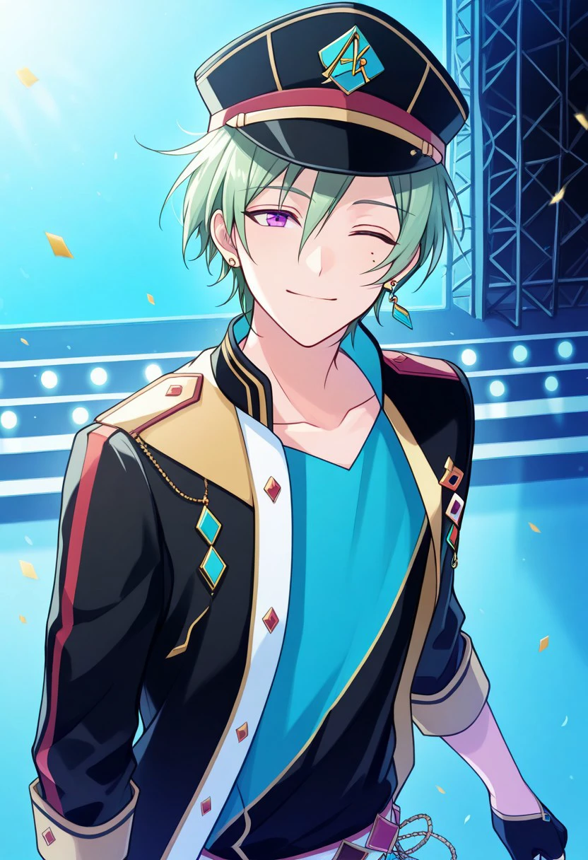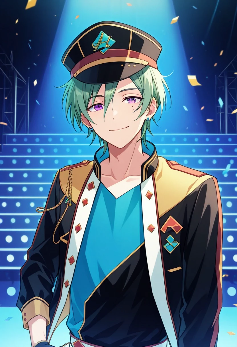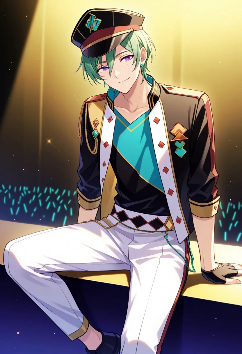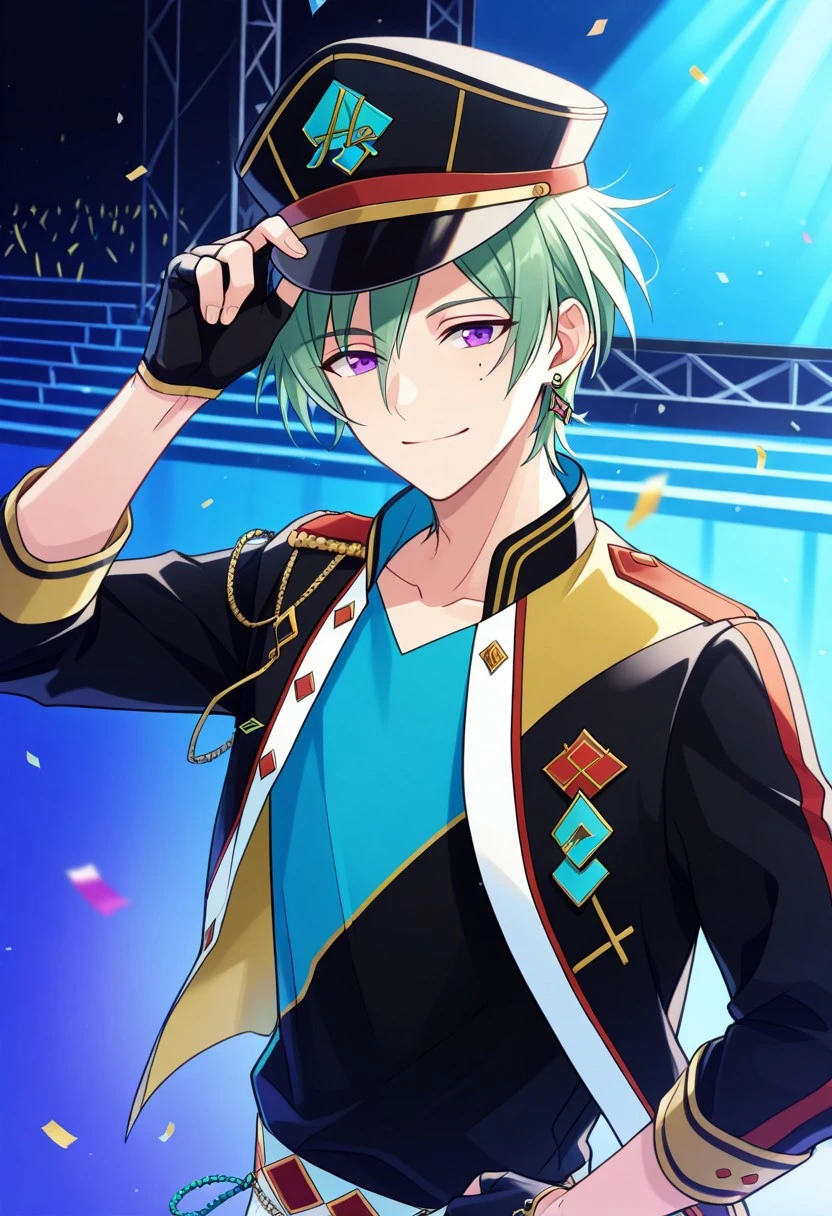 tatska, 1boy, male focus, solo, green hair, short hair, hair between eyes, purple eyes, mole under eye, jewelry, earrings, alkaloid uniform, hat, peaked cap, jacket, black jacket, open jacket, open clothes, shirt, black shirt, blue shirt, multicolored shirt, gloves, black gloves, fingerless gloves, belt, pants, white pants, shoes, black footwear,