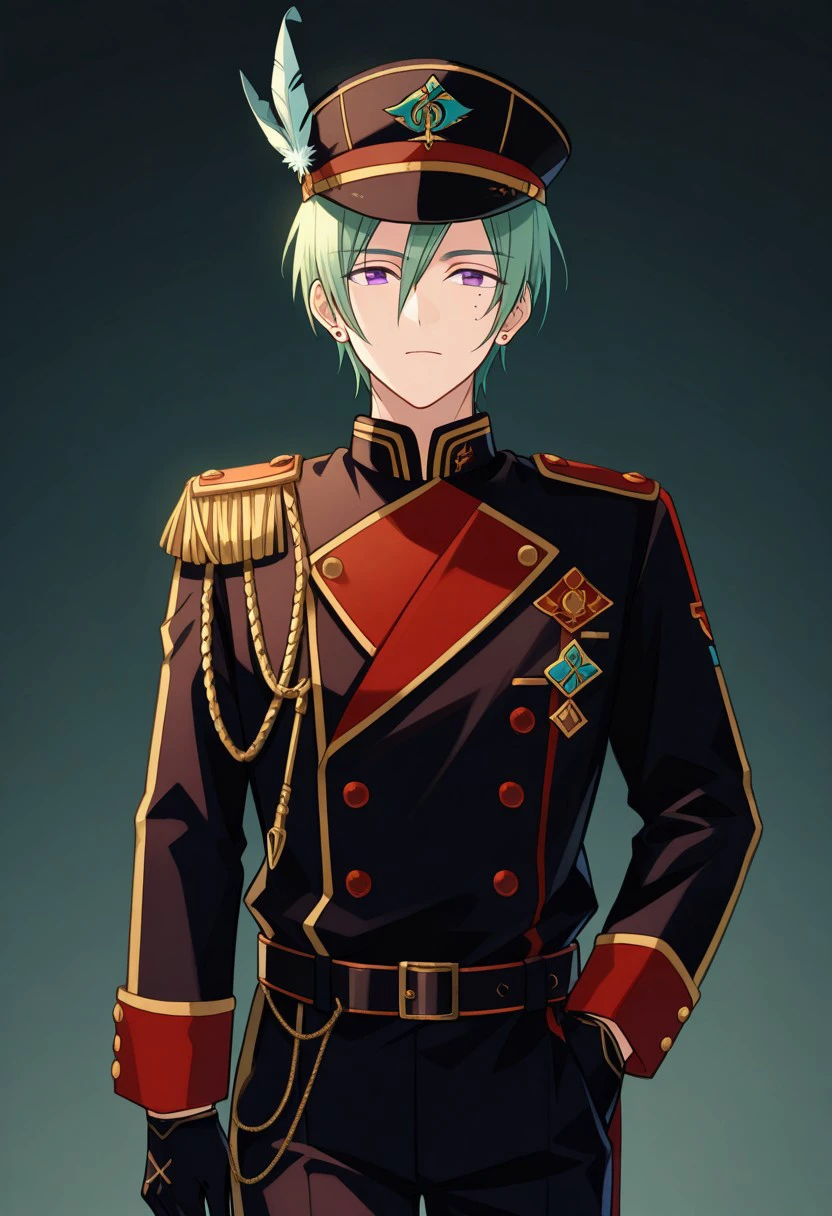 tatska, 1boy, male focus, solo, green hair, short hair, hair between eyes, purple eyes, mole under eye, jewelry, earrings, stud earrings, uniform, military uniform, hat, red headwear, feather, hat feather, jacket, black jacket, red jacket, buttons, double-breasted, epaulettes, aiguillette, heart, gloves, black gloves, belt, pants, black pants,
