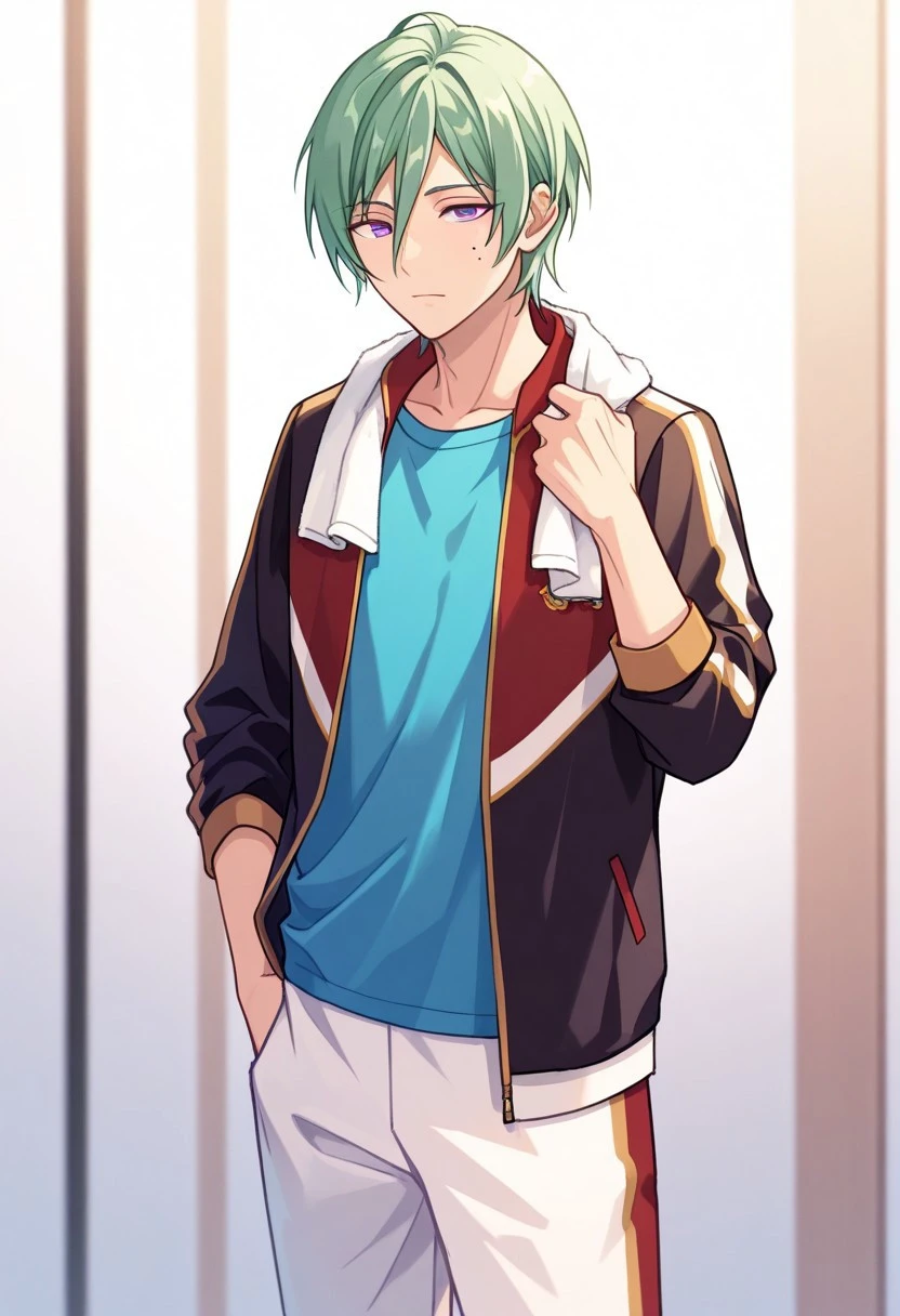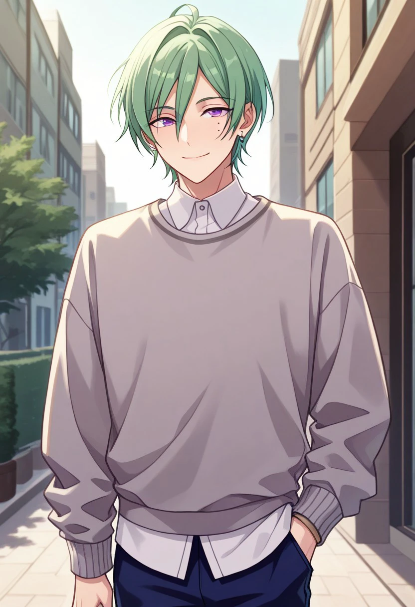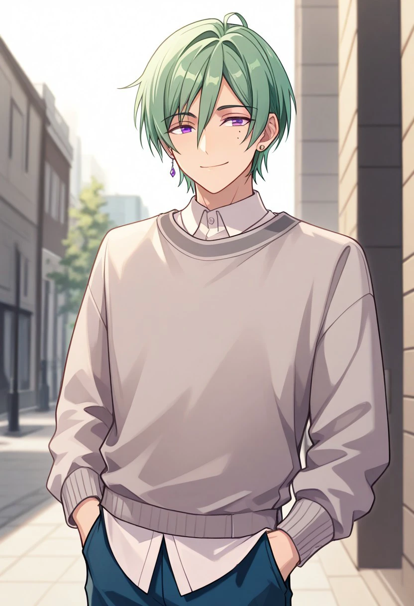 tatska, 1boy, male focus, solo, green hair, short hair, hair between eyes, purple eyes, mole under eye, jewelry, earrings, shirt, white shirt, collared shirt, sweater, grey sweater, long sleeves, pants, blue pants,