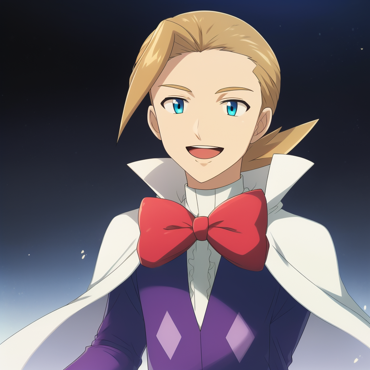 1boy, blonde hair, blue eyes, white cape, red bowtie, center frills, white gloves, purple shirt, long sleeves,