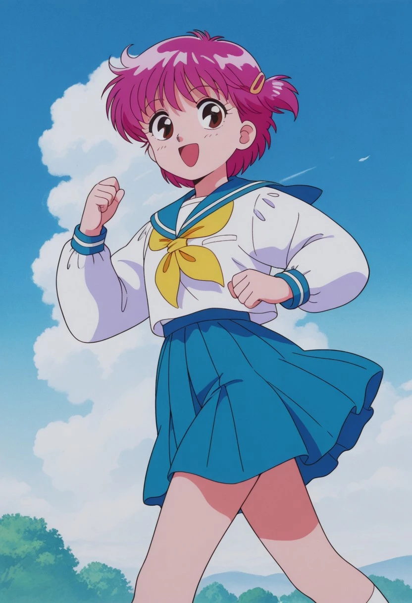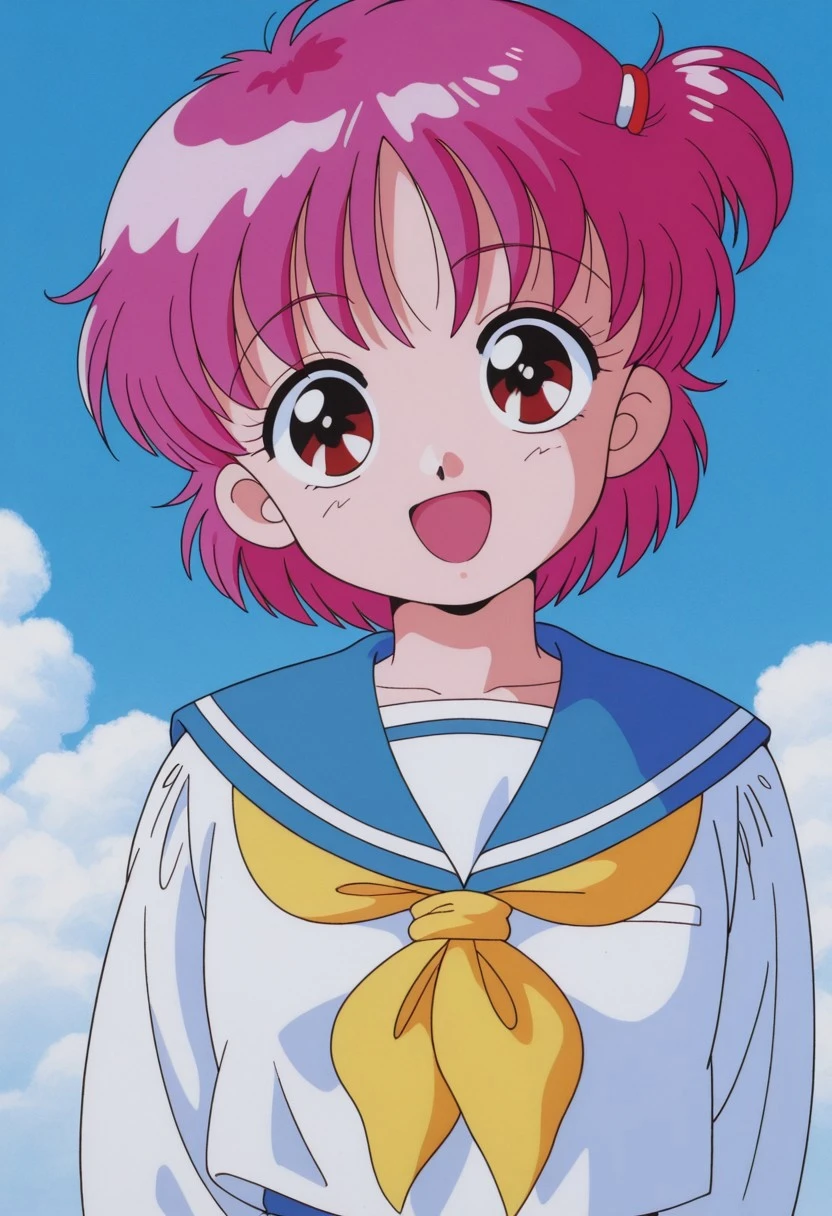 ① wapiko,1girl,pink hair,short hair,hair ornament,hairclip,school uniform,sailor colla,rserafuku,long sleeves