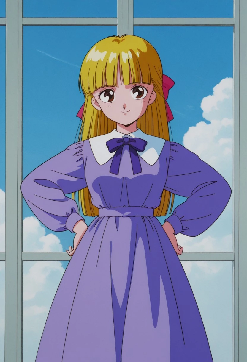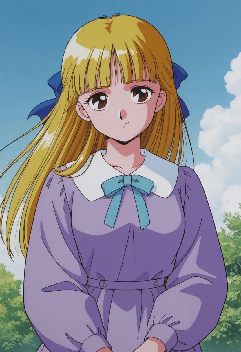 ② chitose,1girl,blonde hair,long hair,bangs,brown eyes,hair bow,purple dress,bow tie