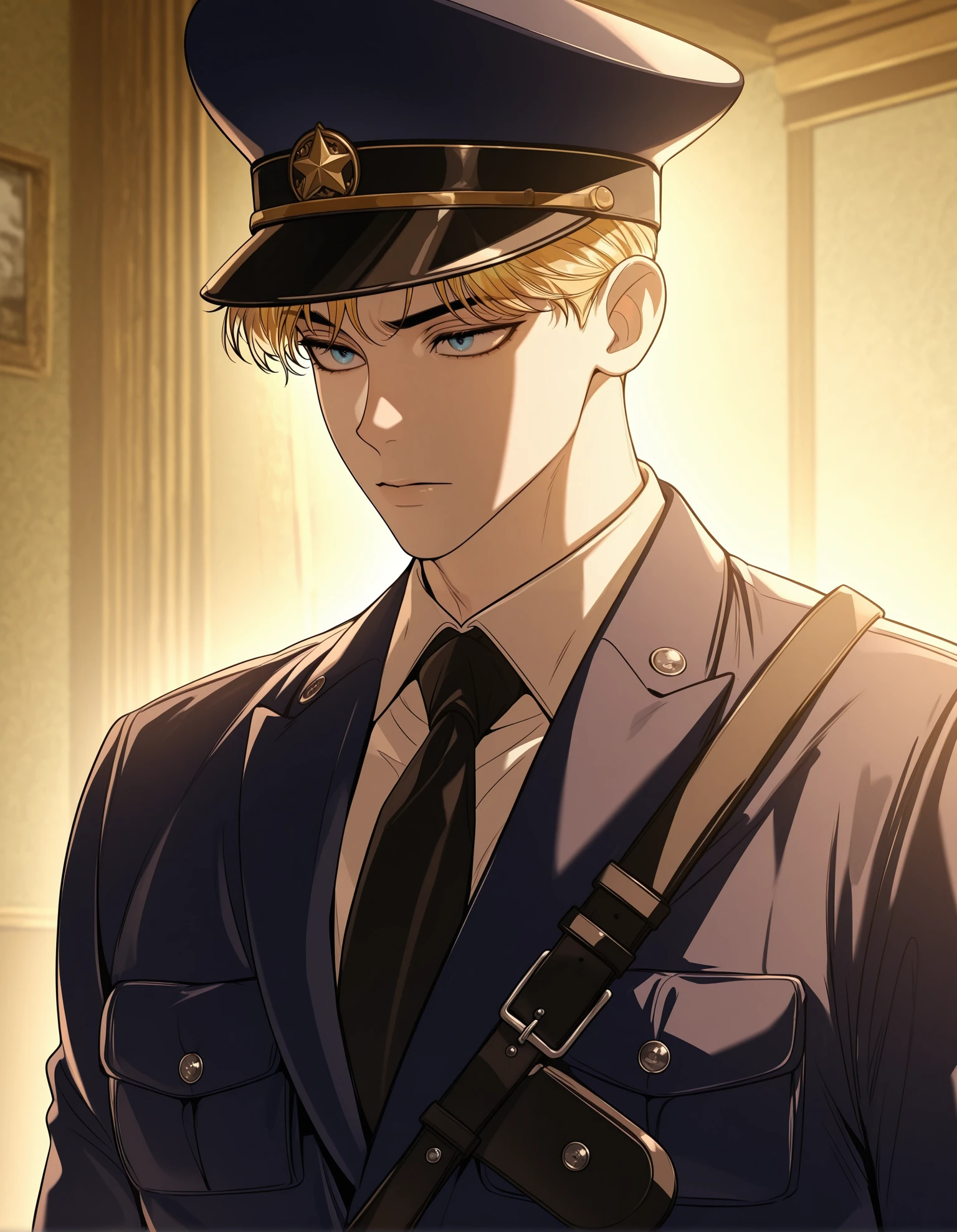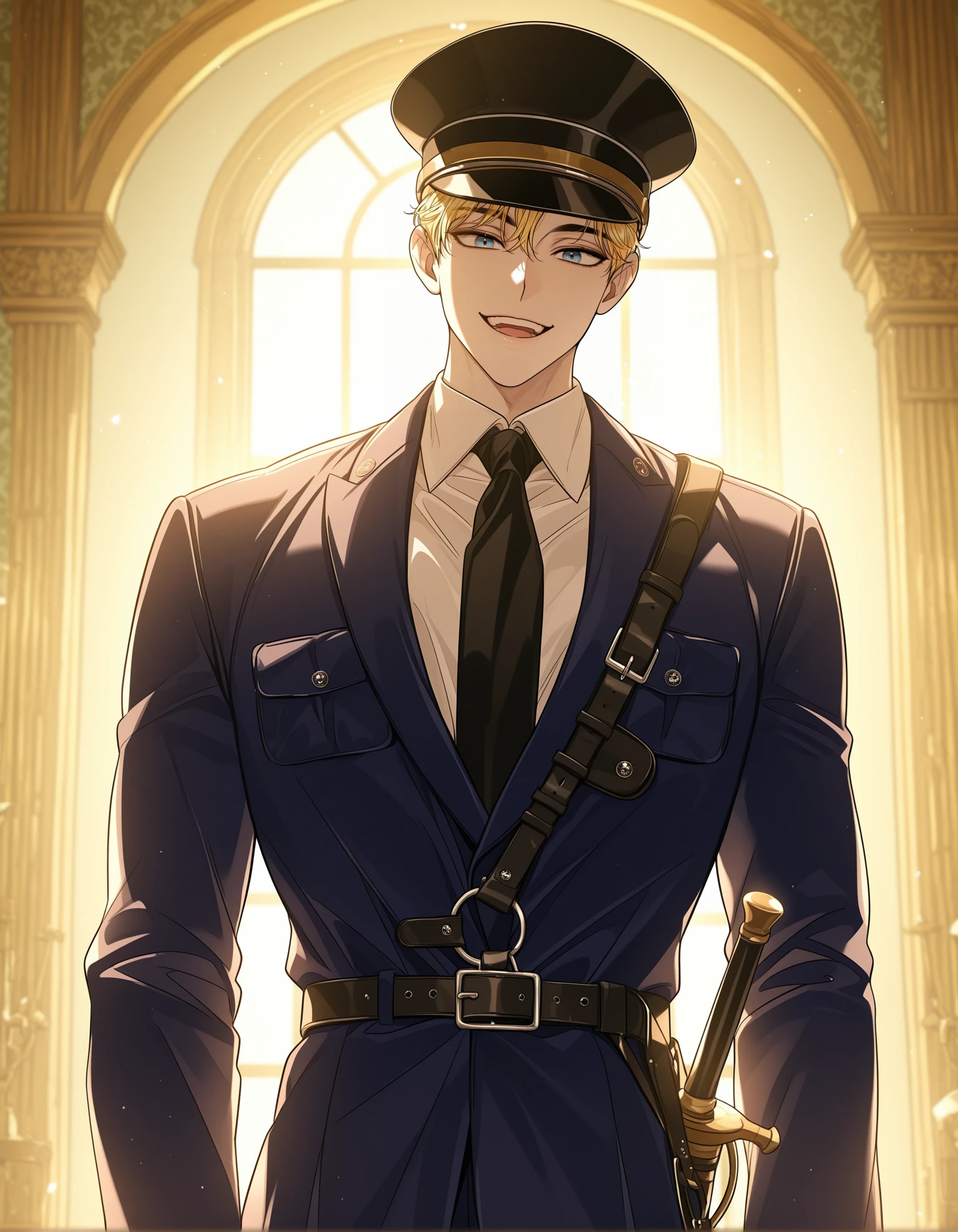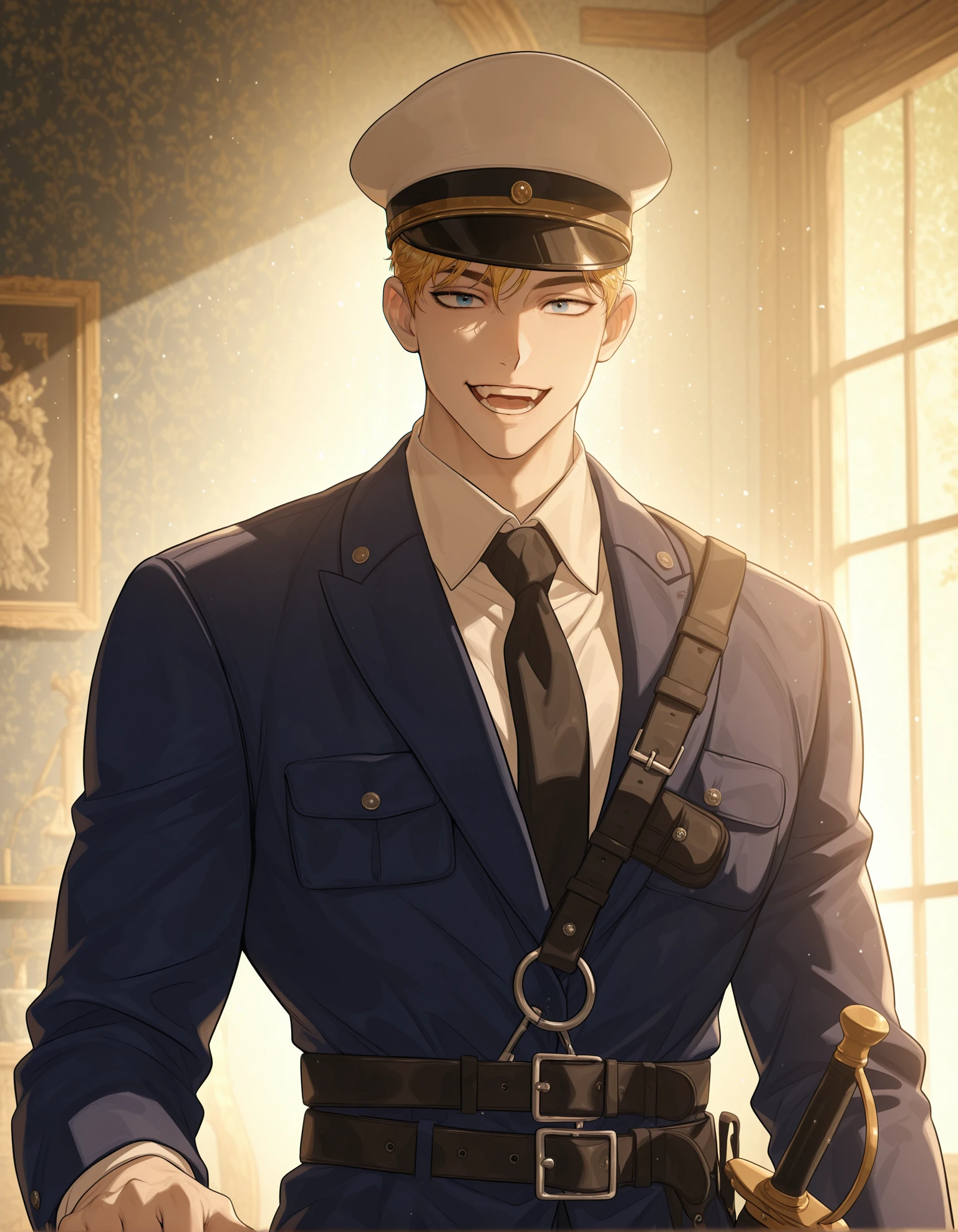 Outfit - Eden Duncan Lancaste, 1boy, male focus, hat, solo, blue eyes, necktie, black necktie, weapon, uniform, police, police uniform, military uniform, white shirt, shirt, belt, smile, sword, short hair, looking at viewer, blue jacket, jacket