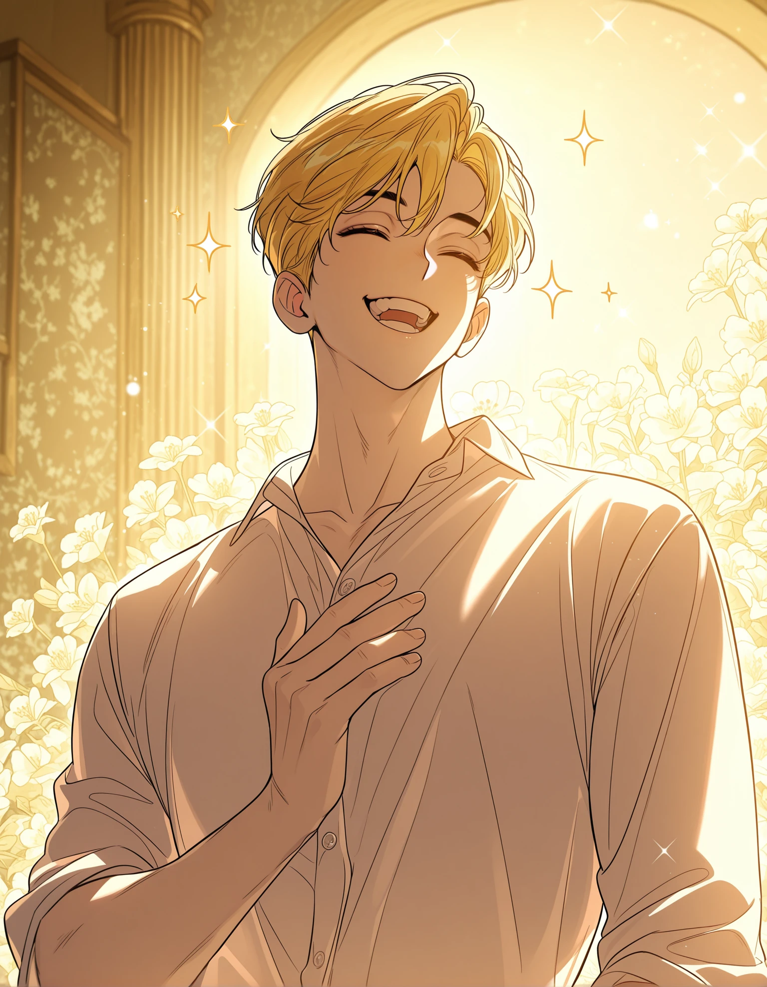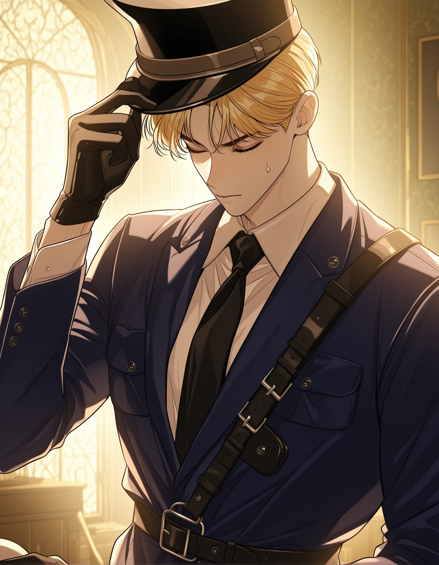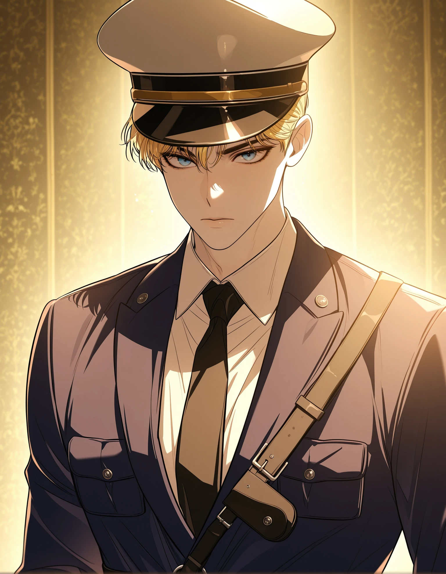 Outfit - Eden Duncan Lancaste, 1boy, male focus, hat, solo, blue eyes, necktie, black necktie, weapon, uniform, police, police uniform, military uniform, white shirt, shirt, belt, smile, sword, short hair, looking at viewer, blue jacket, jacket