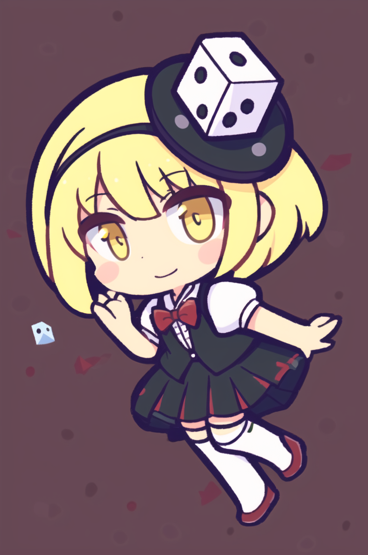 Xeno a, red bowtie, short sleeves, dice \(ornament\), blonde hair, short hair, black vest, white shirt, hairband, center frills, black skirt, thigh_highs, holding card, shoes, yellow eyes, androgynous