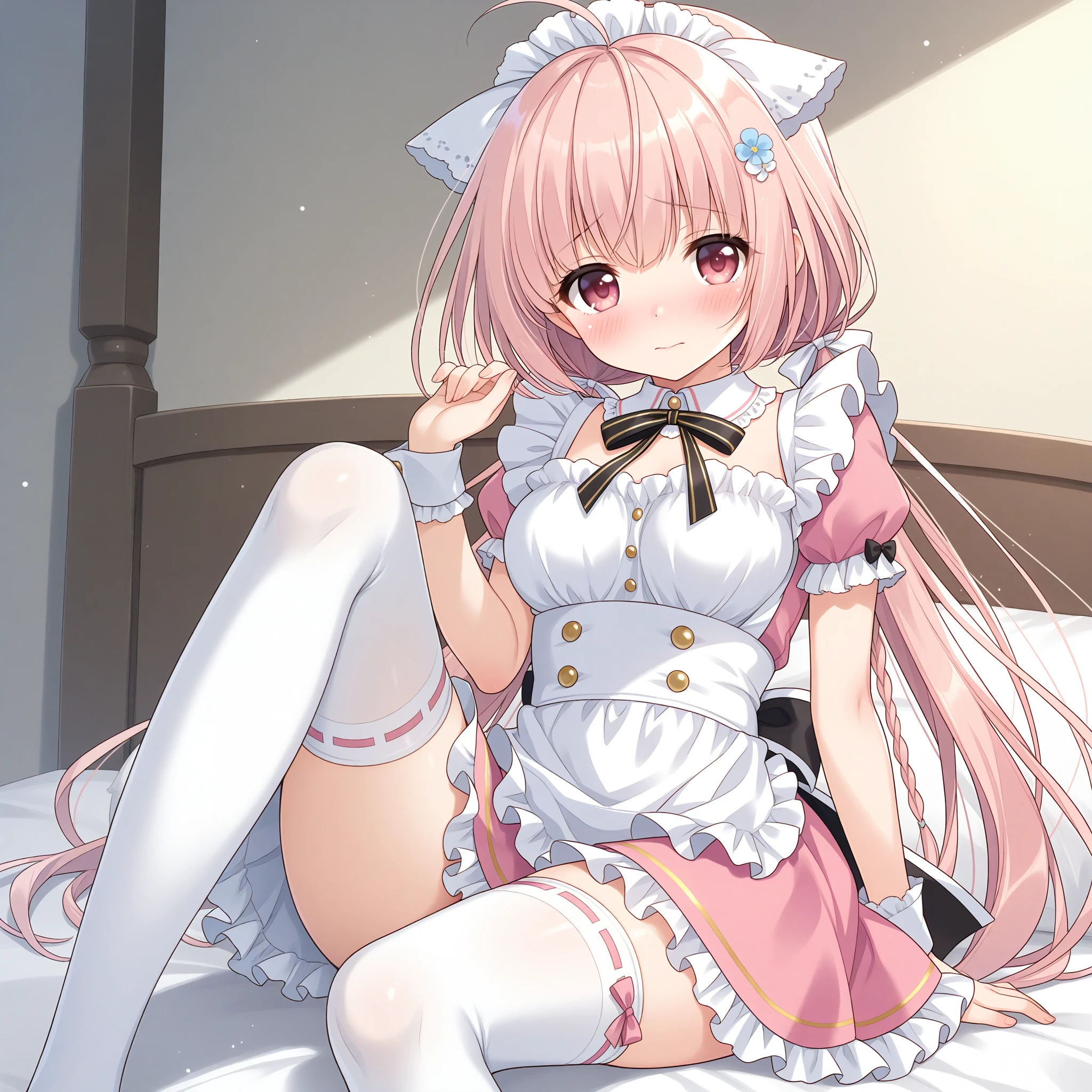 side braid,hair flower,hair bow,white bow,maid,maid headdress,back bow,black bow,pink skirt,frilled skirt,yellow-trimmed skirt,ribbon-trimmed thighhighs,white thighhighs,white frills,maid apron,white apron,frilled apron,puffy short sleeves,frilled sleeves,wrist cuffs,