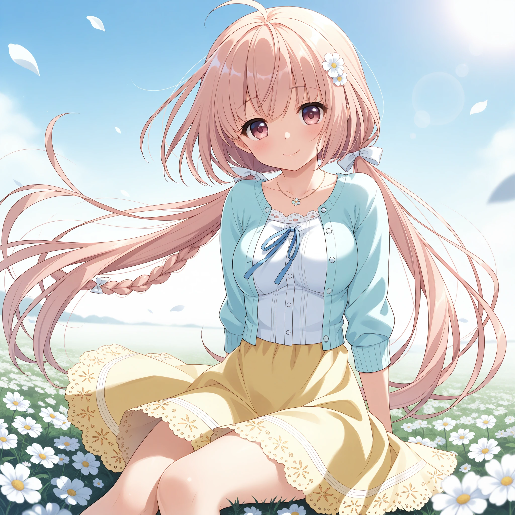 side braid,hair flower,hair bow,white bow,yellow skirt,necklace,light blue cardigan,white shirt,lace-trimmed shirt,open cardigan,shirt ribbon,blue ribbon,lace-trimmed skirt,white-trimmed skirt,