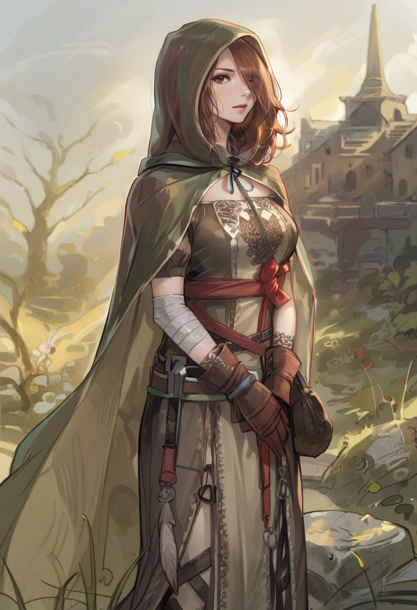 hooded cape, dress, gloves, belt, bandaged arm, bandaged legs,
