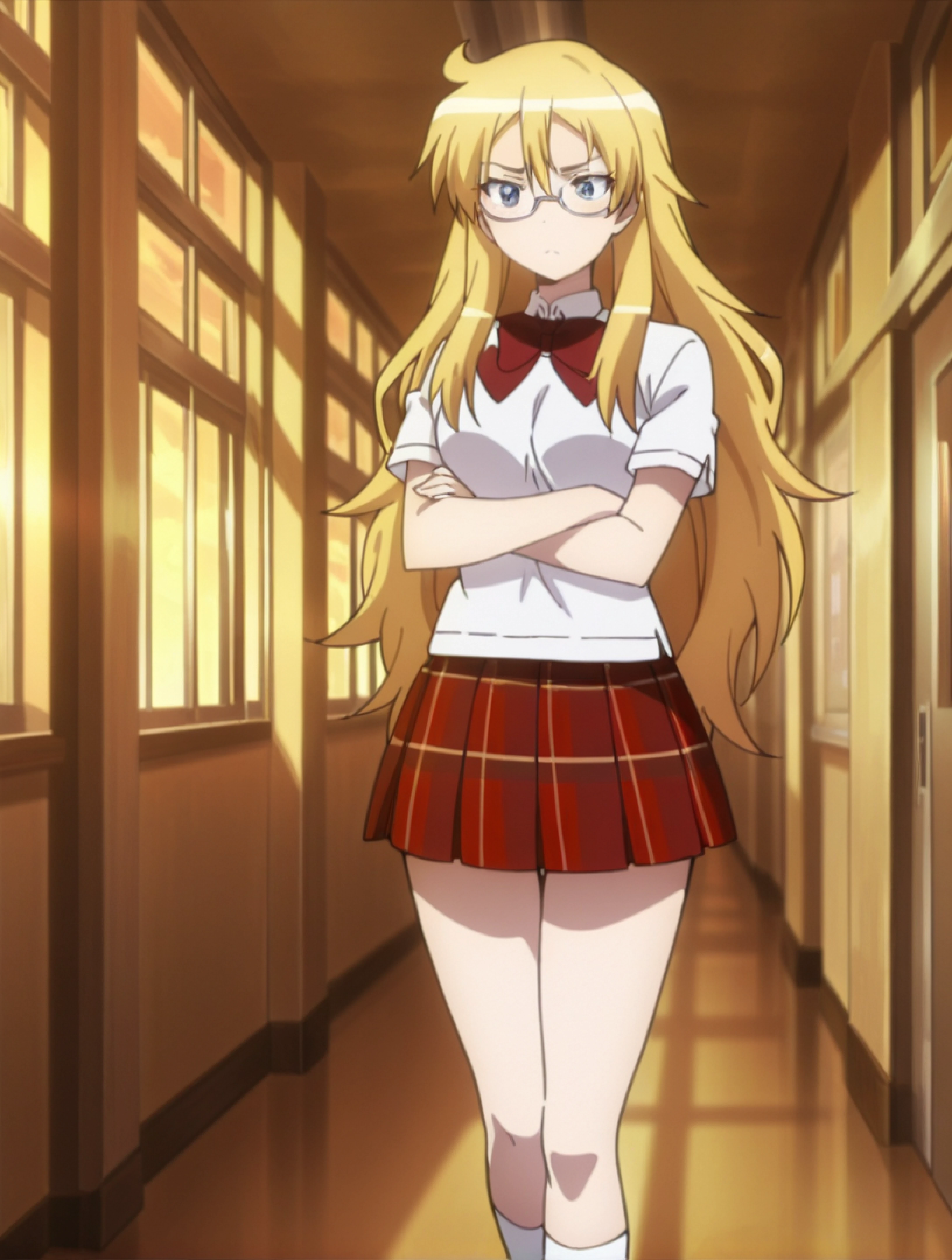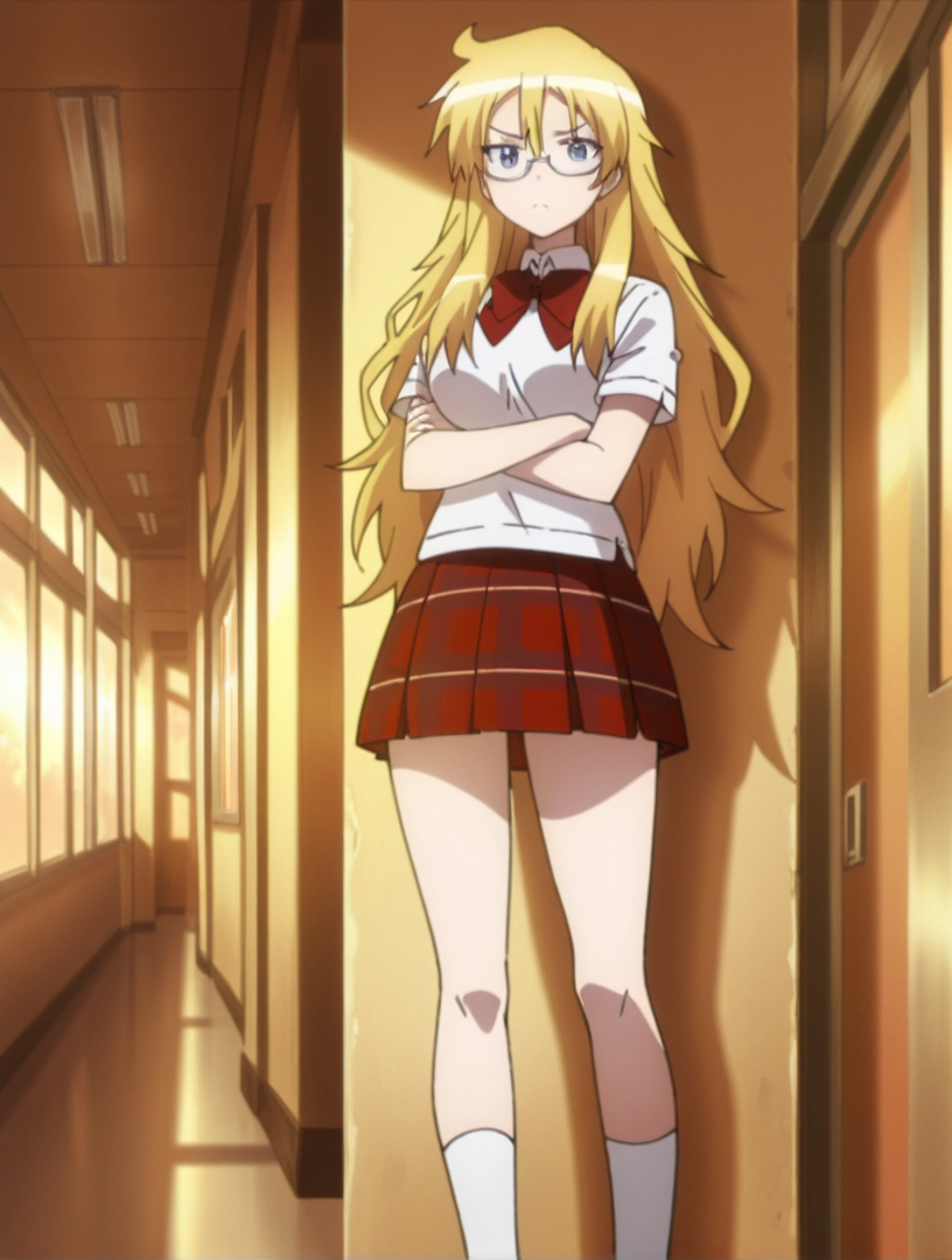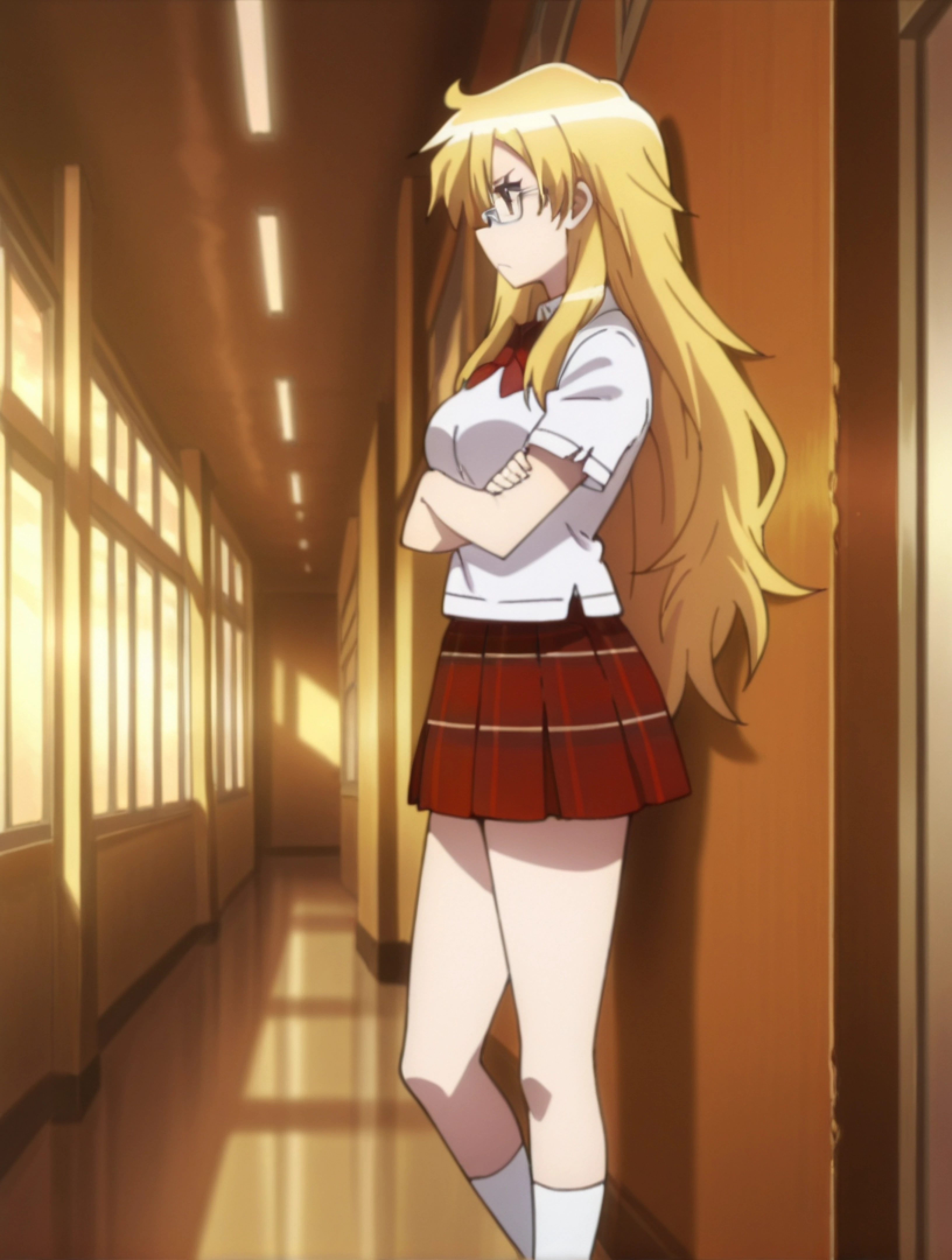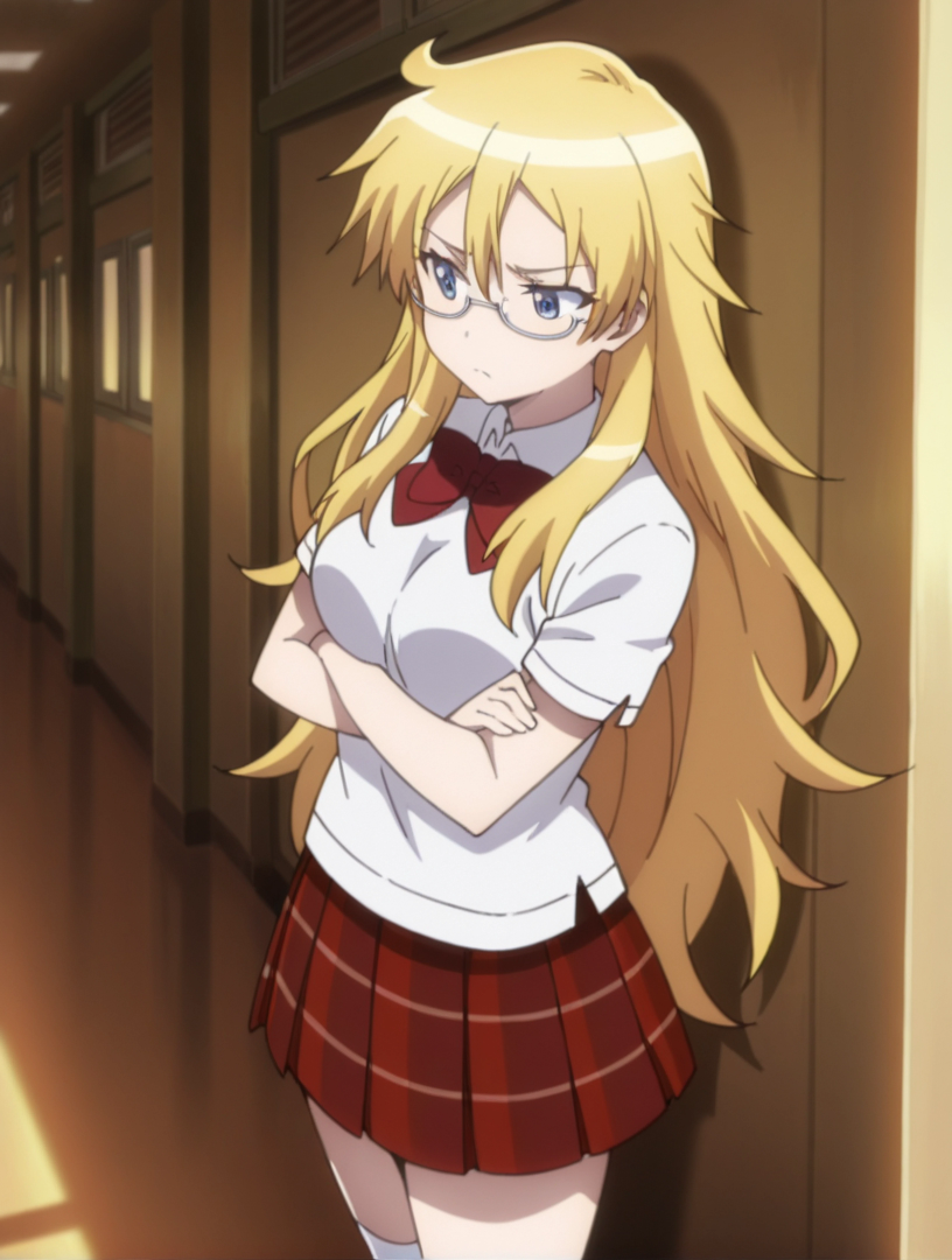 school uniform, red bowtie, white shirt, red skirt, plaid skirt, white socks, red high-top sneakers