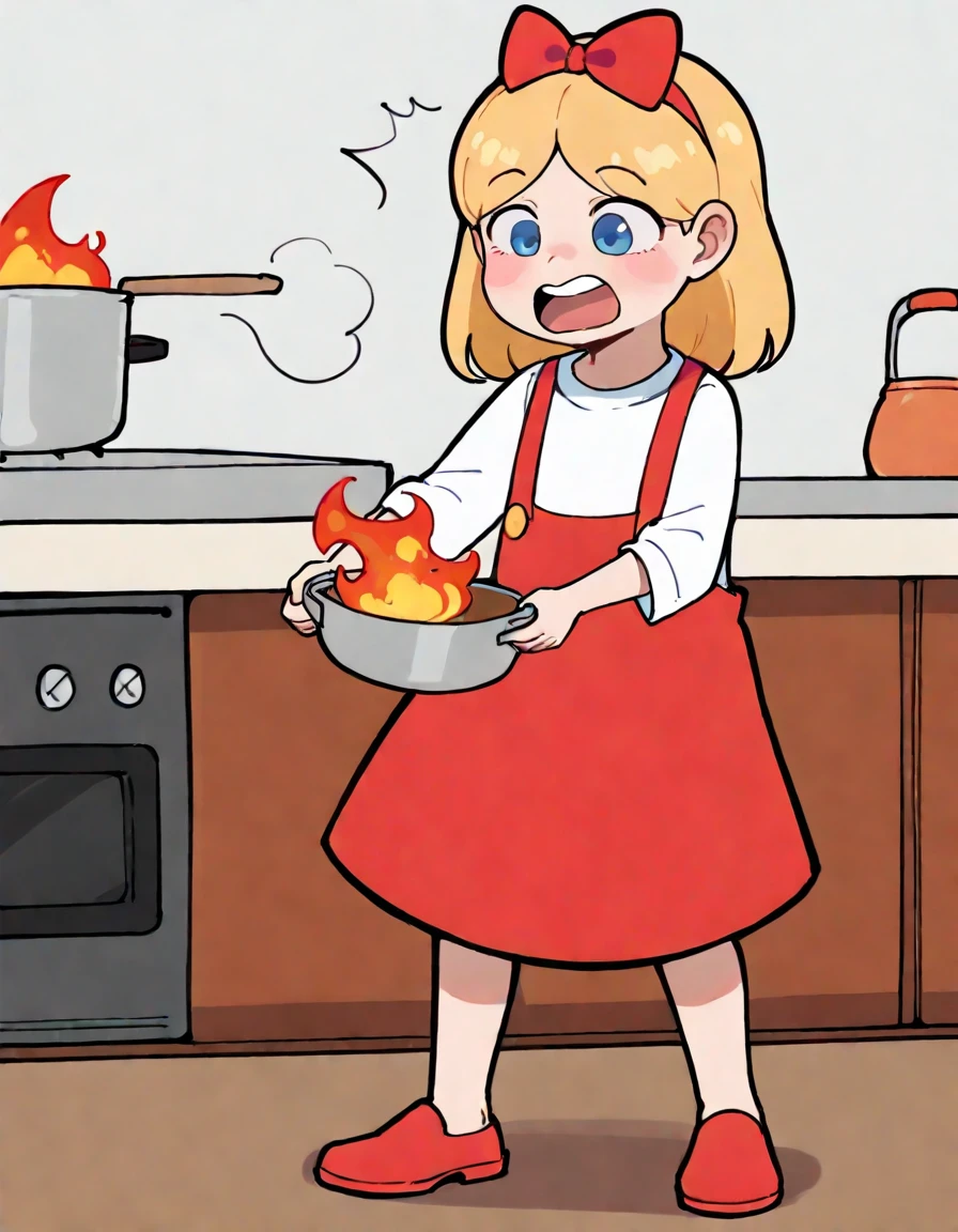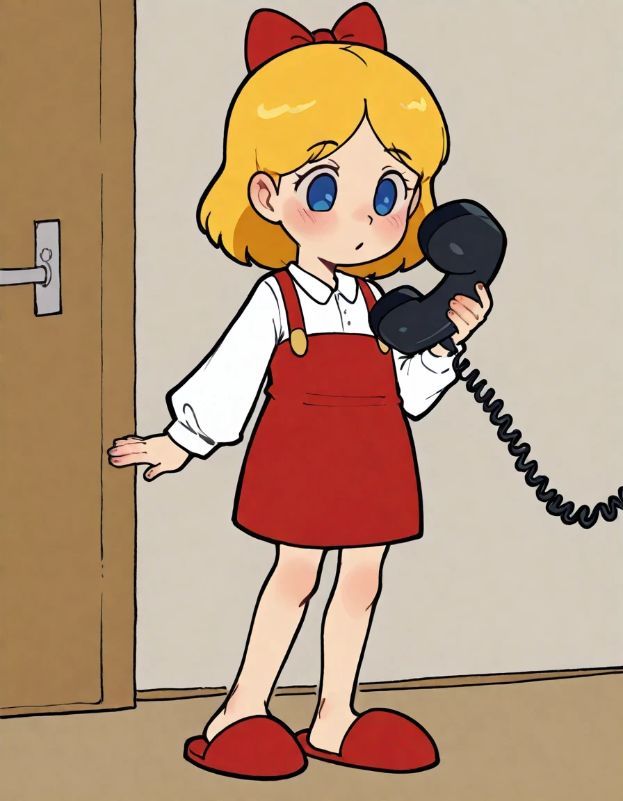 Anime Style: EBTCY, Anistyl, female child, blonde hair, parted bangs, medium hair, red hairbow, bangs, blue eyes, pacmaneyes, white shirt, red overall skirt, slippers, red footwear,