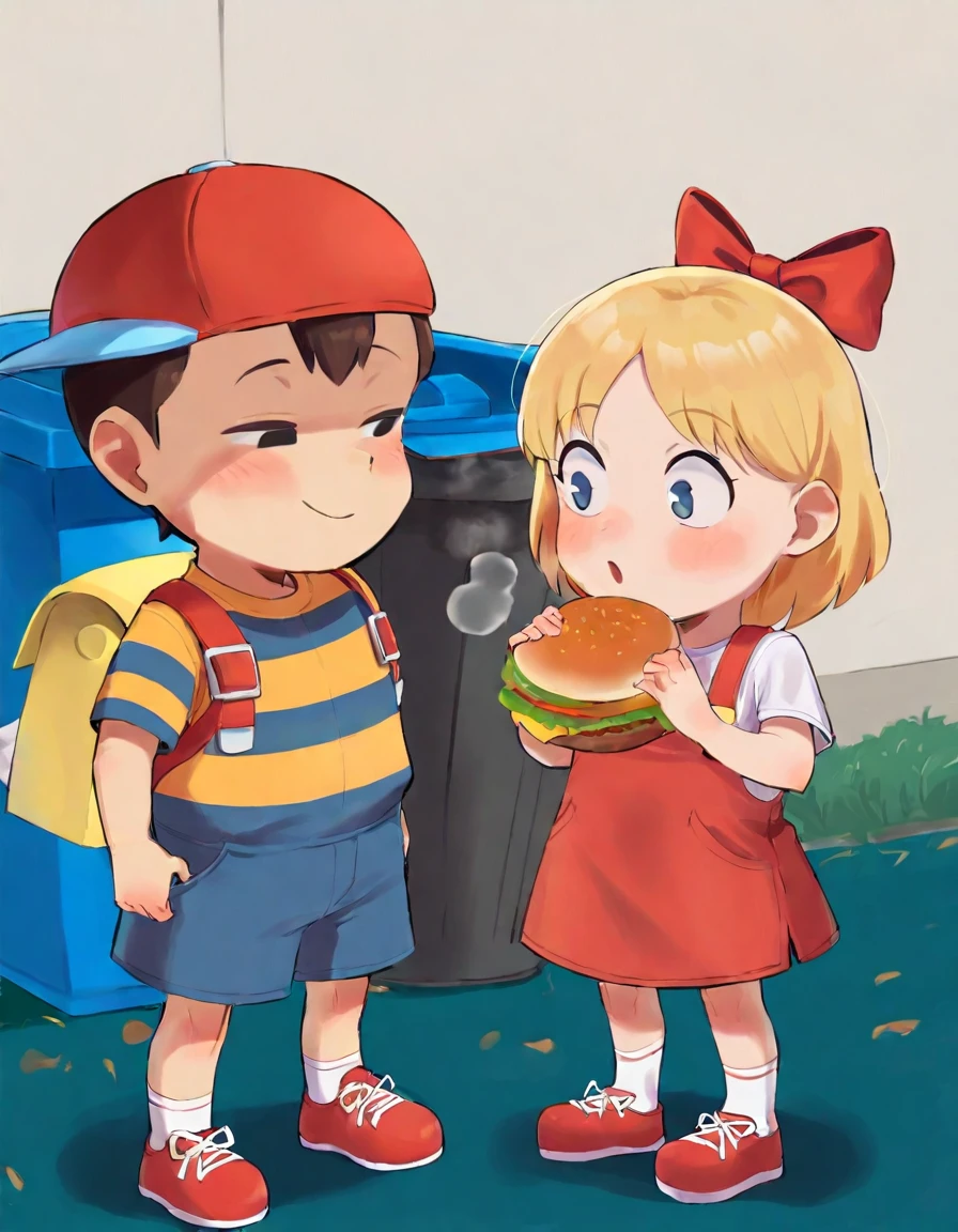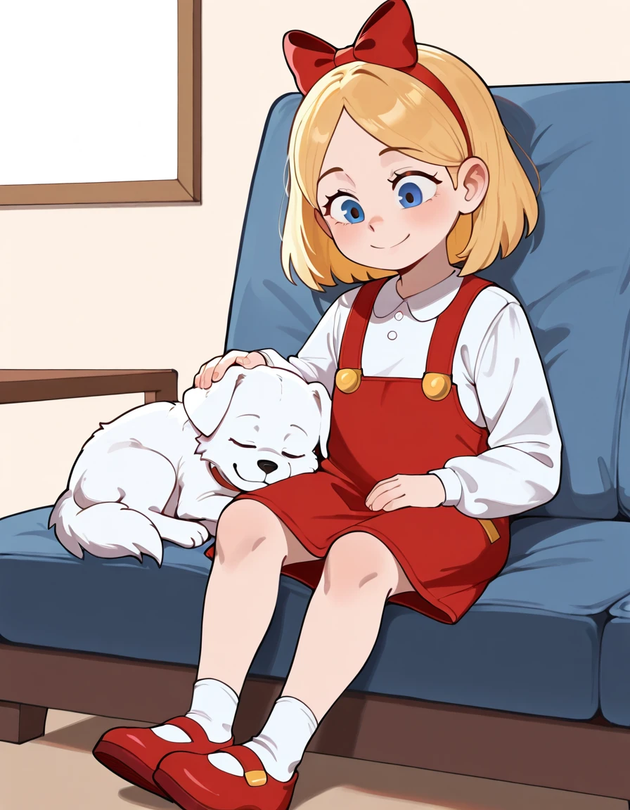 EBTCY, Anistyl, female child, blonde hair, parted bangs, medium hair, red hairbow, bangs, blue eyes, pacmaneyes, white shirt, red overall skirt, slippers, red footwear,