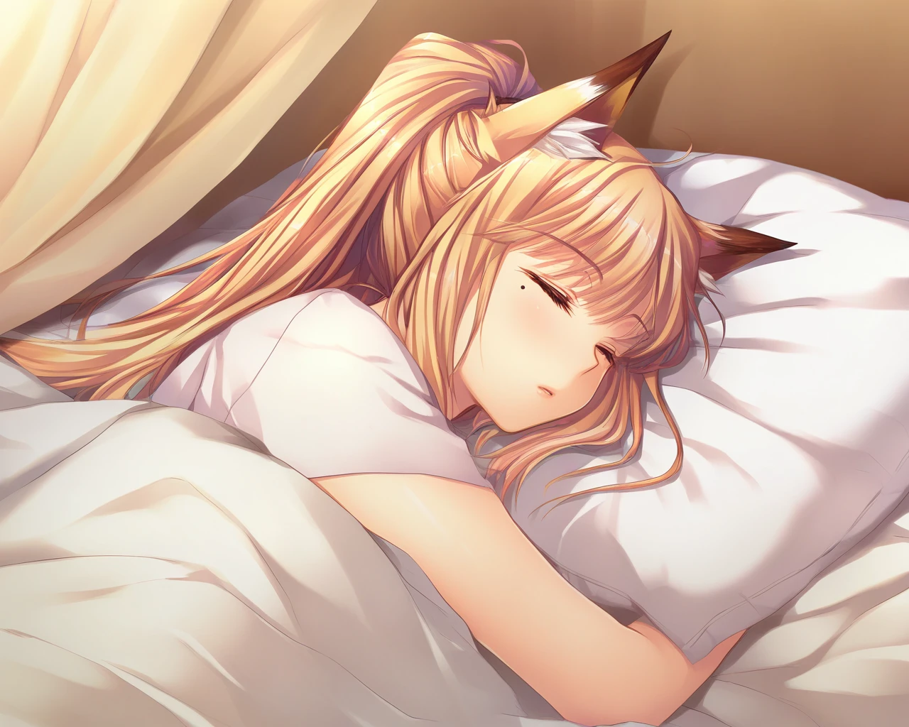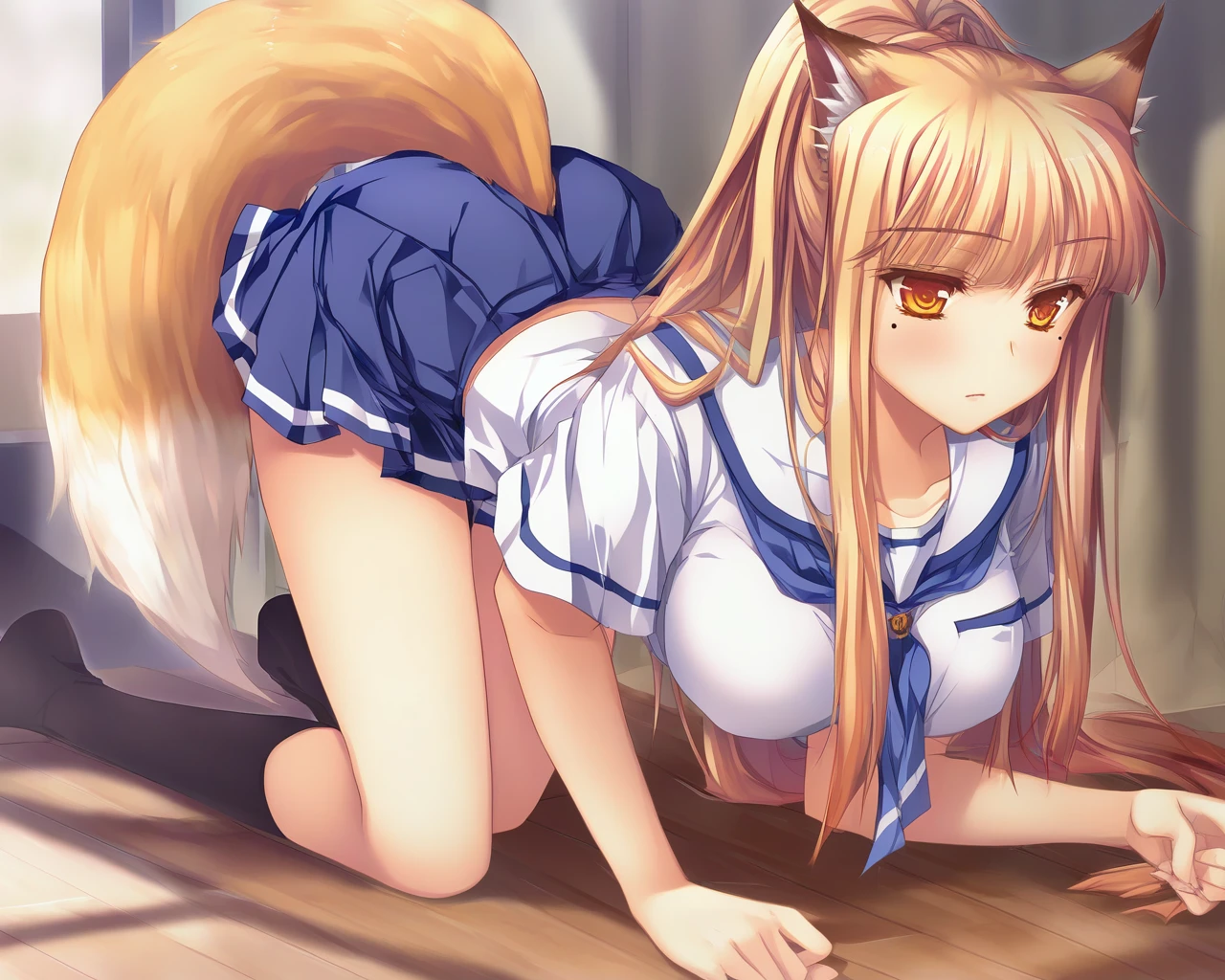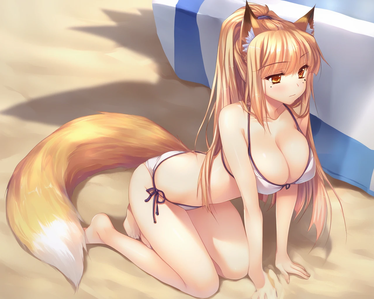 MiyamaKonIL, blonde, amber eyes, mole under eye, high ponytail, long hair, large breasts, fox ears, fox tail,