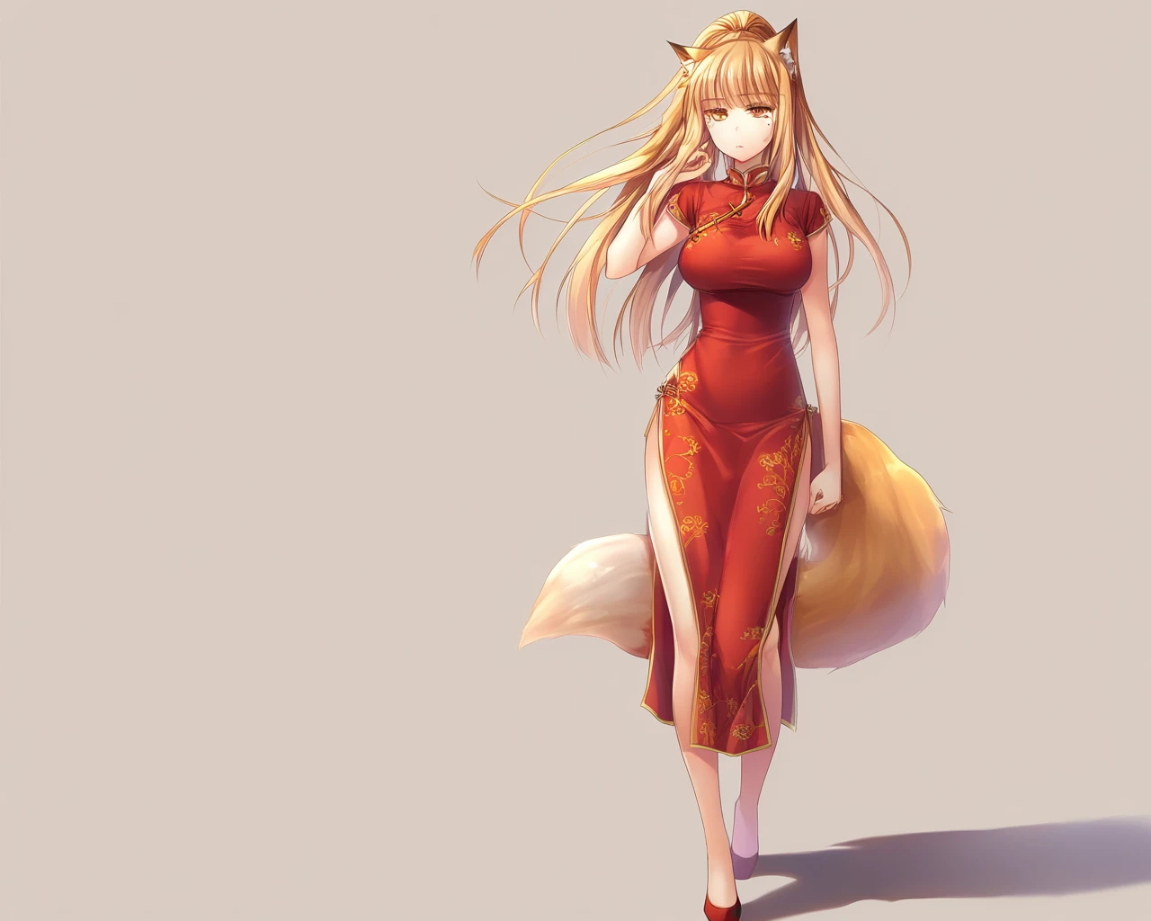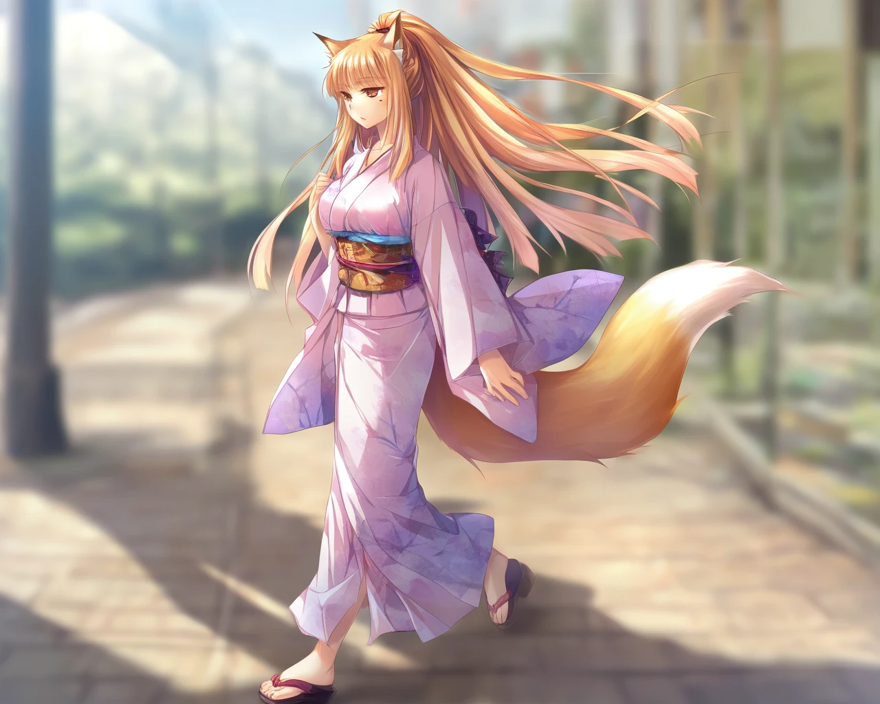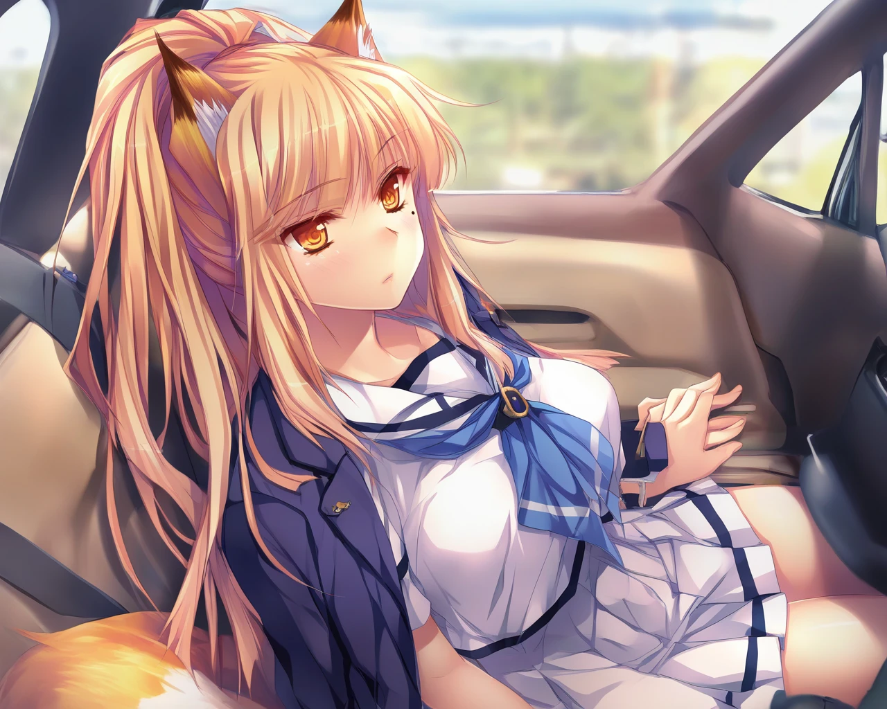 MiyamaKonIL, blonde, amber eyes, mole under eye, high ponytail, long hair, large breasts, fox ears, fox tail,