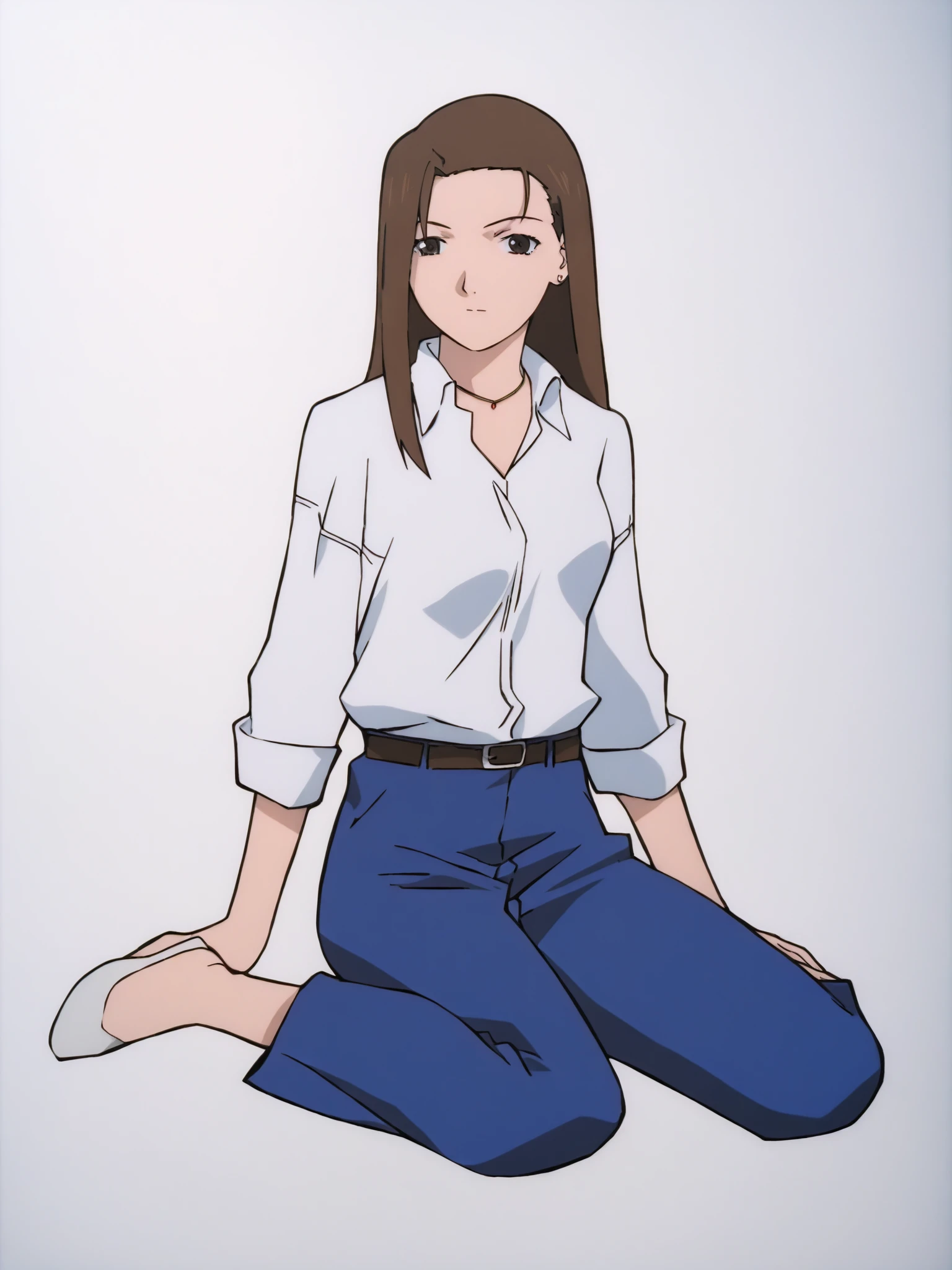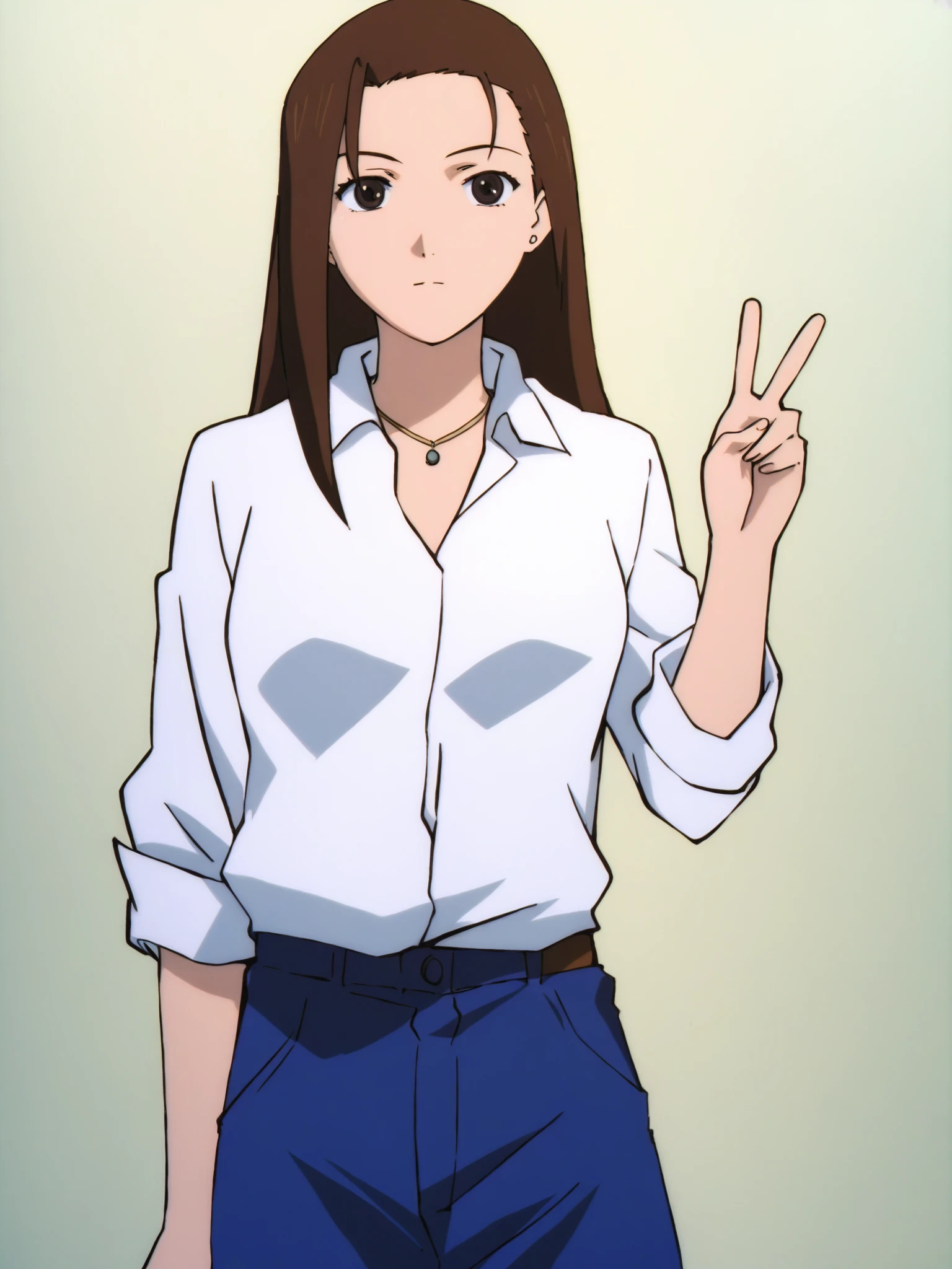 iwakura_mika_\(home2\), white collared shirt, necklace, blue pants, +long sleeves (if needed)