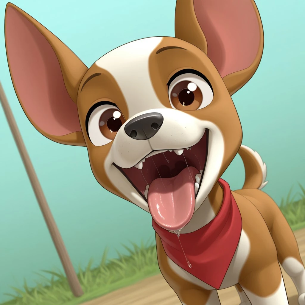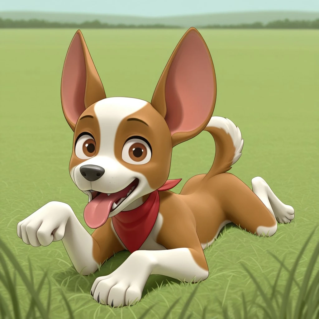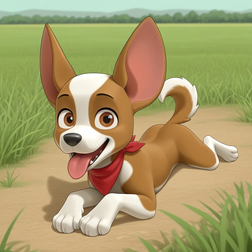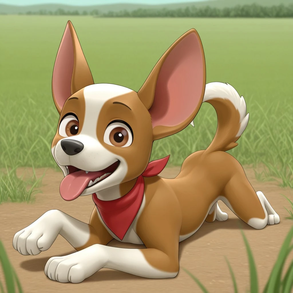 dog, chihuahua, white and brown fur, brown eyes, large dog ears, black nose, dog tail,