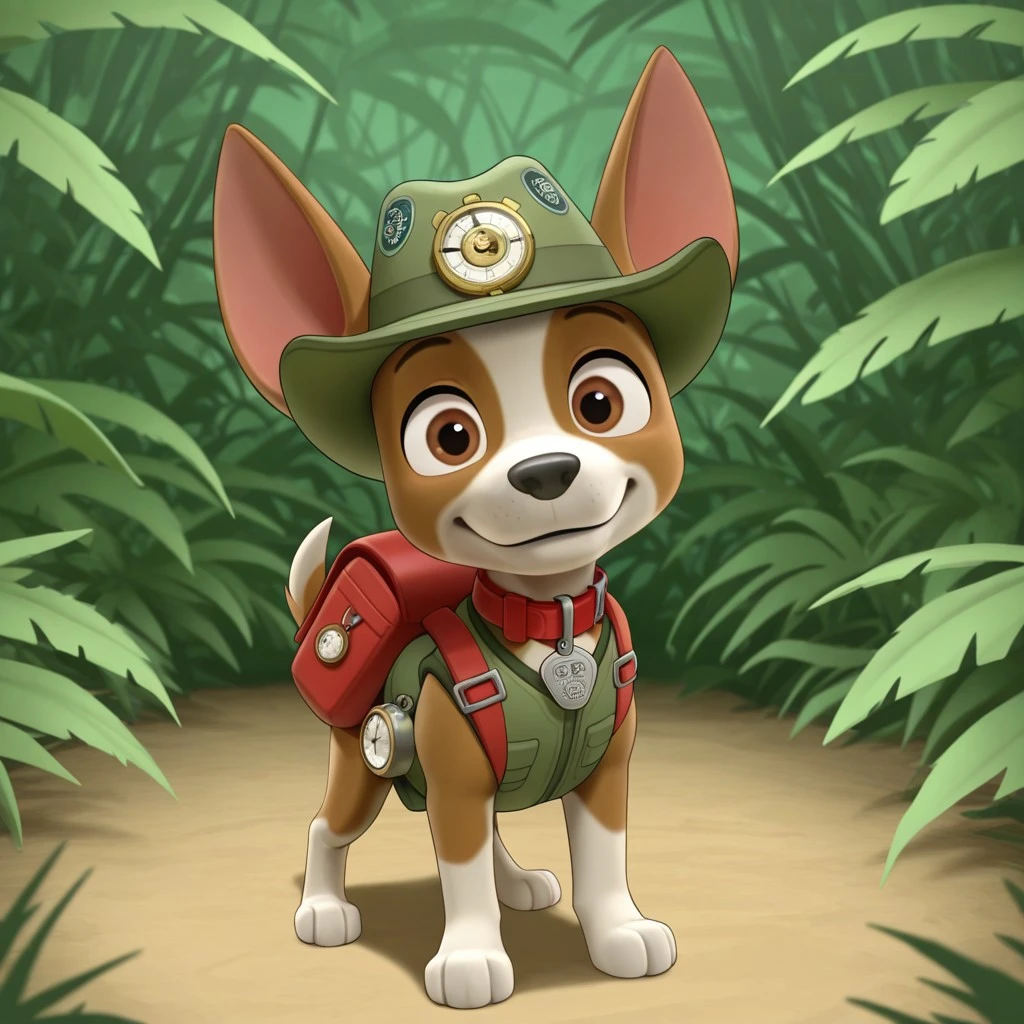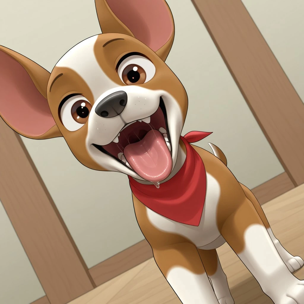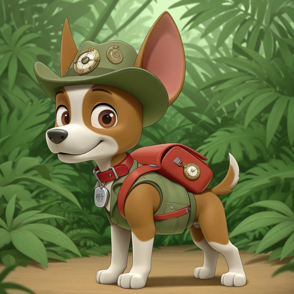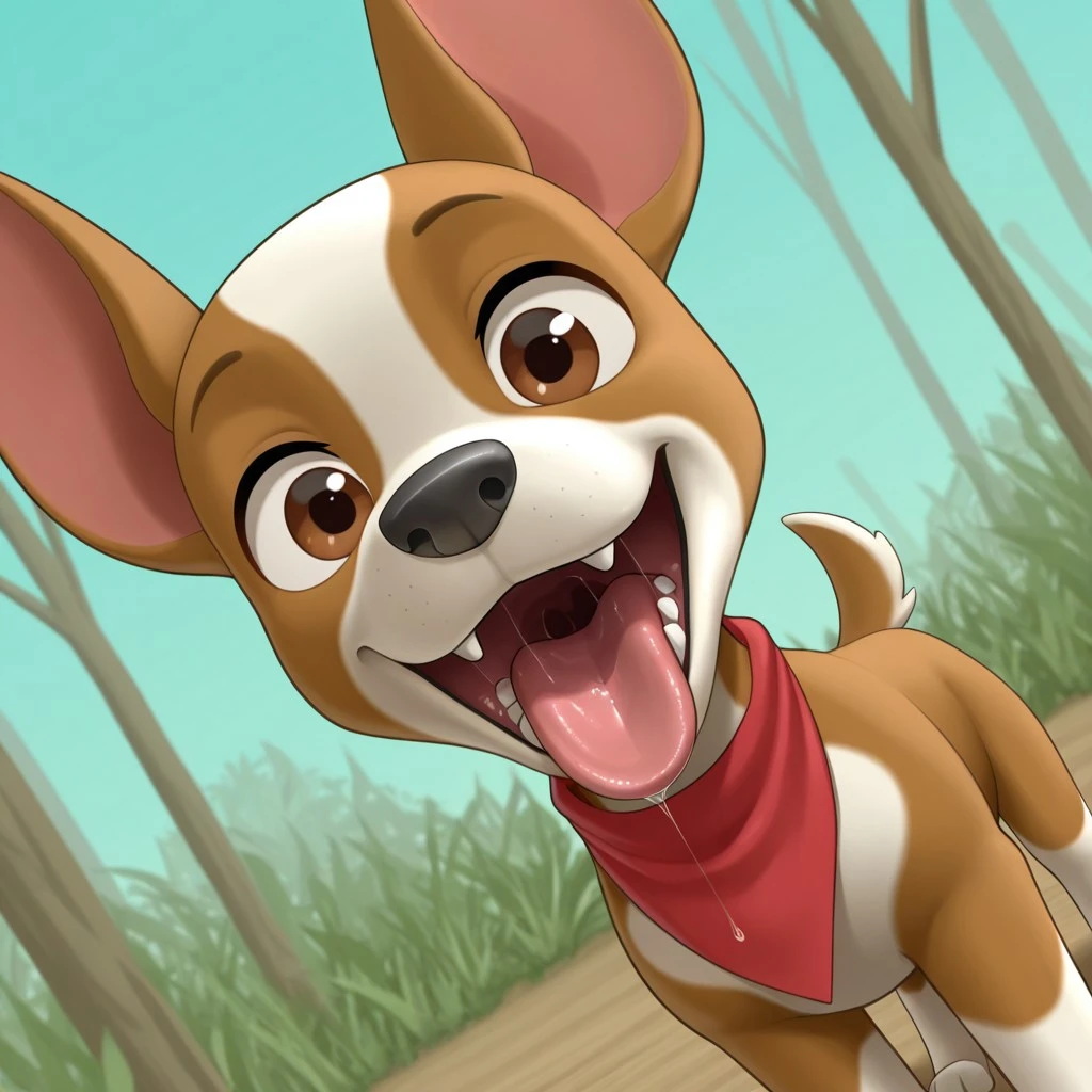 dog, chihuahua, white and brown fur, brown eyes, large dog ears, black nose, dog tail,
