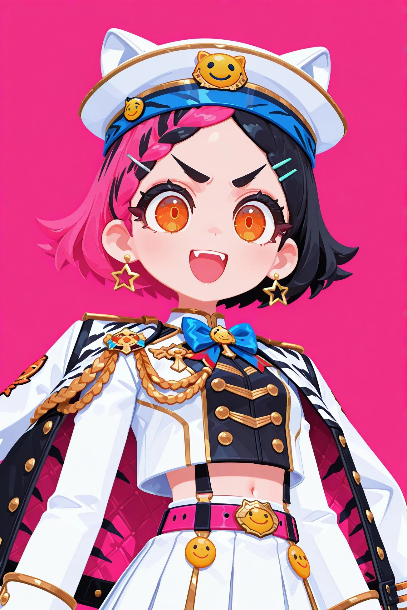 amemuraneri, button badge, animal hat, beret, animal print, tiger print, white hat, short hair, multicolored hair, two-tone hair, pink hair, black hair, streaked hair, black streaks, forehead, braided bangs, stray hair, hairpin, orange eyes, star earrings, blue bowtie, smiley face, gold trim, white jacket, jacket on shoulders, aiguillette, marching band, midriff, navel, suspenders, pink belt, pleated skirt, white skirt, black jacket, white socks, sneakers