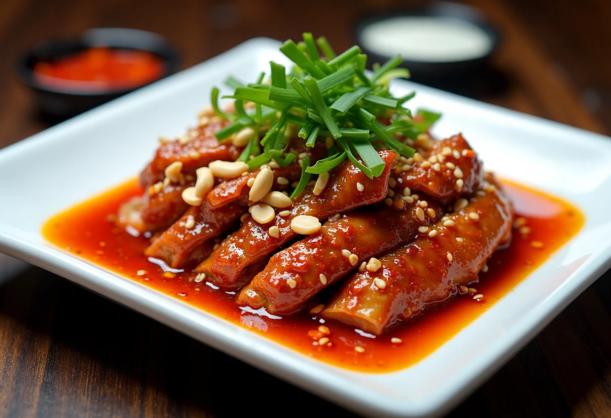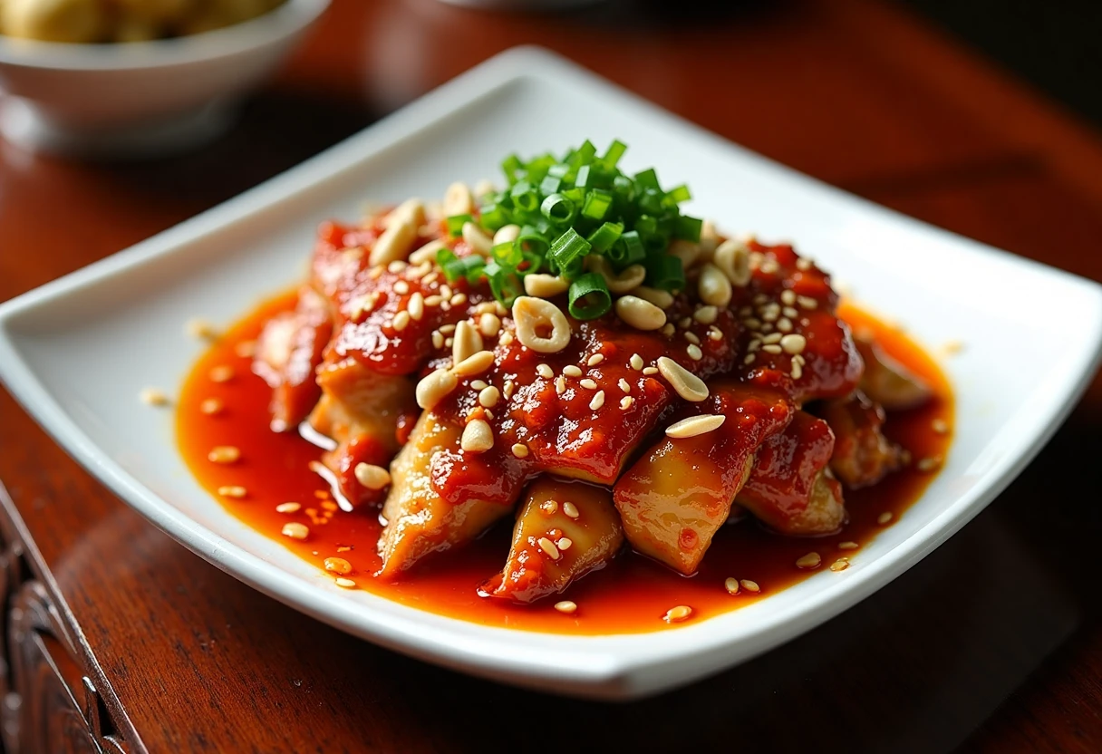 A chinese food lora,Steamed Chicken with Chili Sauce,Chinese phonetic alphabet:“kou shui ji”,It's important to note that this dish doesn't actually contain saliva. It's a Chinese idiom used to exaggerate how delicious and appetizing a dish is. The literal meaning is that the dish is so fragrant and tasty that it will make you drool.