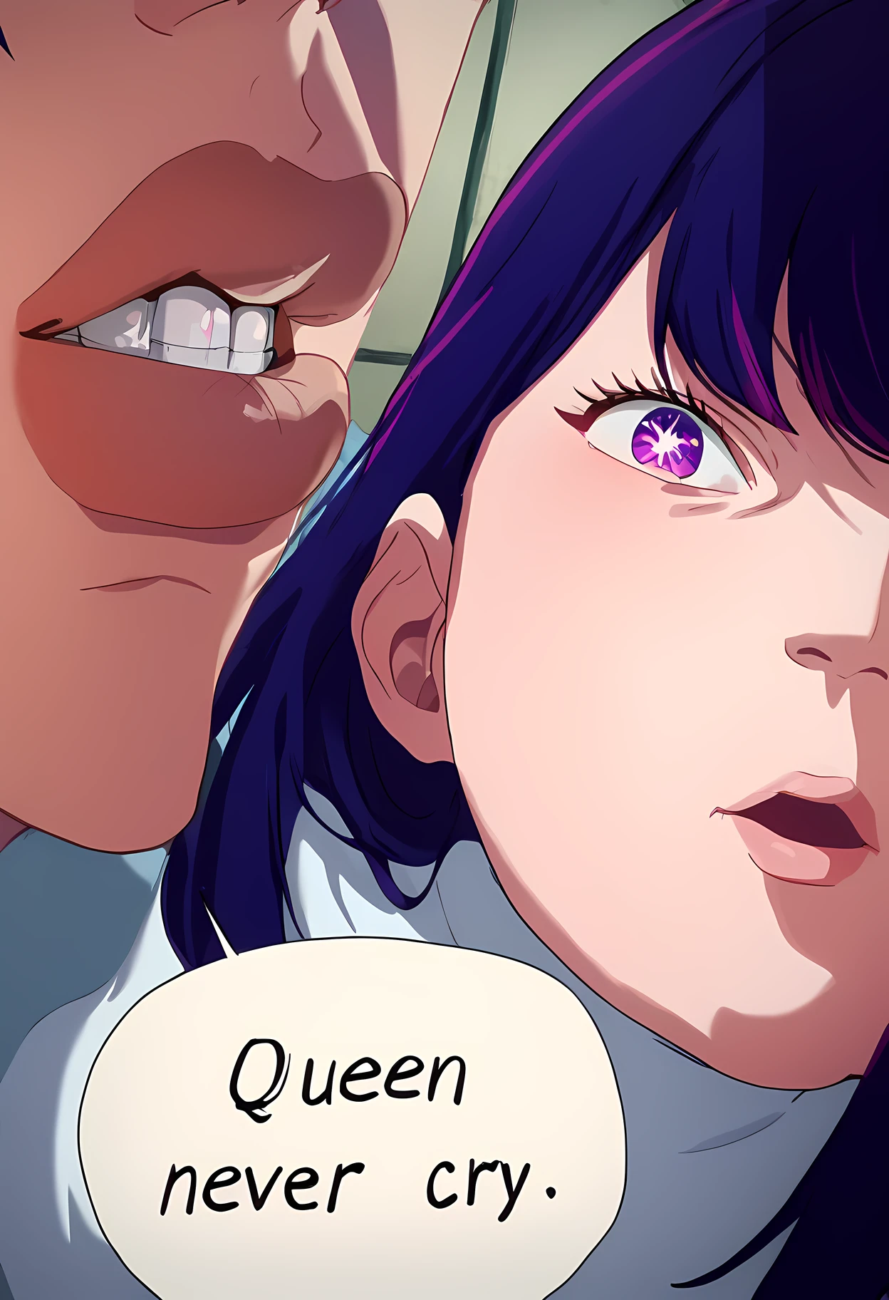 Trigger word: queen never cry, face out of frame, speech bubble "Queen Never Cry", text speech, text" Queen Never Cry"