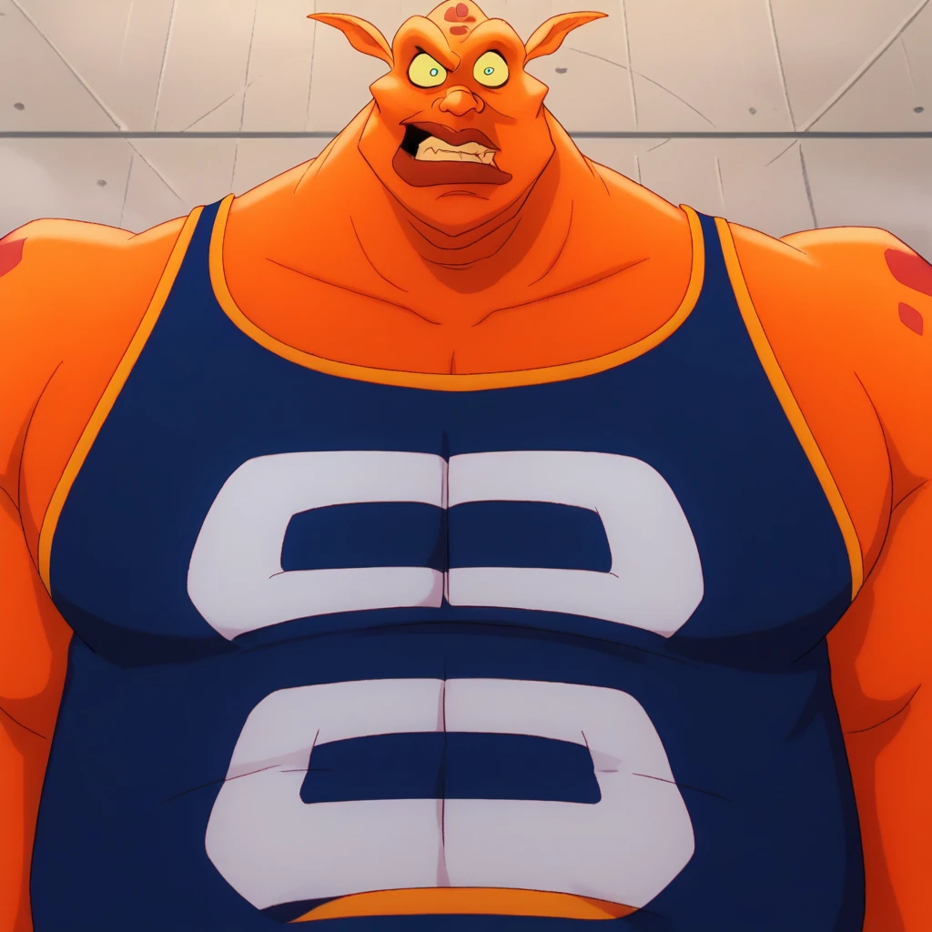 POUNDSPACEJAM, 1boy, solo, colored skin, orange skin, pointy ears, tank top,