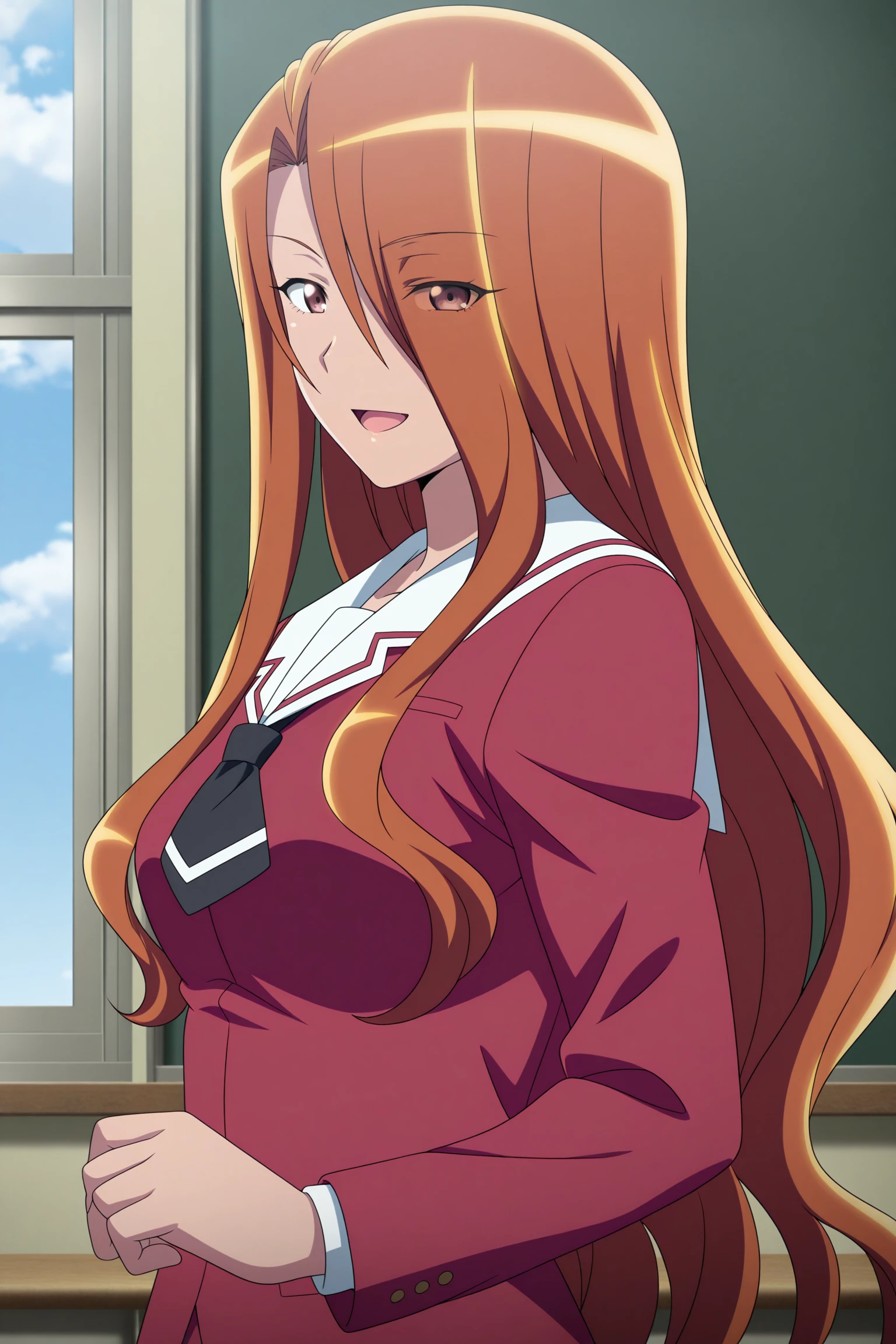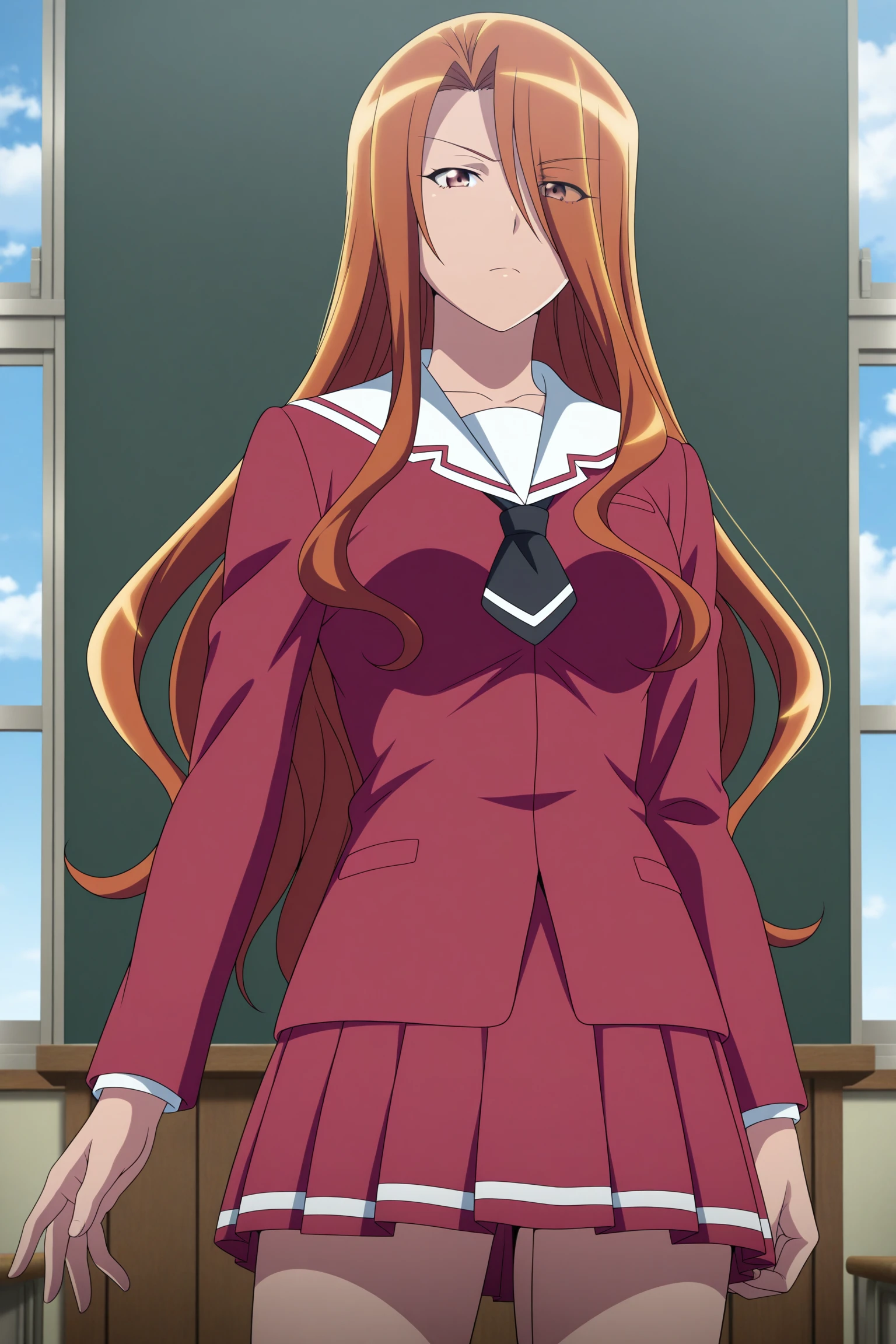 esumi kyouko, long hair, brown hair, curtained hair, hair over one eye, eyes visible through hair, brown eyes, long sleeves, red jacket, white shirt, white sailor collar, black necktie, short necktie, red skirt, pleated skirt, striped skirt, white socks, kneehighs, brown footwear, loafersSchool Uniform (Spring/Fall)