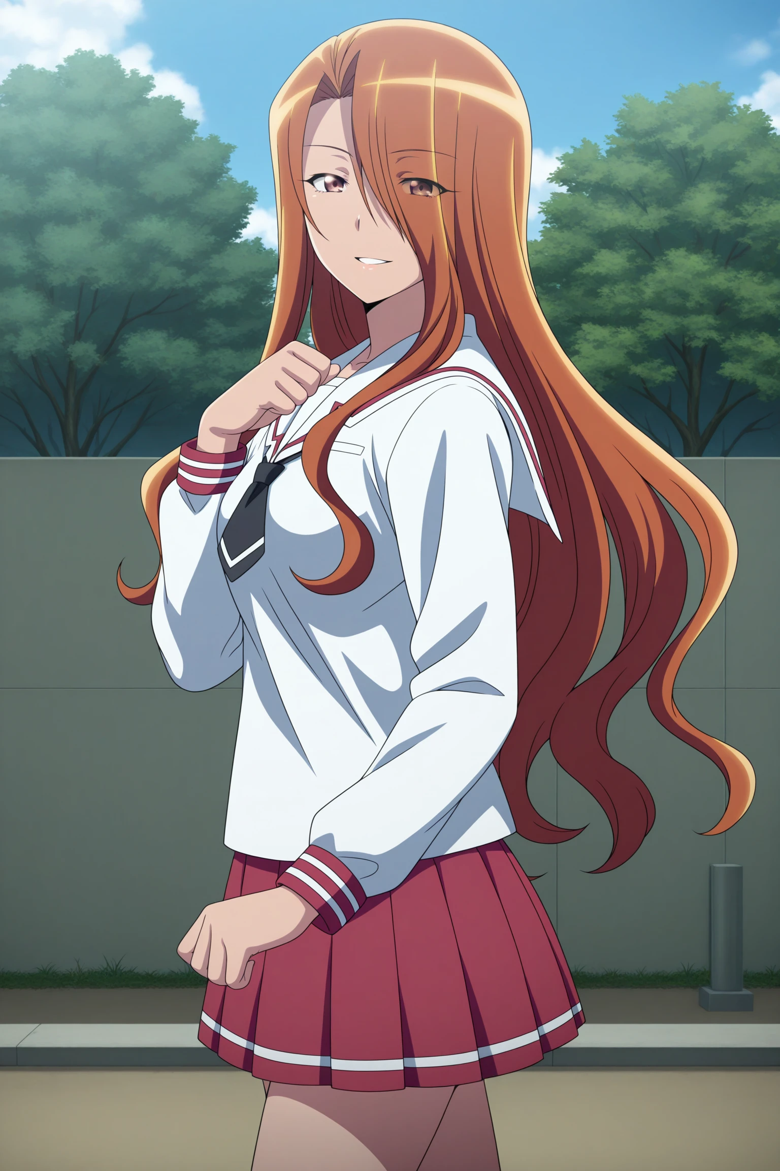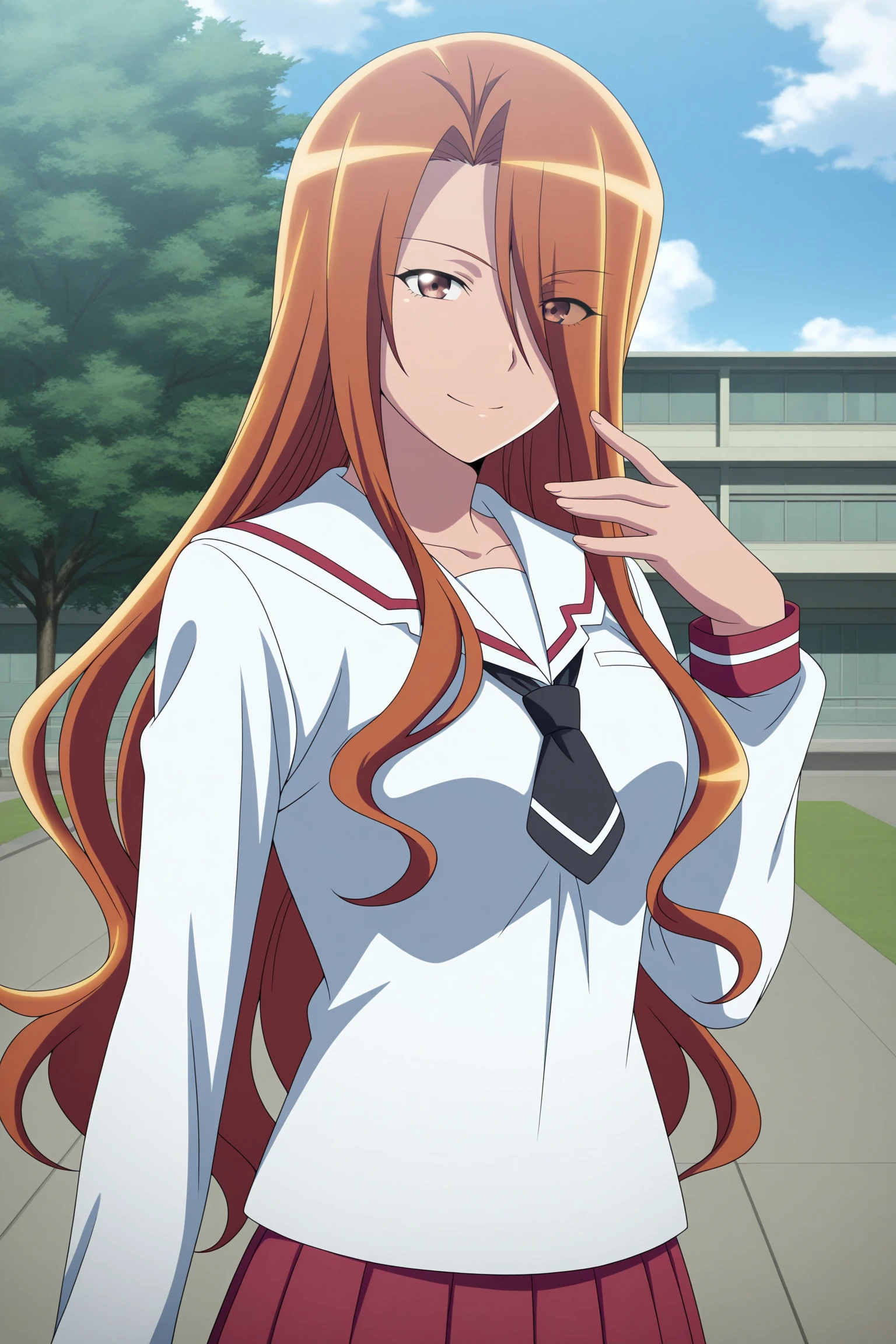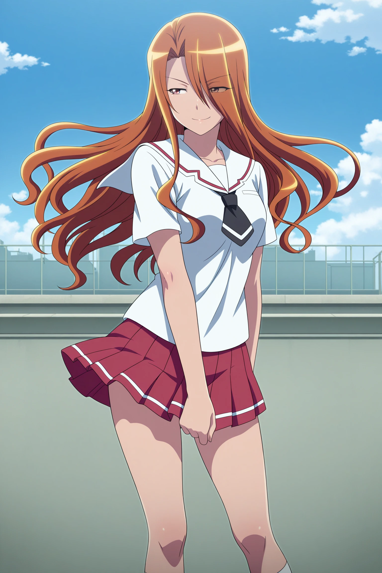 esumi kyouko, long hair, brown hair, curtained hair, hair over one eye, eyes visible through hair, brown eyes, long sleeves, white shirt, white sailor collar, black necktie, short necktie, red skirt, pleated skirt, striped skirt, white socks, kneehighs, brown footwear, loafersSchool Uniform (Summer)