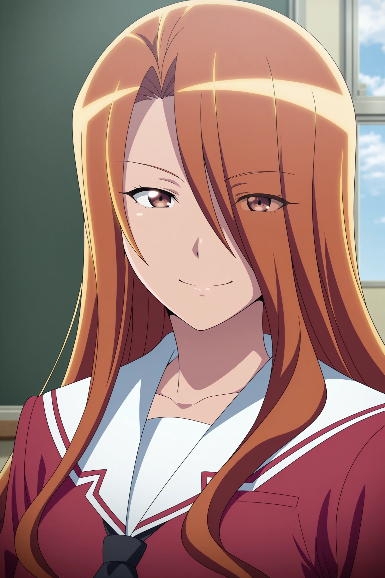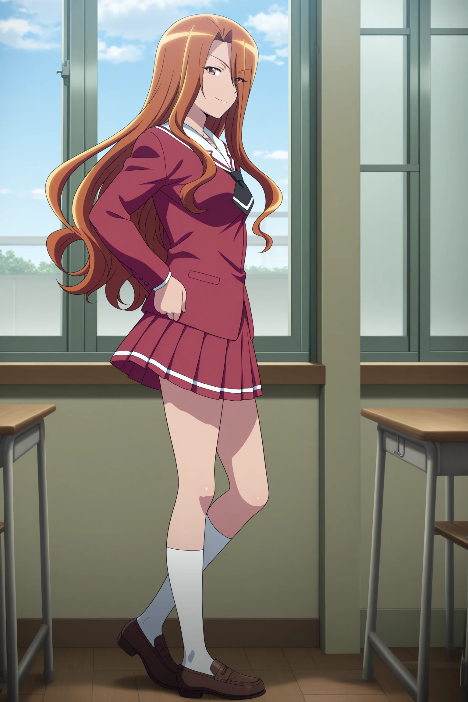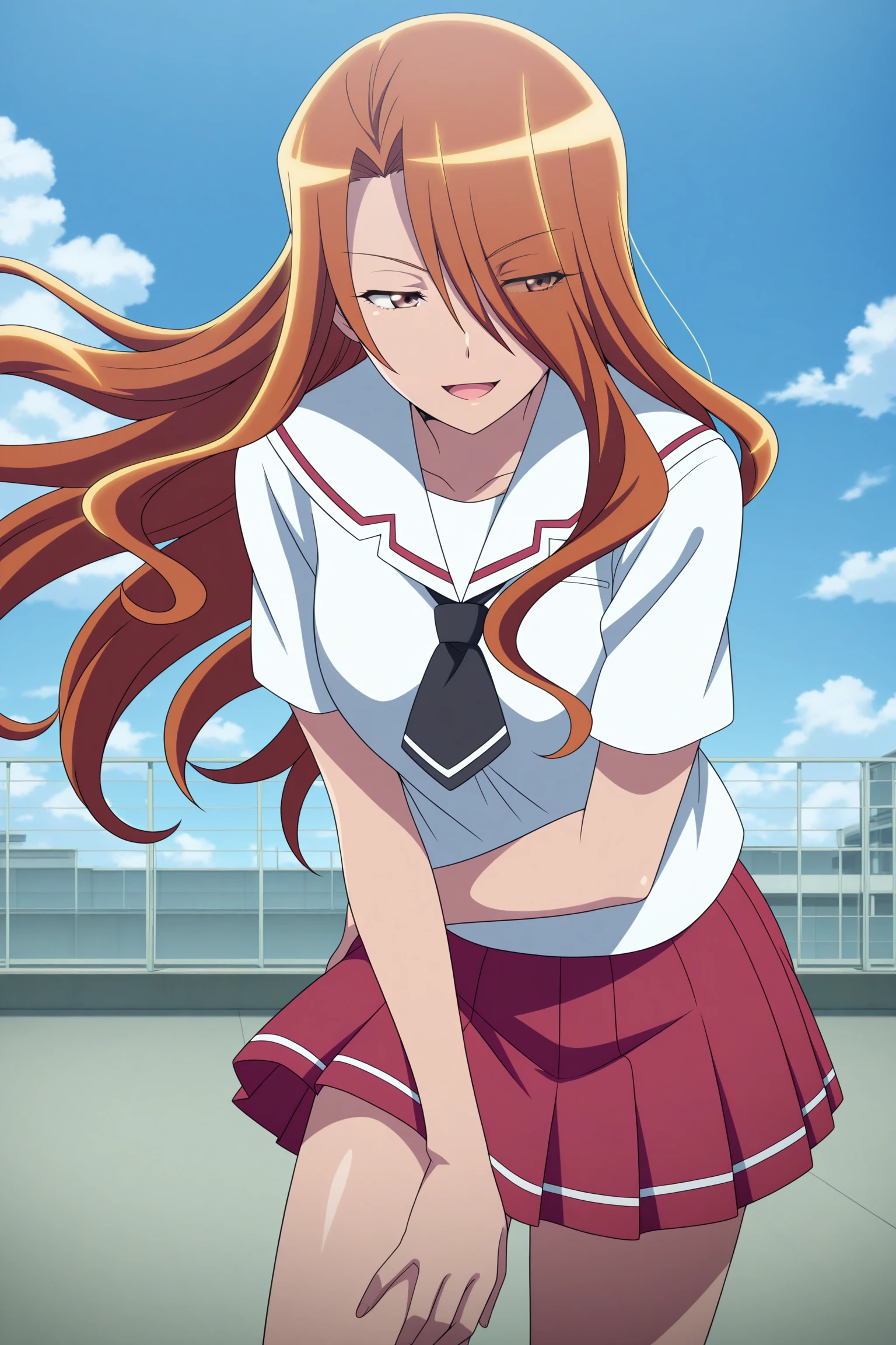 esumi kyouko, long hair, brown hair, curtained hair, hair over one eye, eyes visible through hair, brown eyes, long sleeves, white shirt, white sailor collar, black necktie, short necktie, red skirt, pleated skirt, striped skirt, white socks, kneehighs, brown footwear, loafersSchool Uniform (Summer)