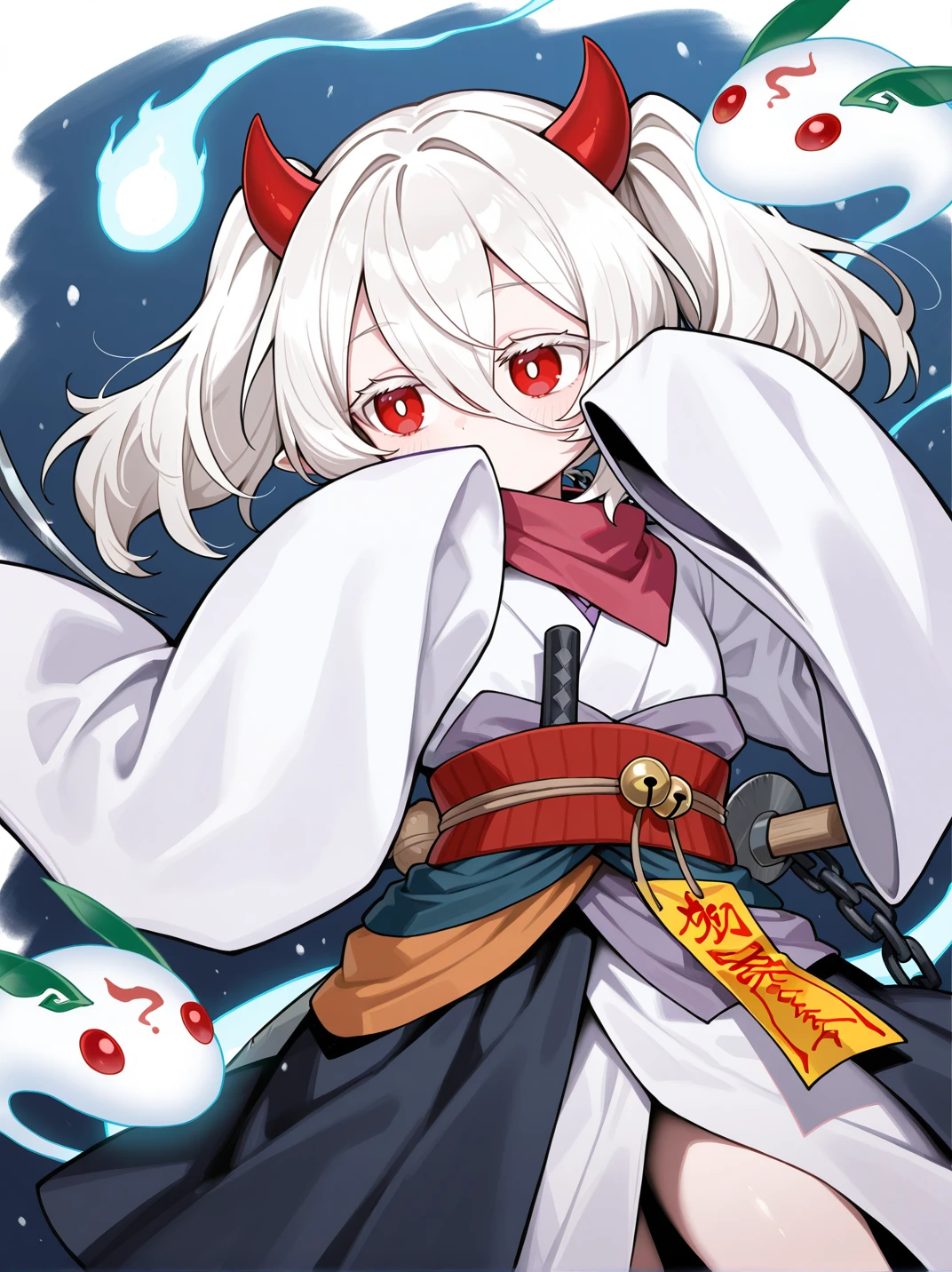 Tags (character1-other): sarashi,clog sandals,tabi, torn clothes,brown kimono,obi,scythe,kanata,ghost rabbit,ofuda