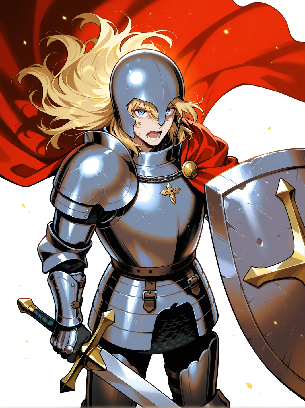 Tags (character4):NOBLEMAN OF CROSSOUT,1boy, holding, male focus, weapon, sword, holding weapon, red cape, holding sword, helmet, gauntlets, shield, full armor, holding shield, plate armor,offical style
