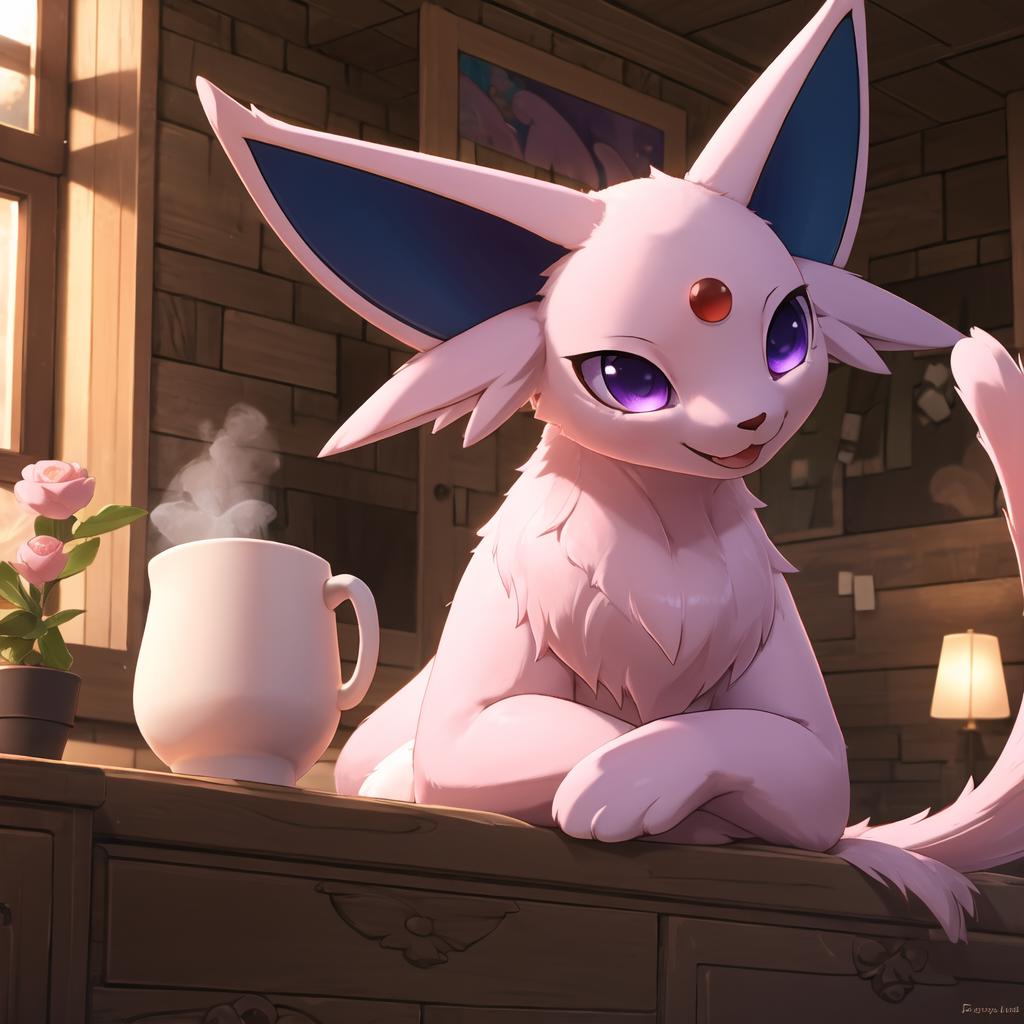 <lora:Espeon_by_Spooklly_V007:1>, espeon, cat , pokemon, pink pokemon, purple eyes, tail,