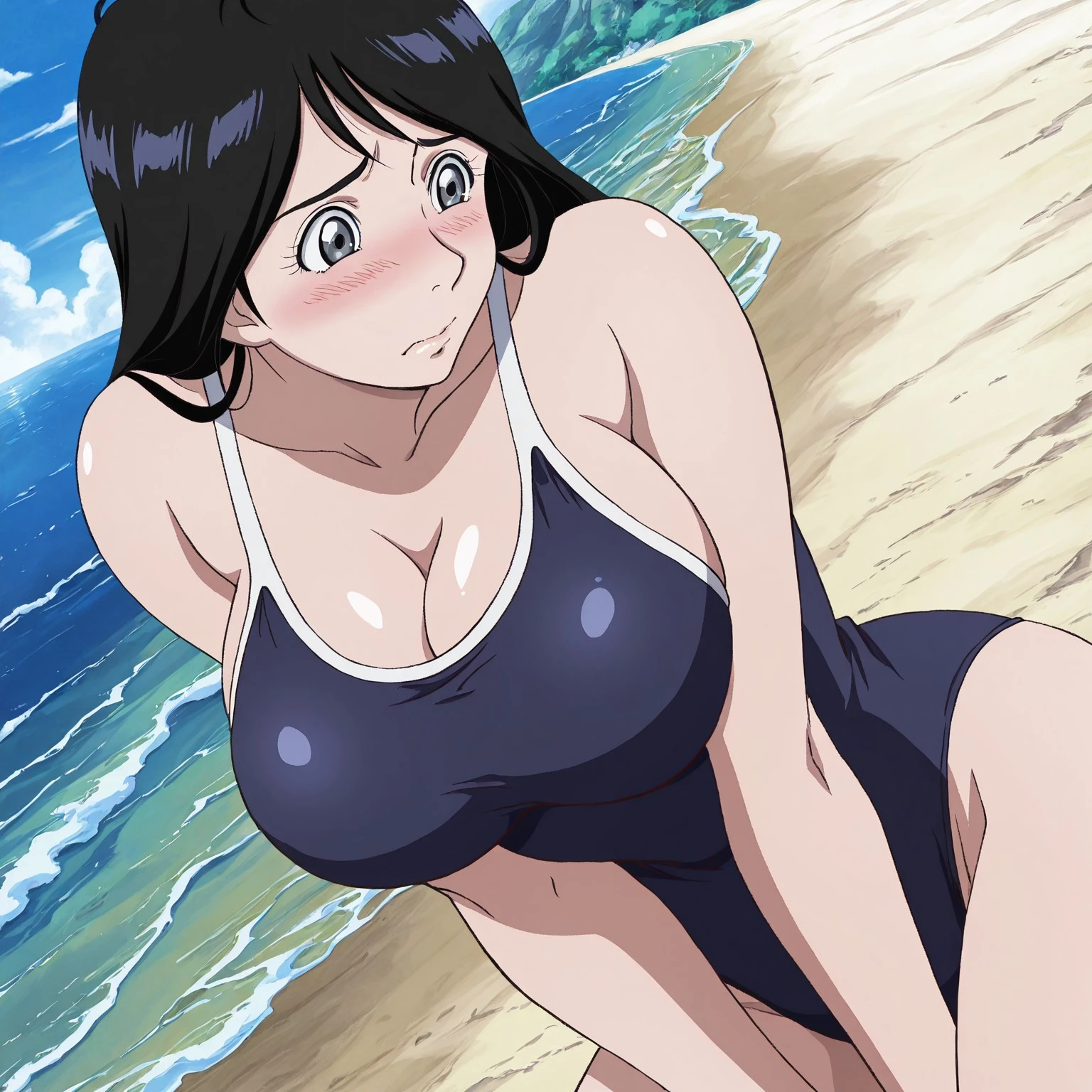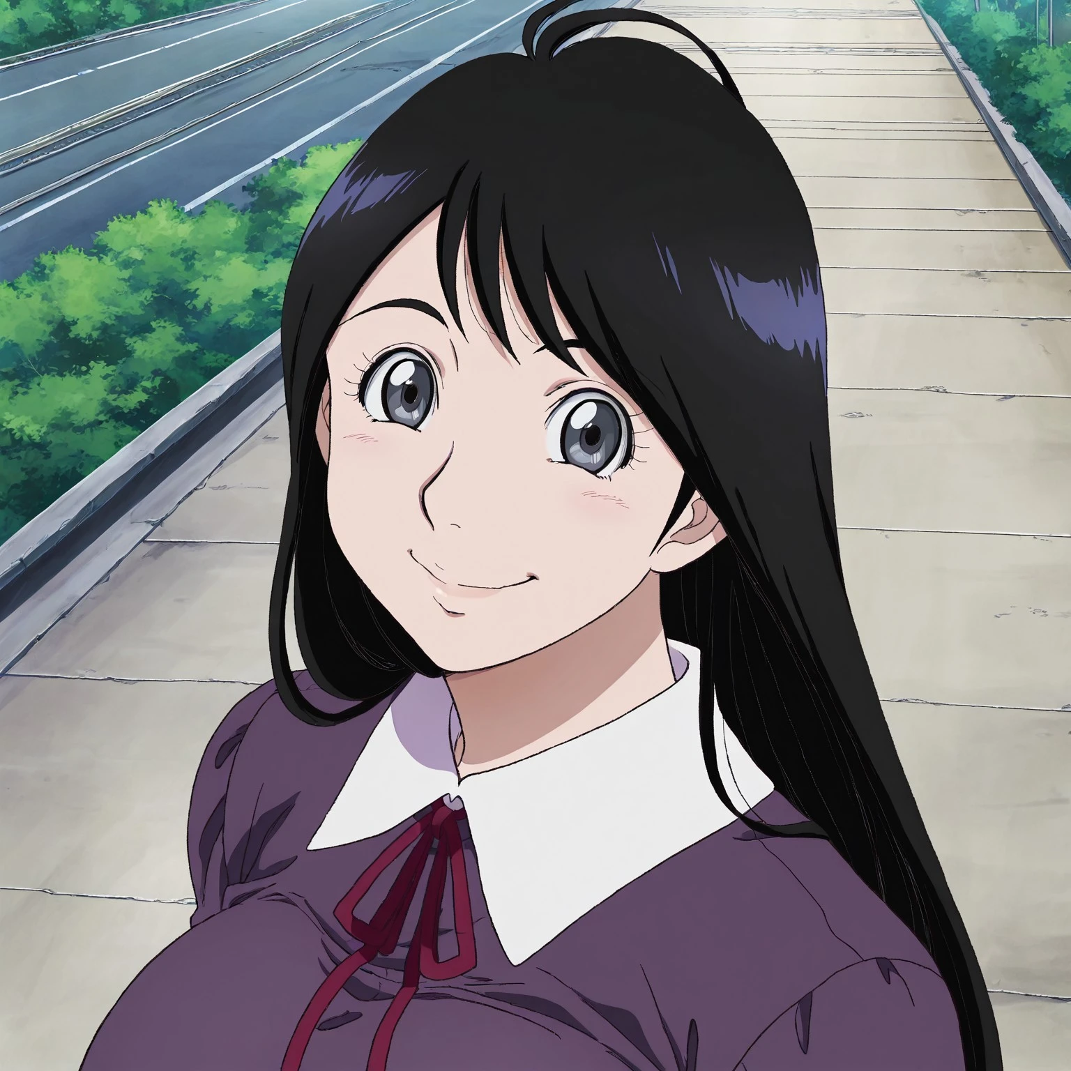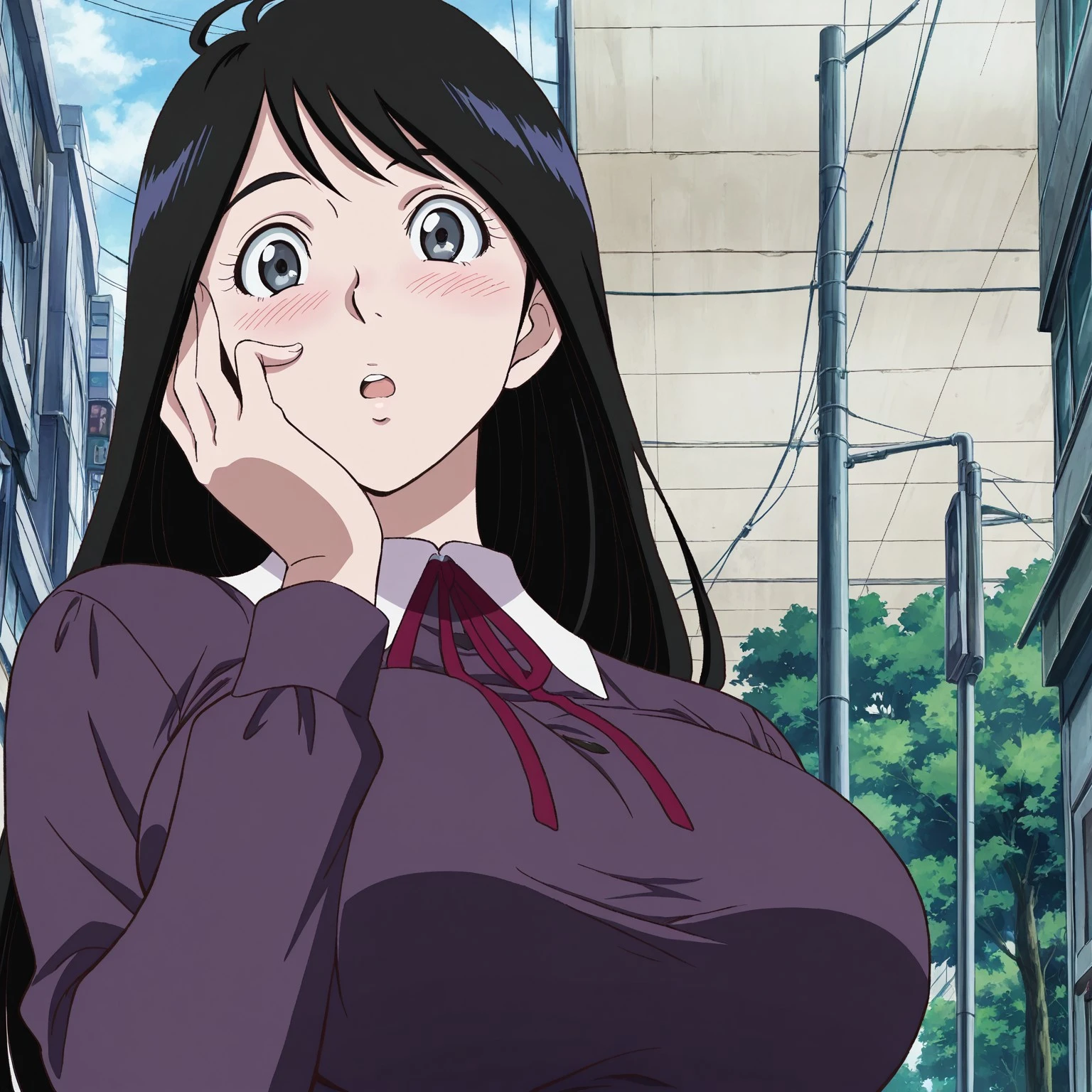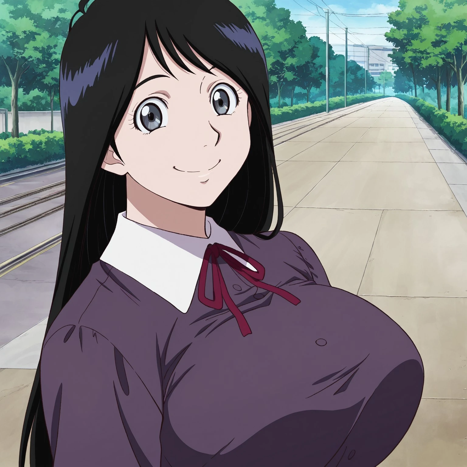 minanakanotaniam, accurate art style, female with long black hair, grey eyes, very large breasts, lips, purple school uniform, red seifuku ribbon, black waist belt, short purple skirt, dark blue socks, brown shoes