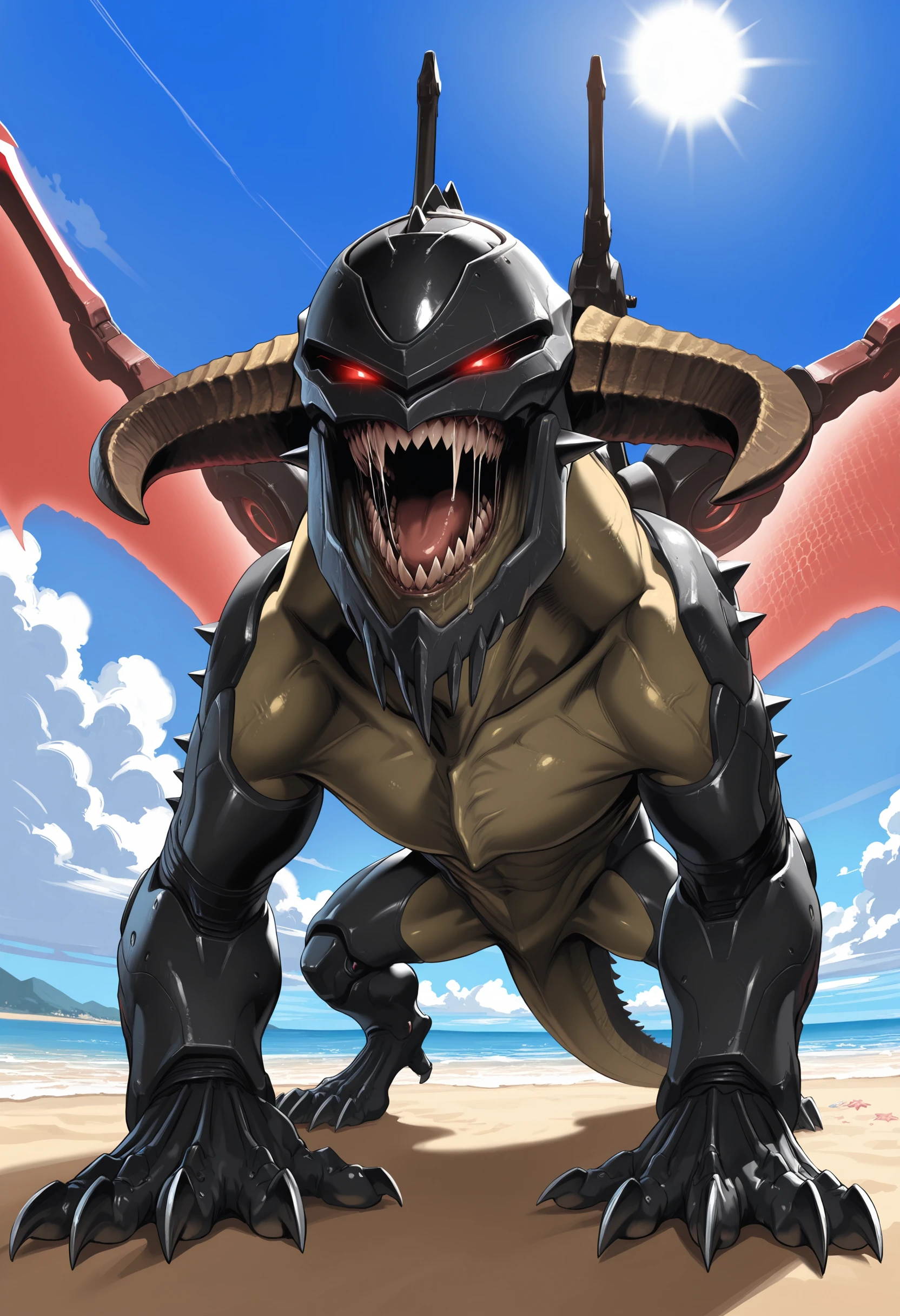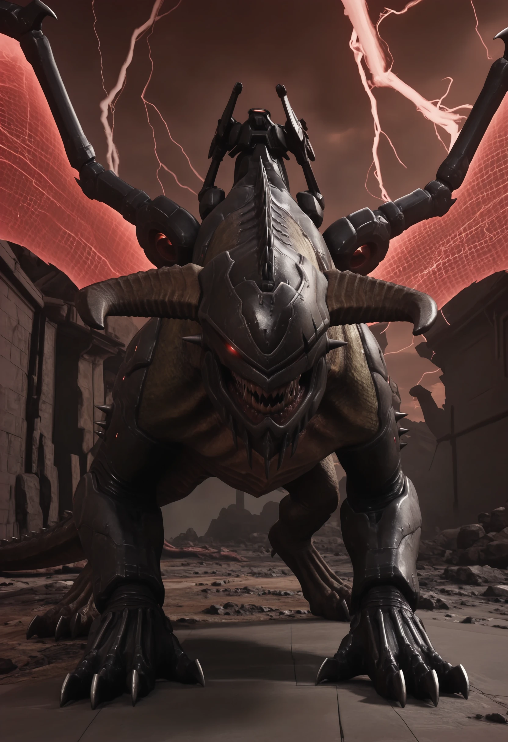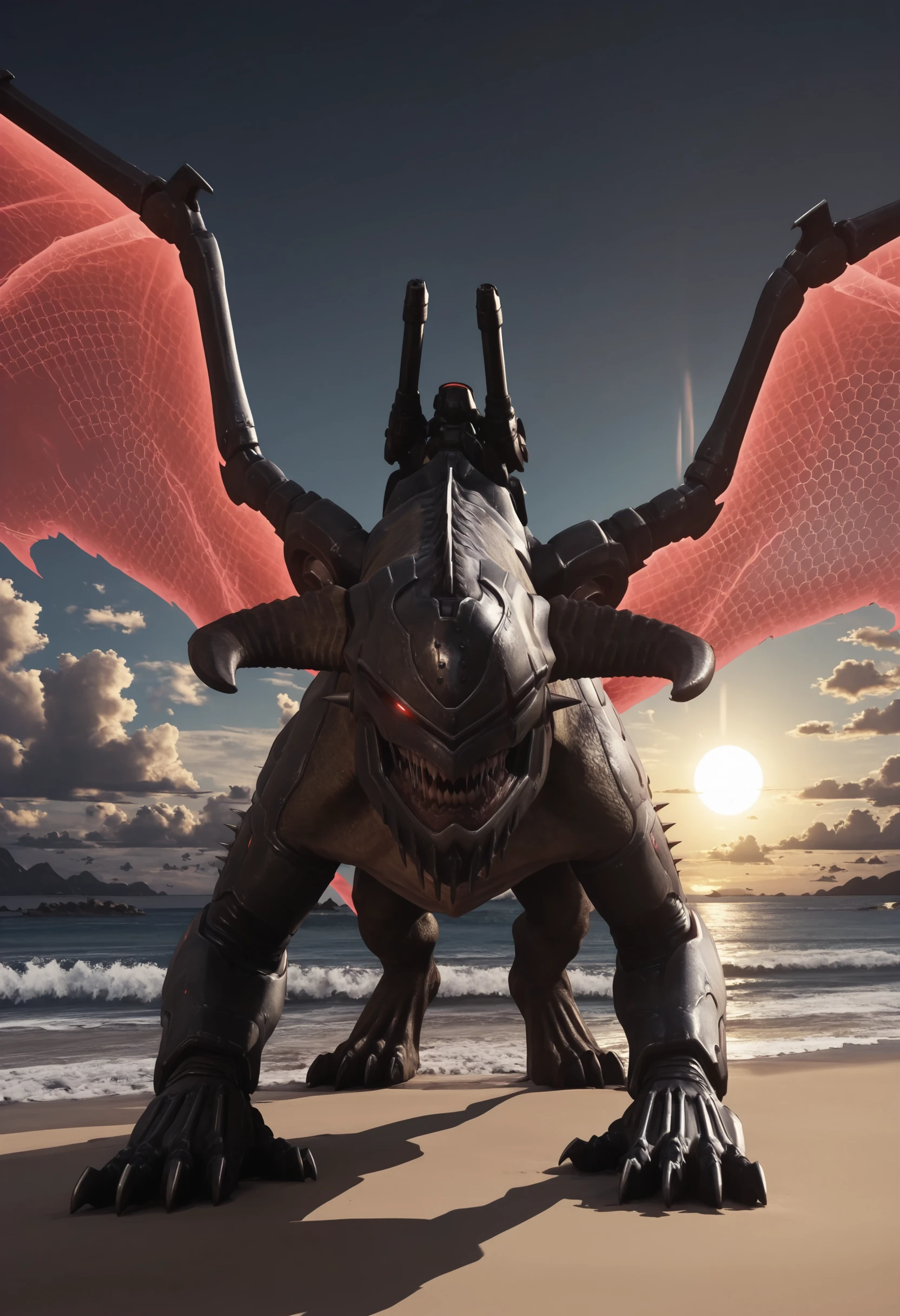 monster, sharp teeth, horns, claws, red eyes, glowing eyes, tail, mechanical wings