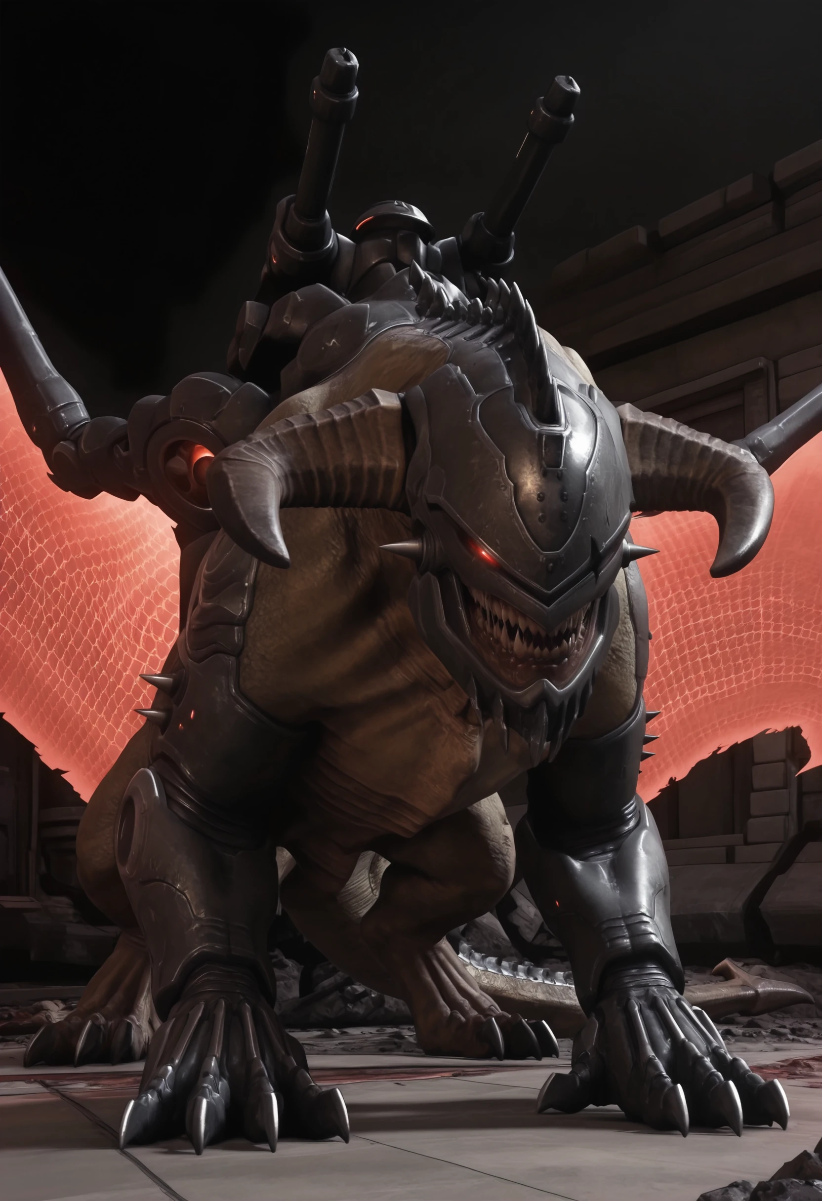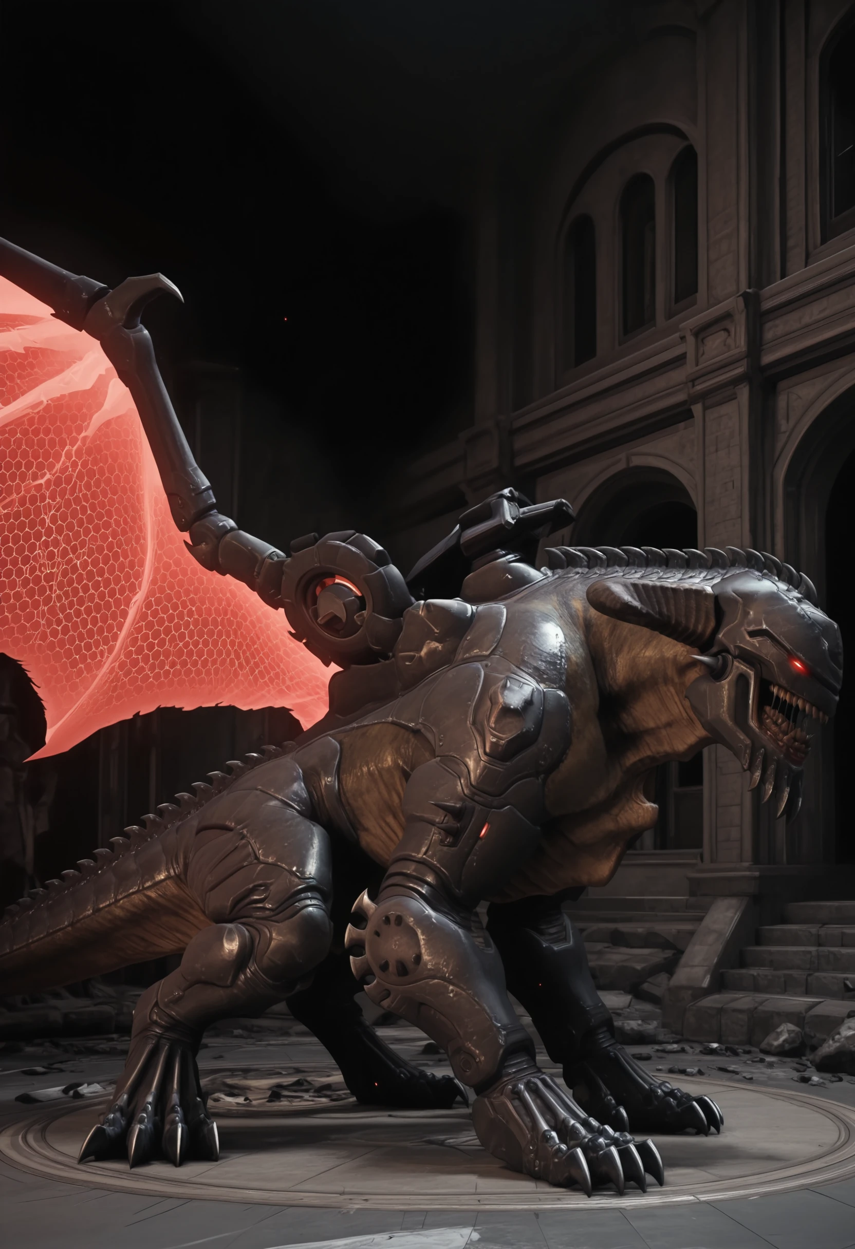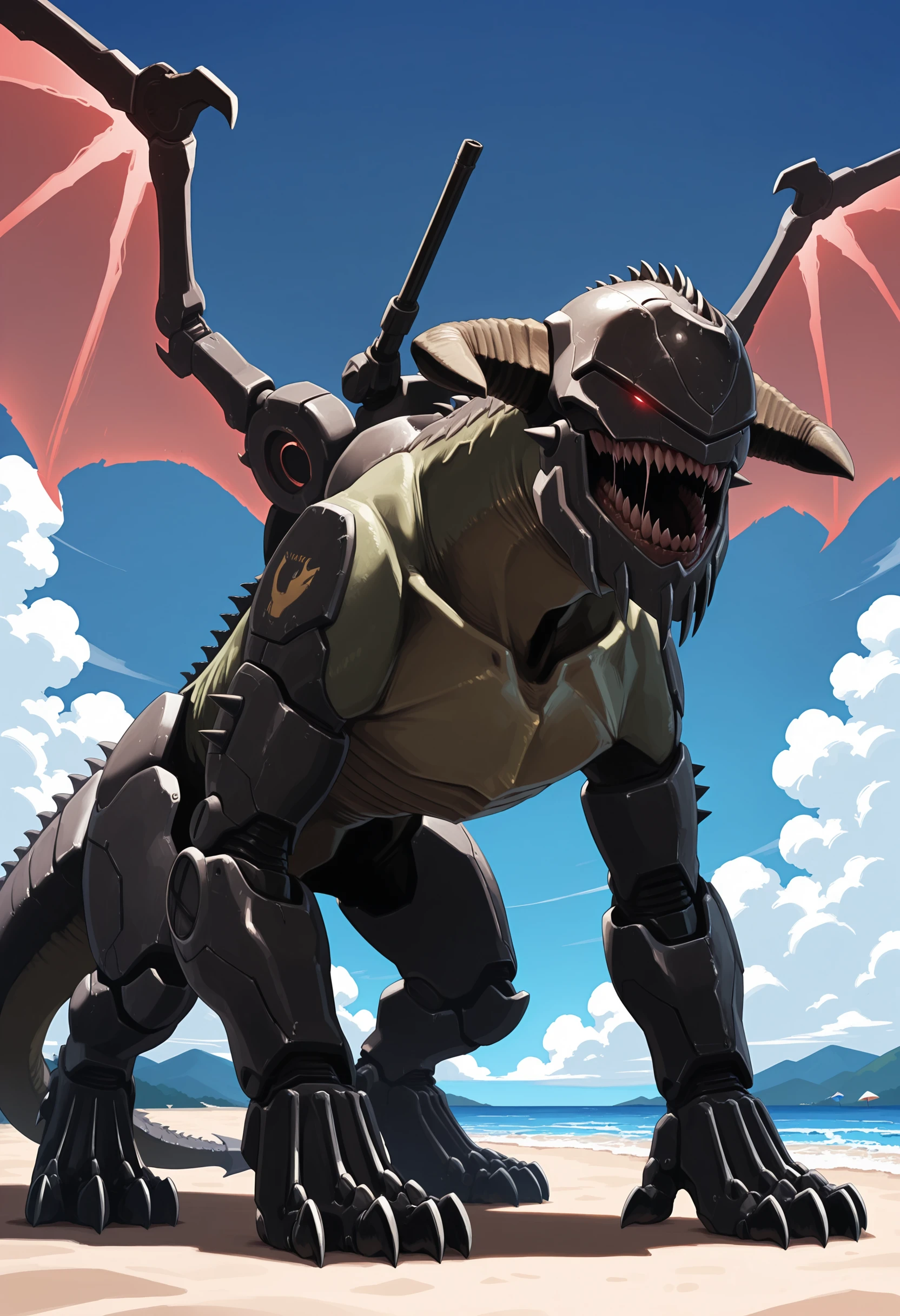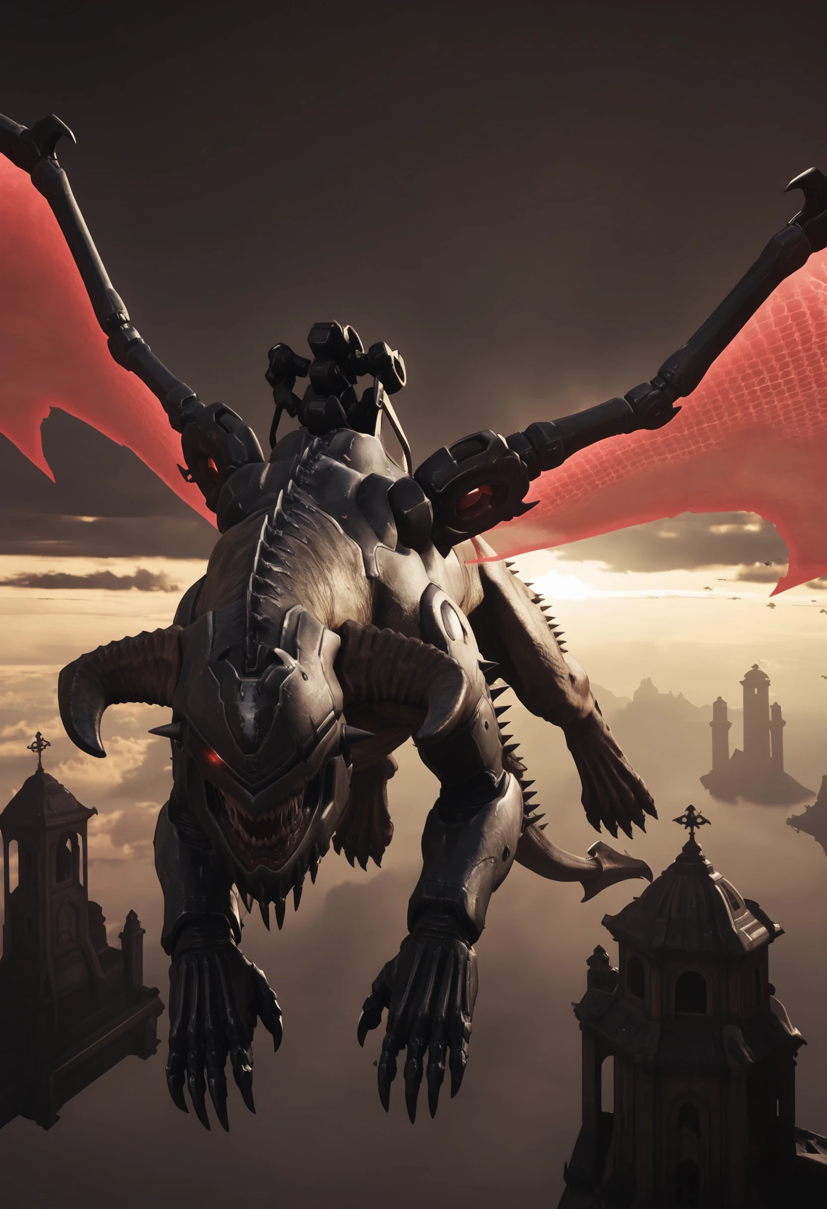 monster, sharp teeth, horns, claws, red eyes, glowing eyes, tail, mechanical wings