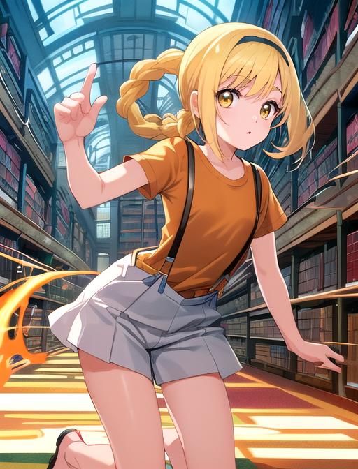 Additional words that may help: blonde hair, hair loops, yellow eyes