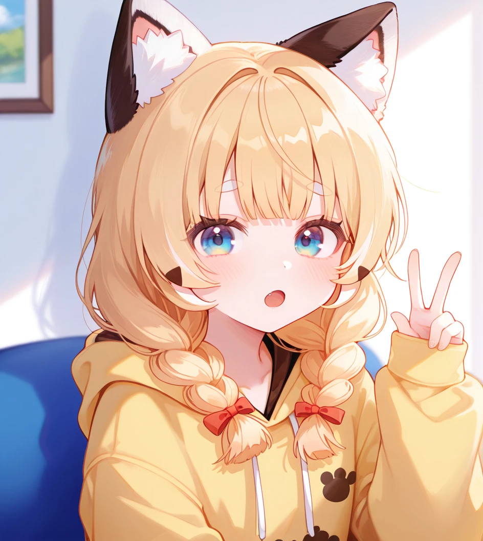 1girl, solo, long hair, bangs, blue eyes, blonde hair, animal ears, hair bow, virtual youtuber, twin braids, animal ear fluff, tail