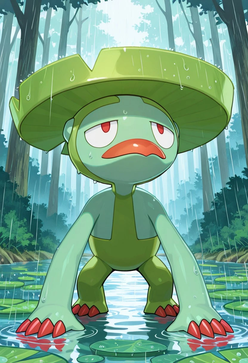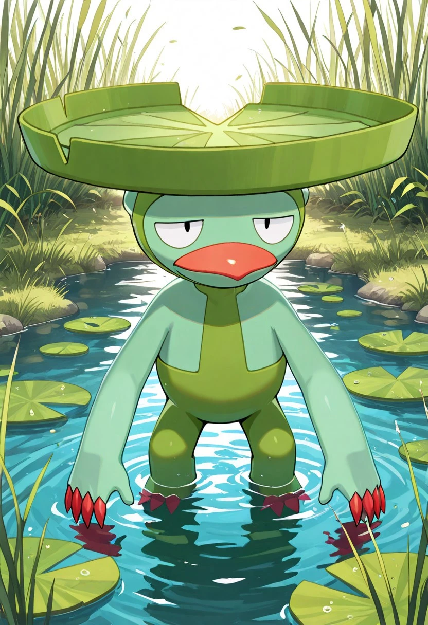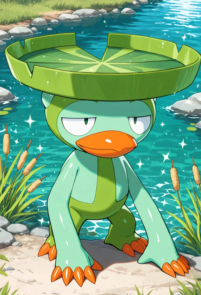 Shiny Tags: Shiny_lombre, neon green skin, dark green lilypad on head, orange beak, orange claws