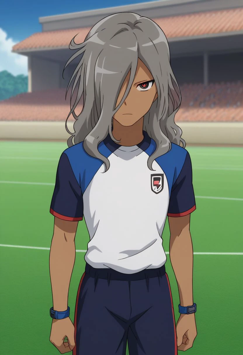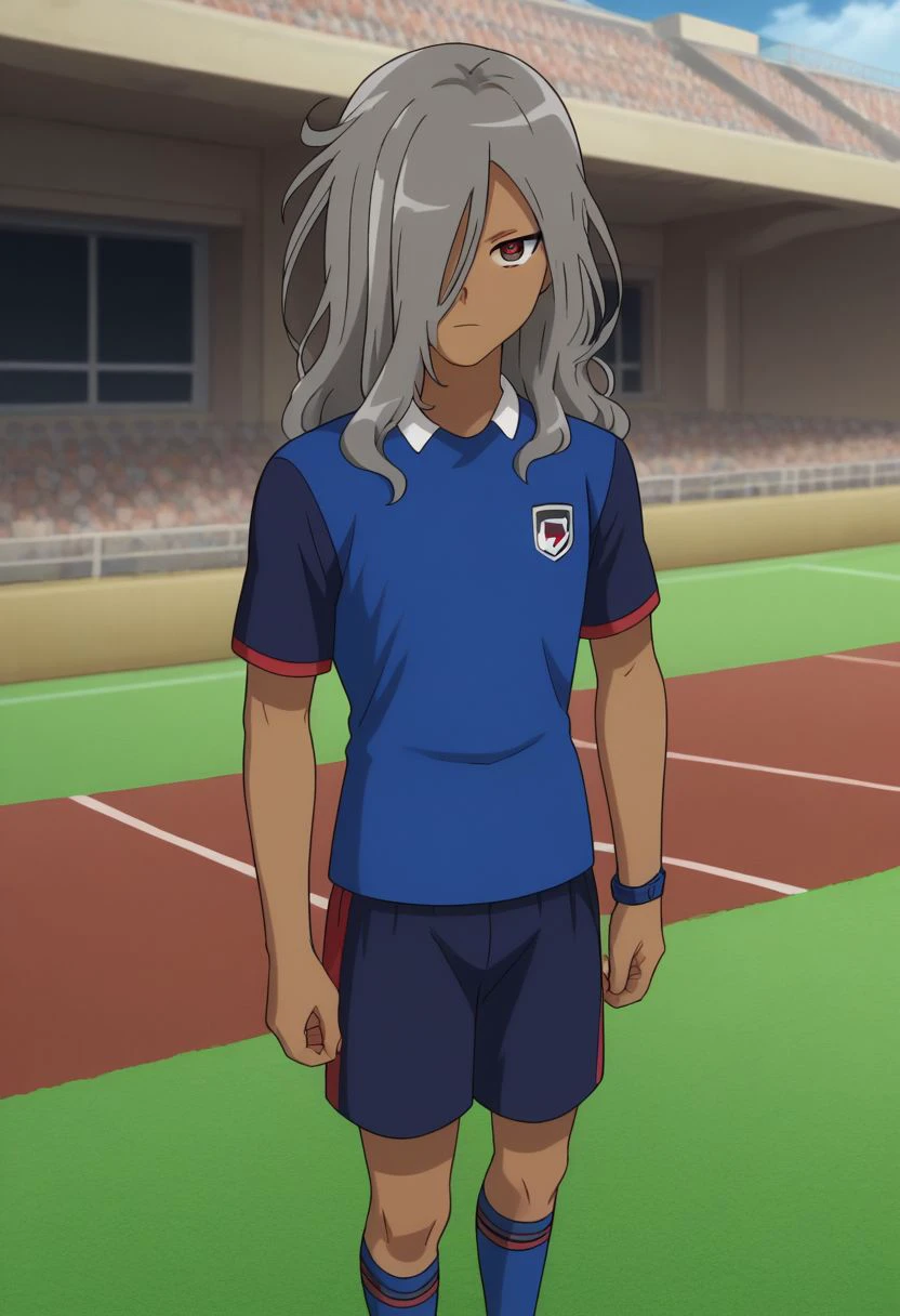 HaizakiRyouhei, 1boy, male focus, solo, dark skin, dark-skinned male, red eyes, grey hair, long hair, hair over one eye, orion soccer uniform, shirt, blue shirt, popped collar, raglan sleeves, short sleeves, shorts, blue shorts, socks, blue socks, shoes, sneakers,