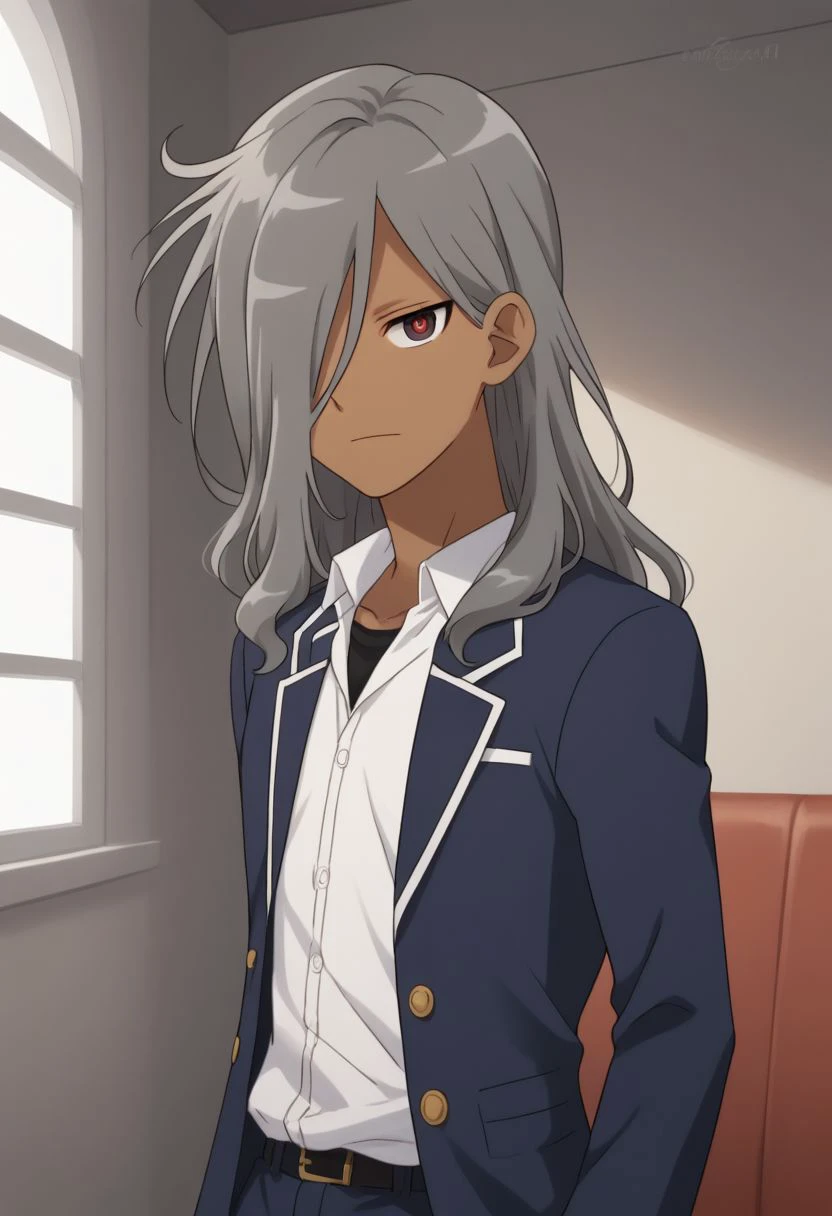 HaizakiRyouhei, 1boy, male focus, solo, dark skin, dark-skinned male, red eyes, grey hair, long hair, hair over one eye, school uniform, black undershirt, white shirt, collared shirt, necktie, blue necktie, jacket, grey jacket, open jacket,