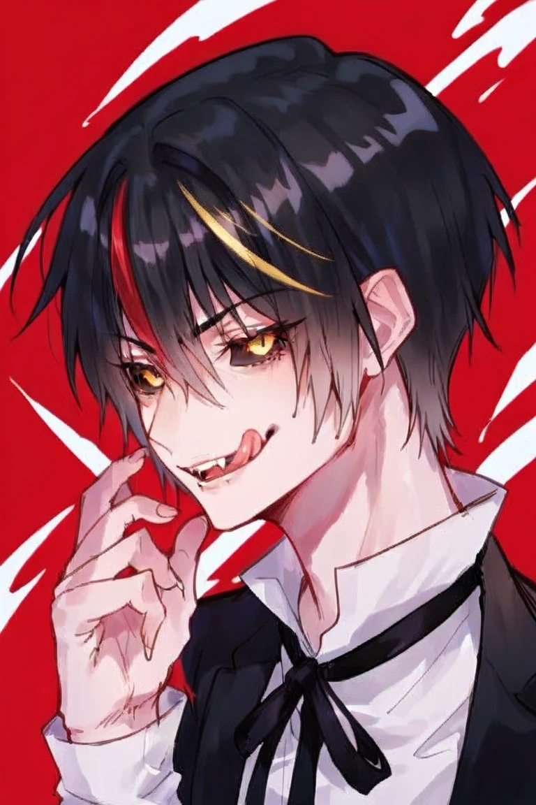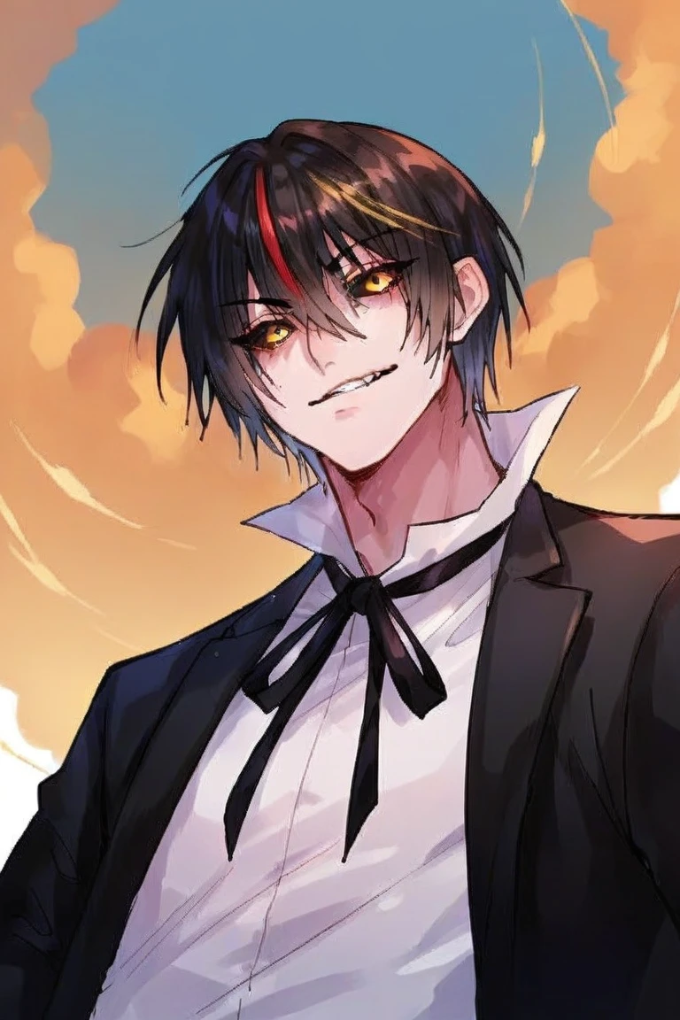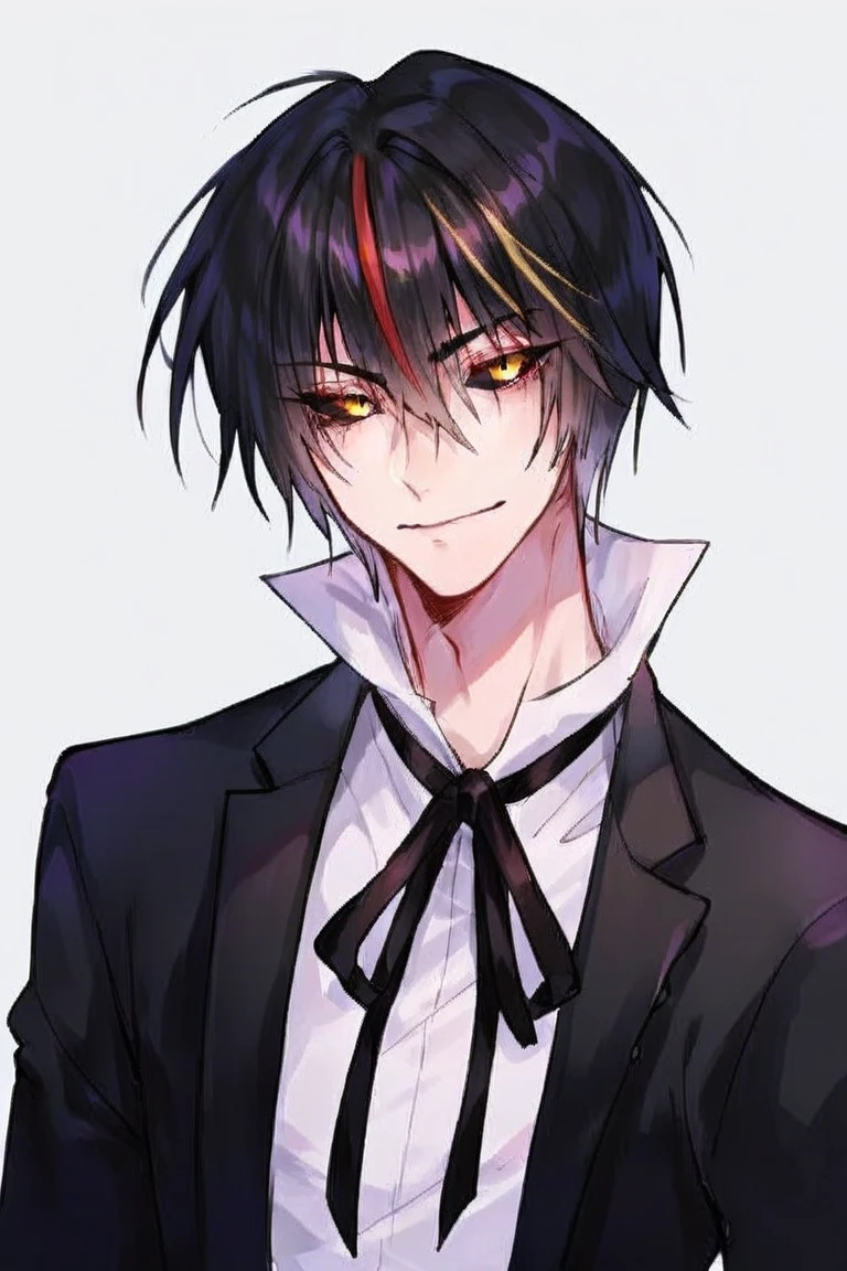 diablo,streaked hair,black hair,yellow eyes,black sclera,white shirt,black ribbon,black coat,black pants