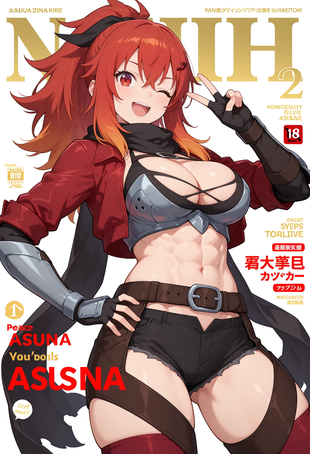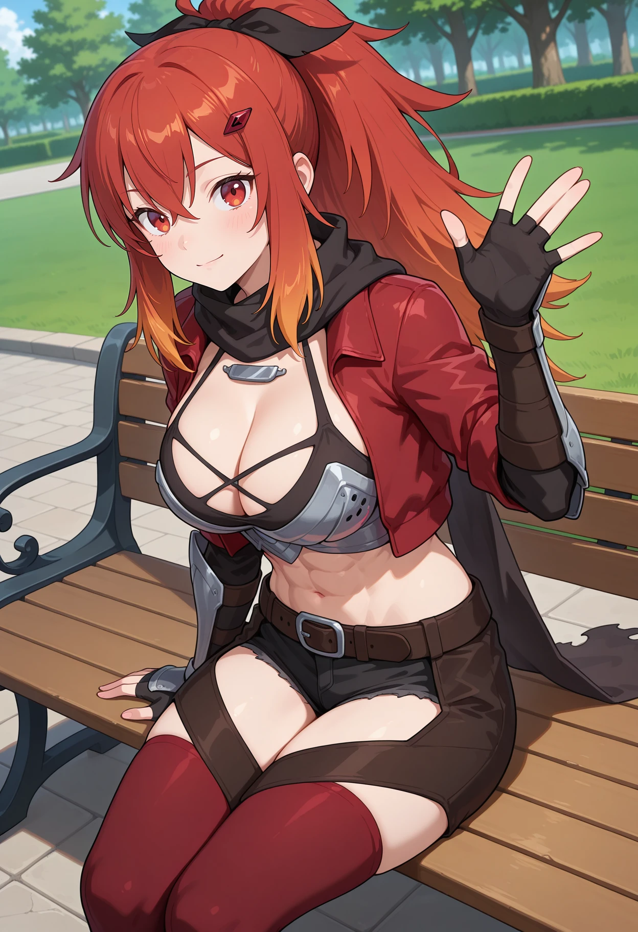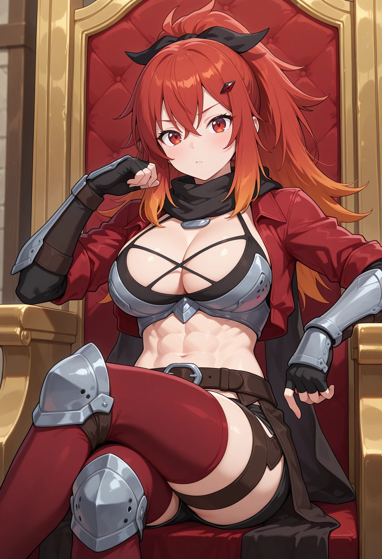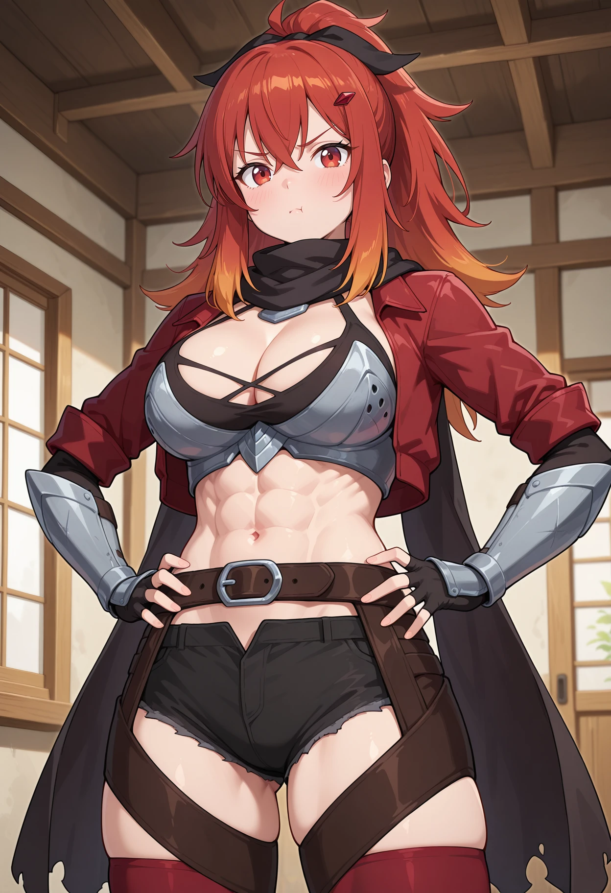 aasurena, long hair, red hair, ponytail, hair ribbon, hair ornament, red eyes, long scarf, black scarf, armor, crop top, boobplate, cropped jacket, red jacket, arm guards, fingerless gloves, black gloves, abs, belt, chaps, black shorts, red thighhighs