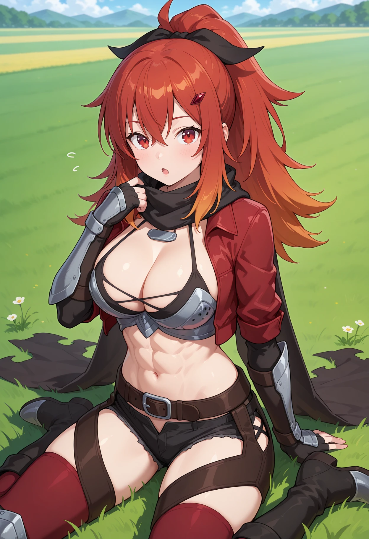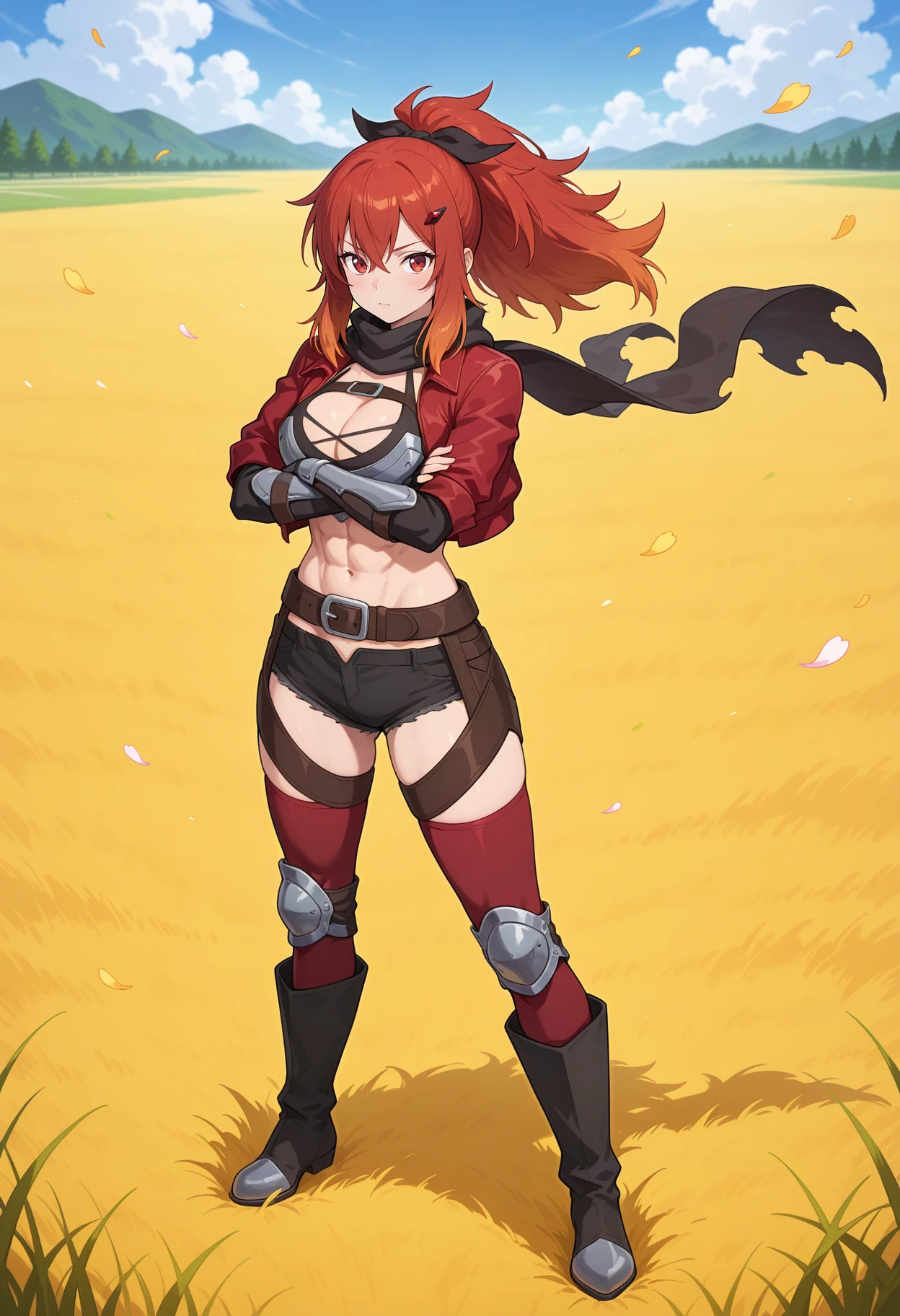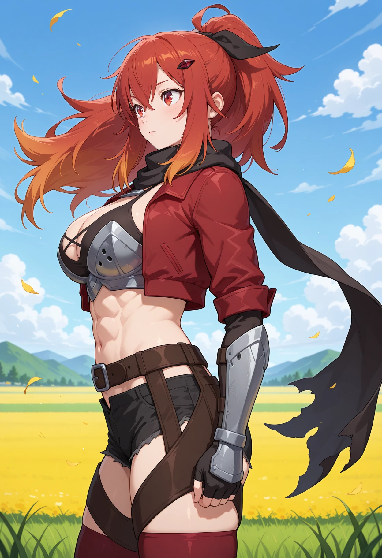 outfit1aasurena, long hair, red hair, ponytail, hair ribbon, hair ornament, red eyes, long scarf, black scarf, armor, crop top, boobplate, cropped jacket, red jacket, arm guards, fingerless gloves, black gloves, abs, belt, chaps, black shorts, red thighhighs