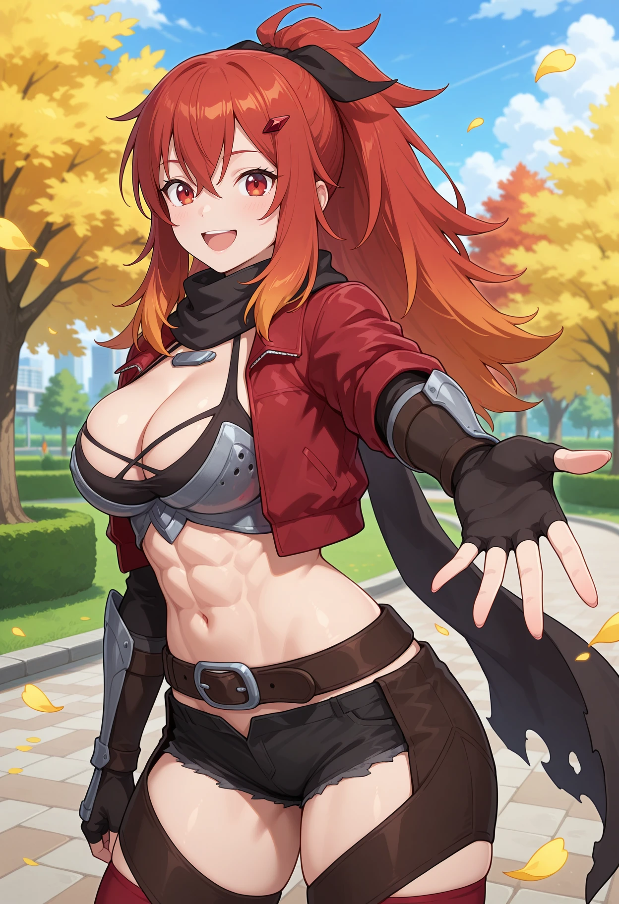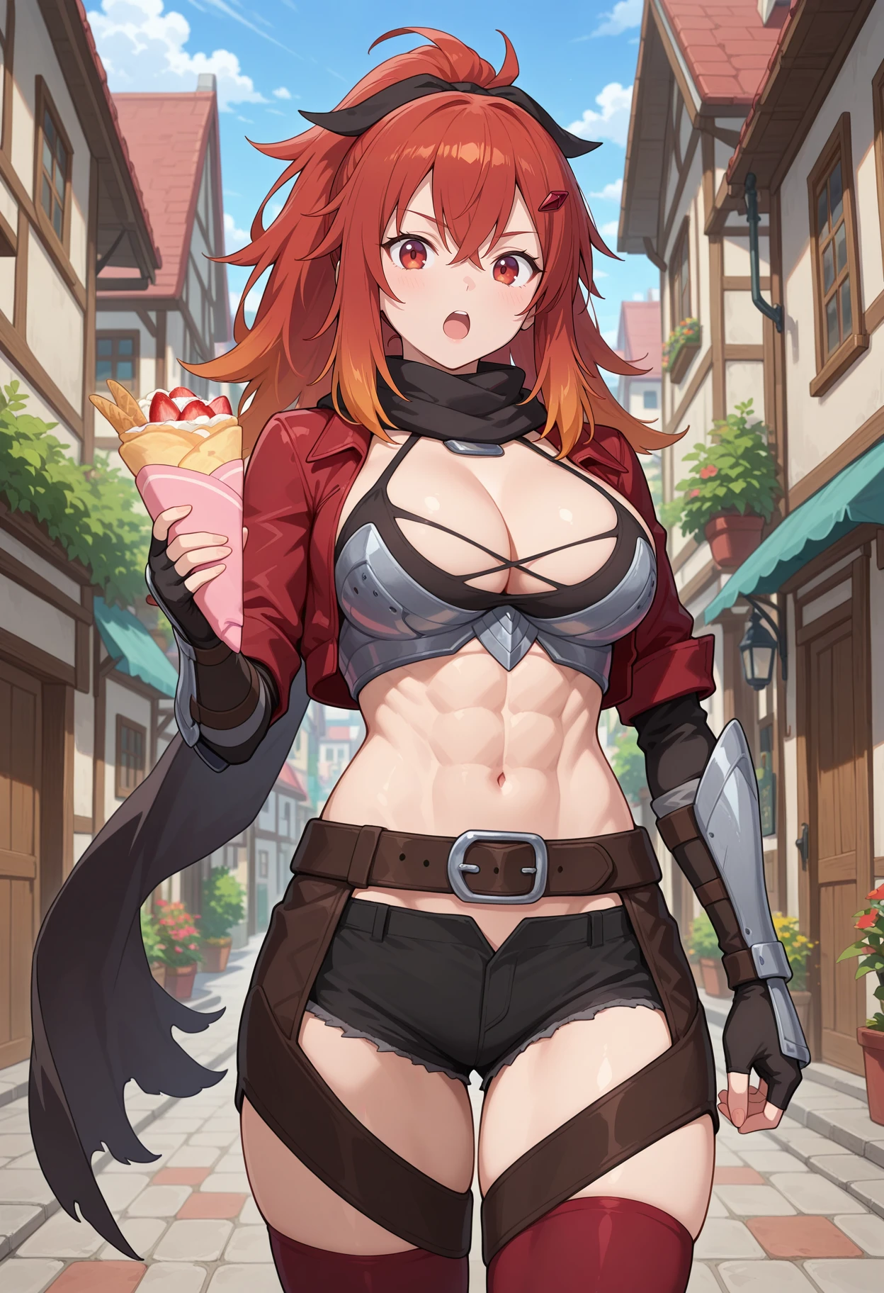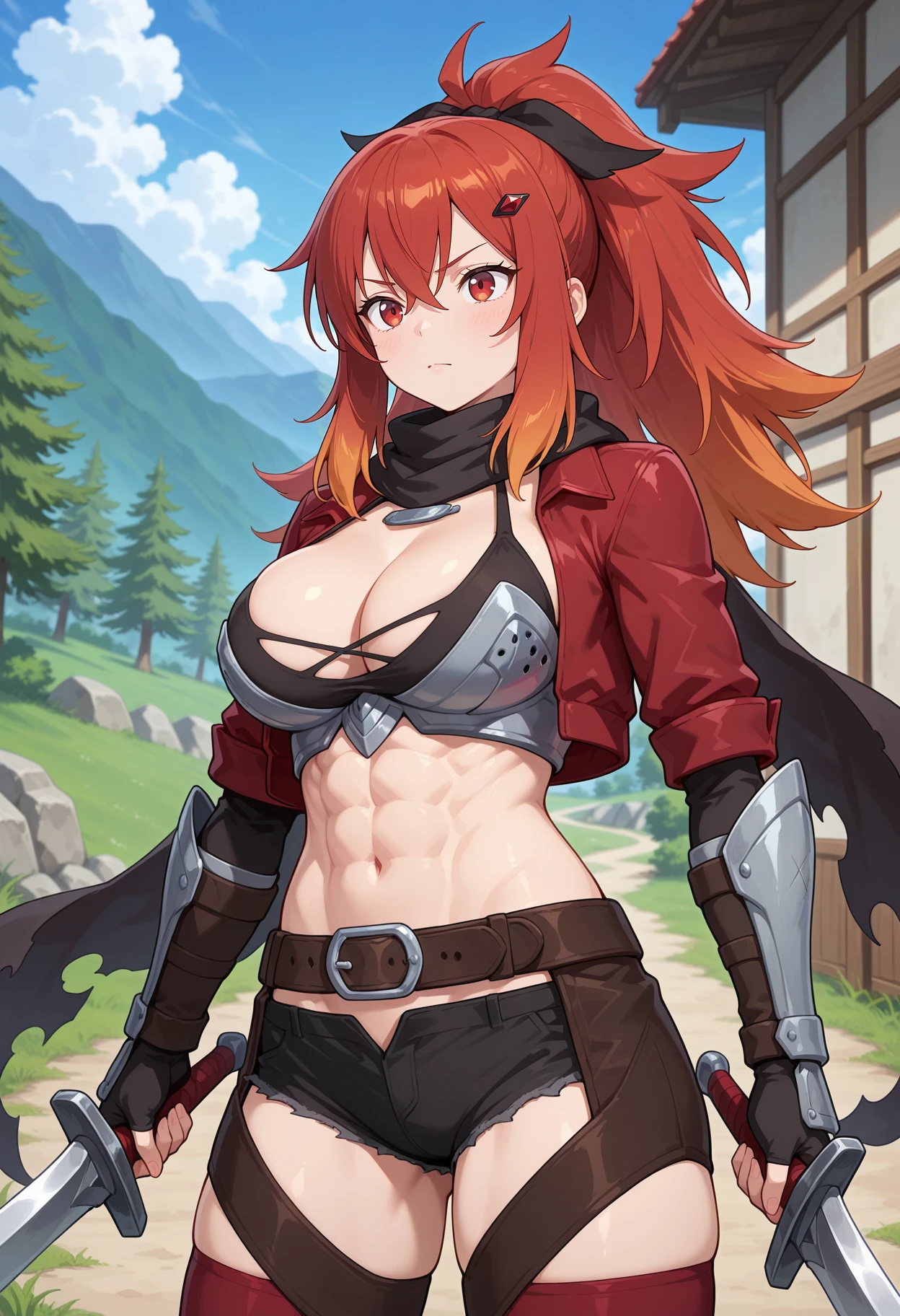 outfit1aasurena, long hair, red hair, ponytail, hair ribbon, hair ornament, red eyes, long scarf, black scarf, armor, crop top, boobplate, cropped jacket, red jacket, arm guards, fingerless gloves, black gloves, abs, belt, chaps, black shorts, red thighhighs