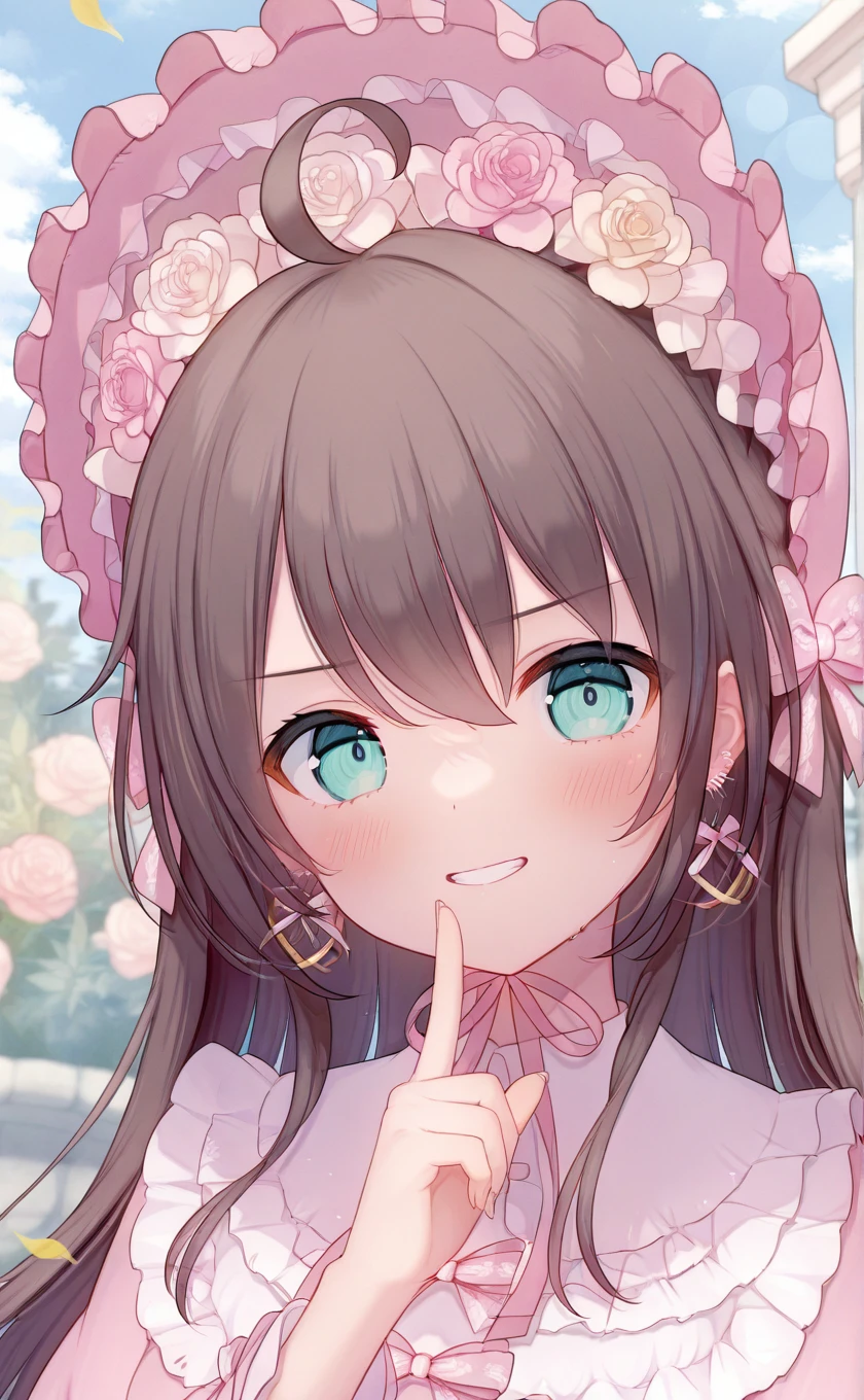 bonnet,pink headwear,ahoge,long hair,brown hair,hair bow,pink bow,hair flower,pink rose,earrings,sidelocks,hair between eyes,aqua eyes