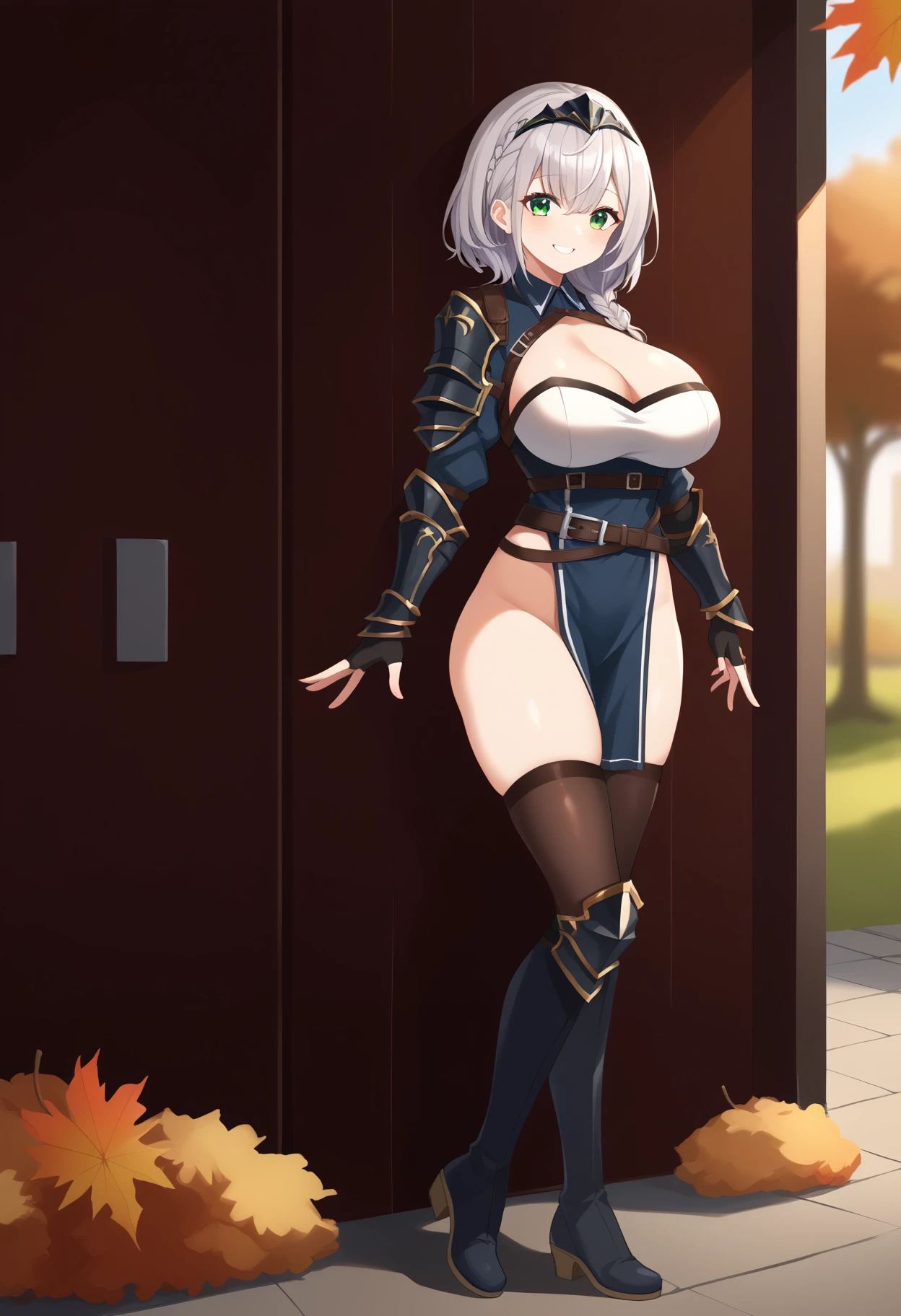>shirogane noel, shirogane noel \(1st costume\), hololive, 1girl, breasts, bangs, large breasts, thighhighs, gloves, cleavage, hair between eyes, green eyes, braid, grey hair, boots, black gloves, belt, black thighhighs, fingerless gloves, medium hair, armor, mole, wavy hair, shoulder armor, pelvic curtain, mole on breast, chest belt
