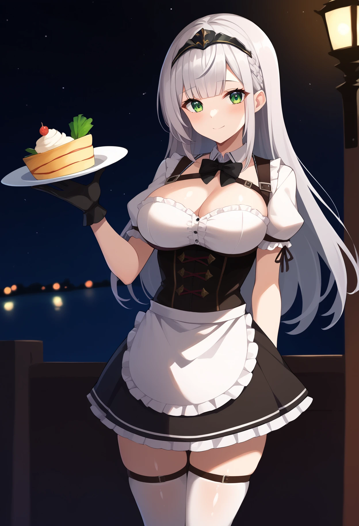 >shirogane noel, shirogane noel \(dirndl\), hololive, 1girl, long hair, breasts, bangs, skirt, hair ornament, thighhighs, gloves, bow, holding, cleavage, very long hair, green eyes, short sleeves, grey hair, frills, detached sleeves, apron, white thighhighs, puffy short sleeves, black bow, thigh strap, frilled skirt, waist apron, white apron, frilled apron, black bowtie,